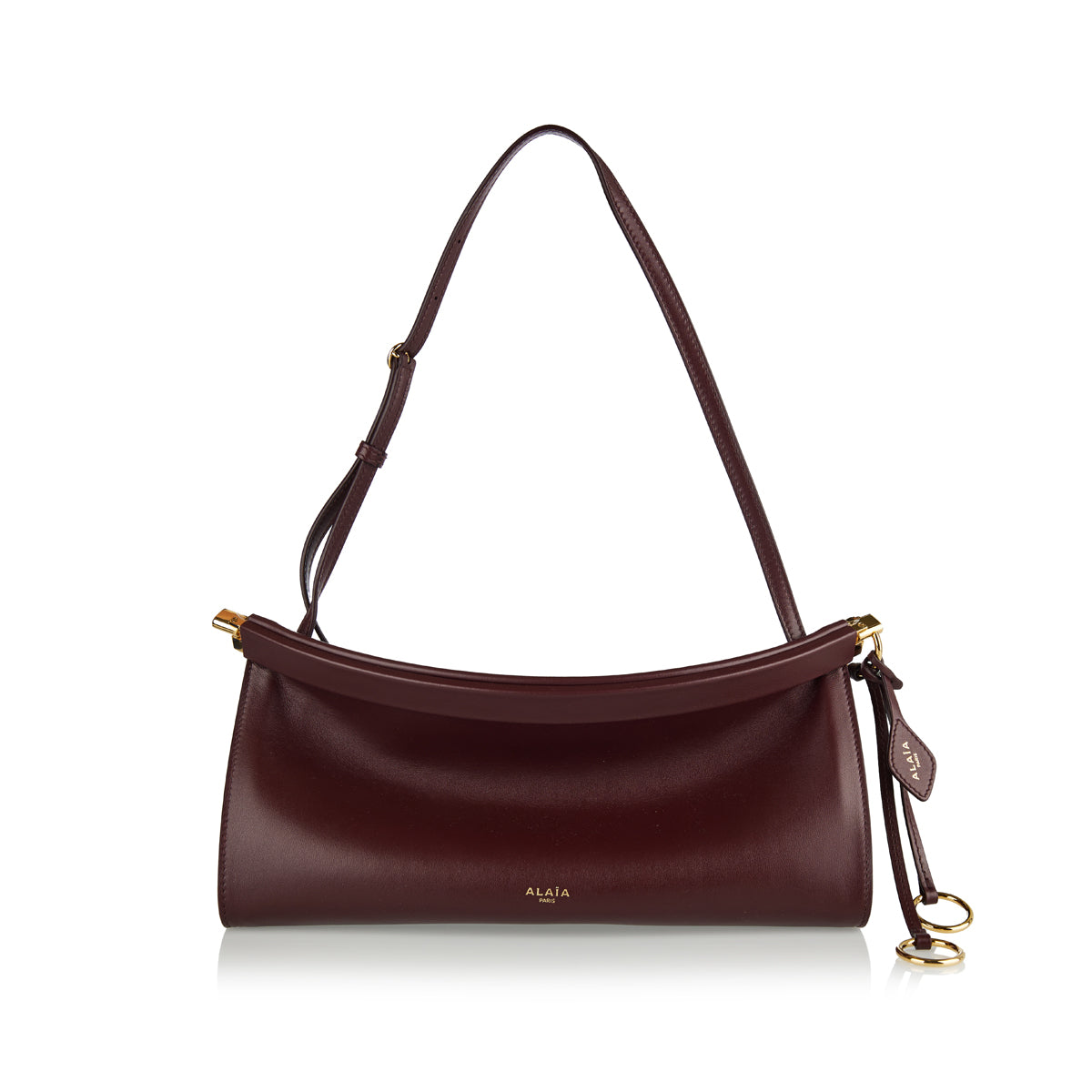 Alaïa’s Le Click East West Medium Bag in glossy calfskin evokes sculptural elegance with its curved silhouette, leather-wrapped hinge opening, and architectural bottom folds. Handcrafted in Italy, it features metallic ring-tied details and an adjustable strap for effortless shoulder or crossbody wear. A statement of refined sensuality, designed to move with you.