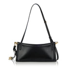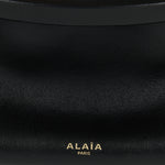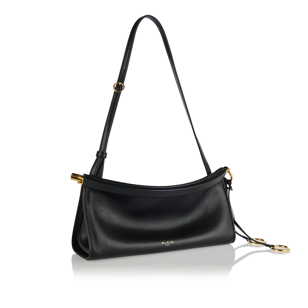 Elevate your ensemble with the ALAÏA Le Click East West Small Bag in glossy black calfskin. Expertly crafted in Italy, this sculptural piece features a curved silhouette that hugs the body, a leather-wrapped hinge opening, and signature folding details. Adorned with decorative ties and metallic rings, it offers versatile wear as a shoulder or waist bag with its adjustable strap.