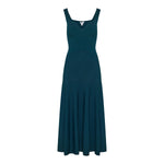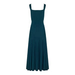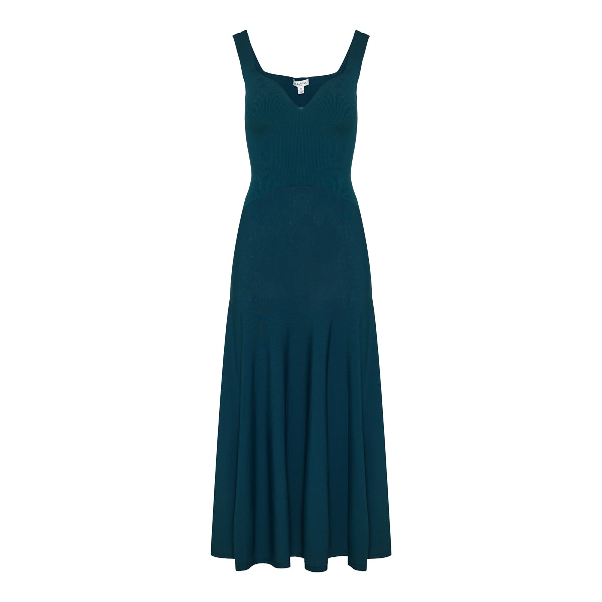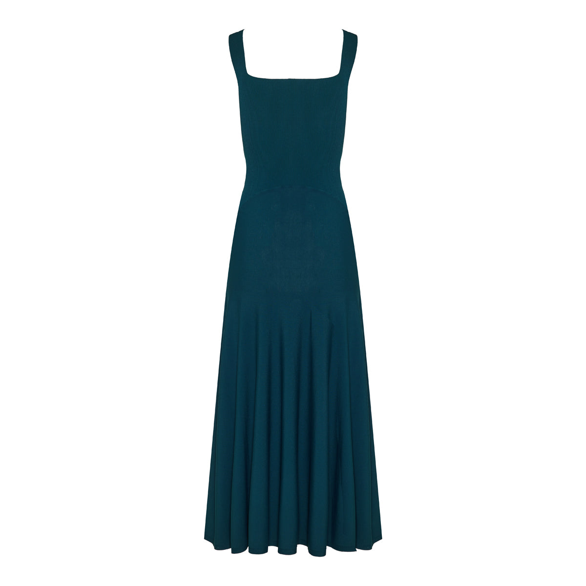 A sculpting rib-knit midi dress designed to accentuate the silhouette from torso to hem. The sleeveless bodice fits close to the body, while the flared skirt falls with soft movement, blending refined tailoring with fluid elegance. Ideal for polished daytime looks or elevated evening wear — a timeless piece that pairs effortlessly with heels or tailored outerwear.