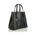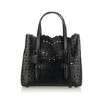 Sculpted from leather in a small silhouette, the Mina bag in black has a laser-cut design patterned with the label's Vague Vienne lace-like motif. It features top handles, folded sides, protective metal feet and removable strap. The interior is equipped with a detachable zipper pouch.