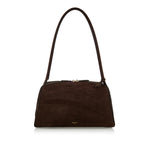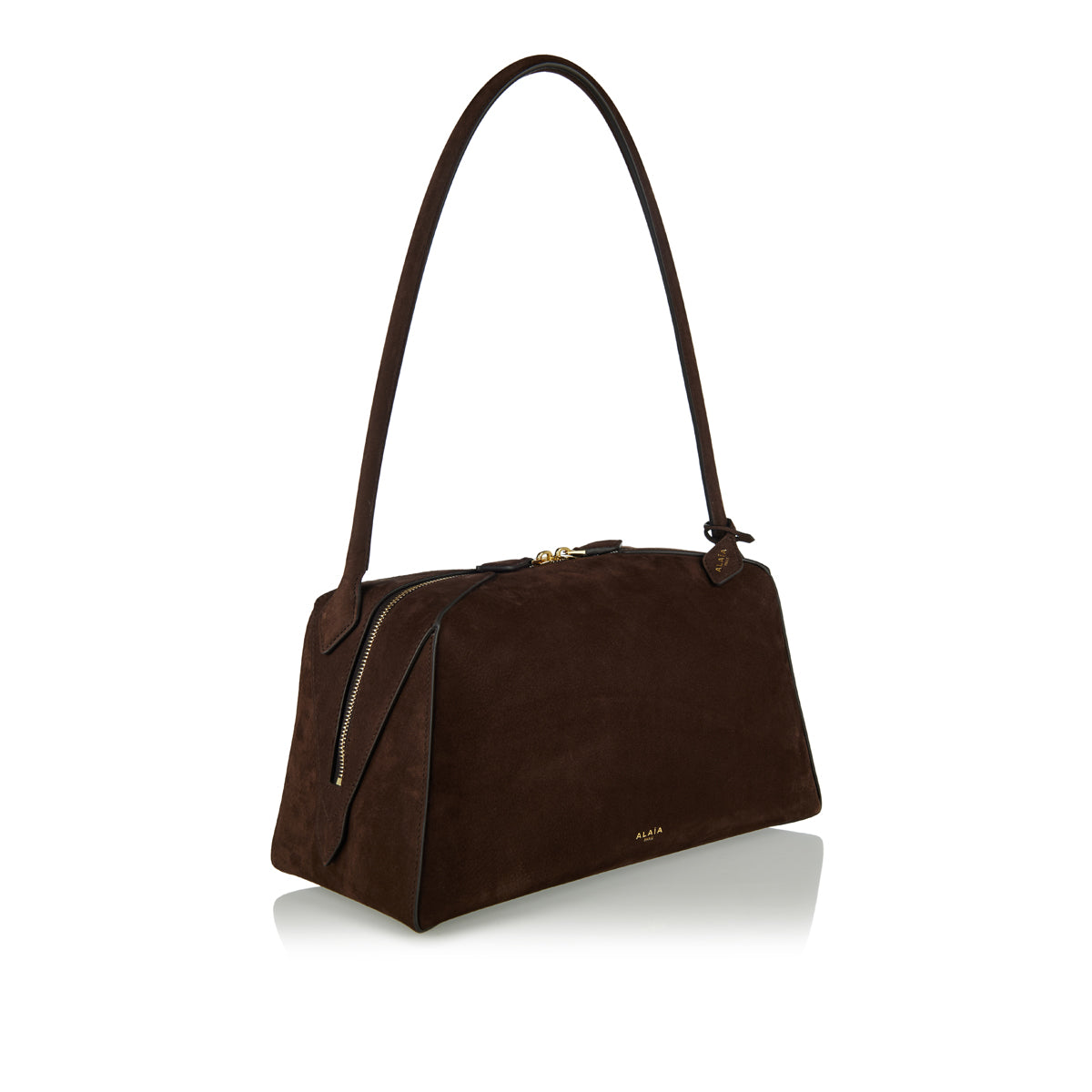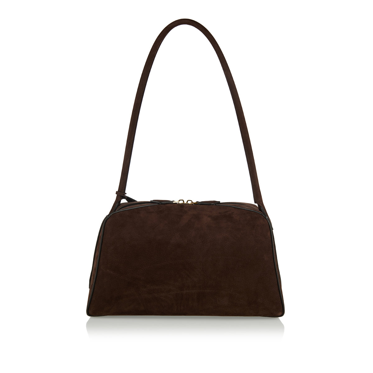 A sculptural shoulder bag in soft nubuck calfskin with a structured yet relaxed profile. Its vintage‑inspired bowling‑bag shape, elongated straps, and gold‑tone hardware give it a refined, modern‑luxury character. Fully lined with internal slip pockets and secure top zip closure, it’s ideal for polished daywear or minimalist evening outfits, seamlessly combining sophistication with practicality.