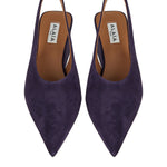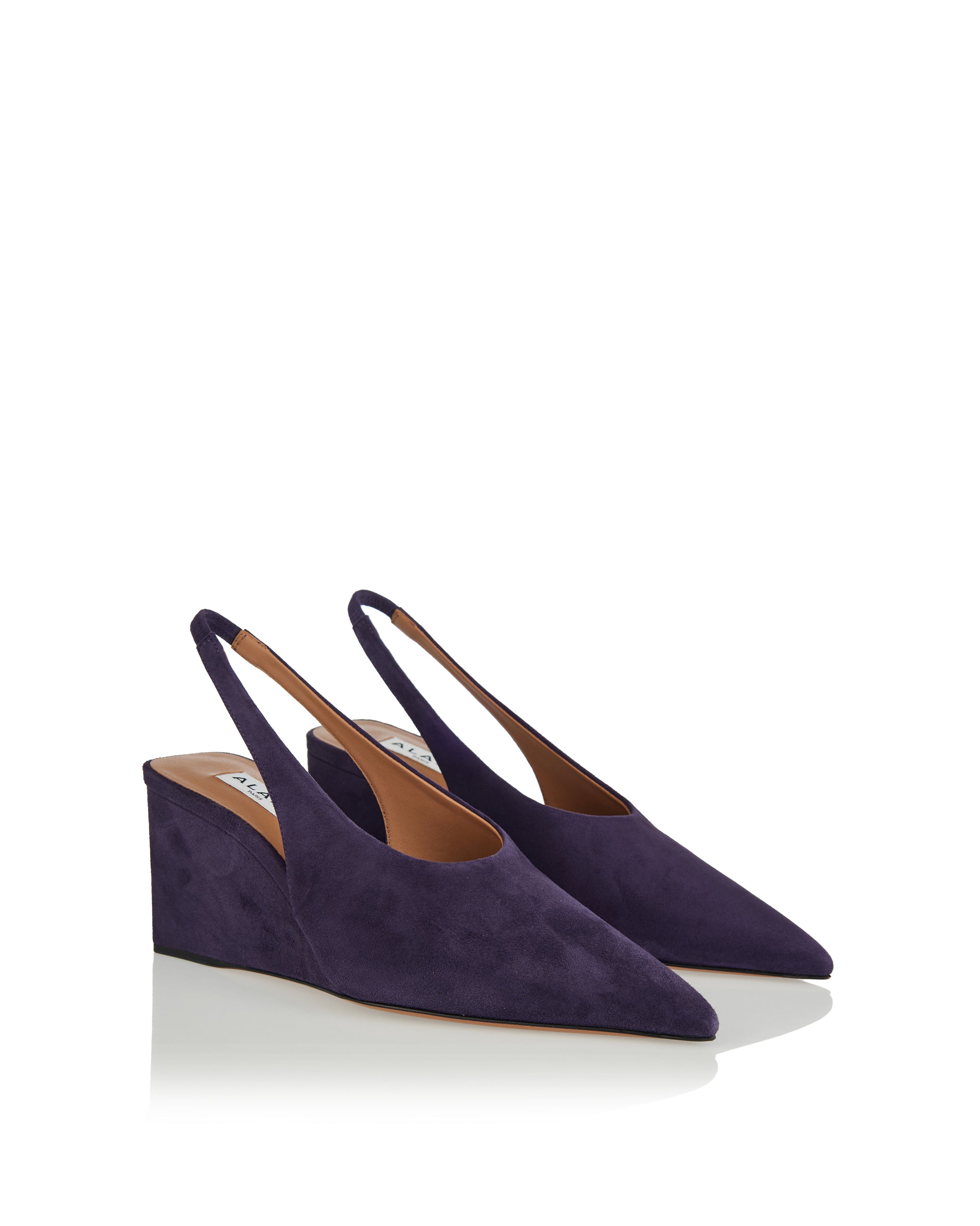 The ALAÏA cube wedge mules in suede offer architectural elegance with pointed toes and distinctive cubic wedge heels measuring approximately 75mm, crafted for refined yet versatile wear. Perfect for elevated casual or formal ensembles, they combine soft goat suede with supple lambskin lining and premium leather-and-rubber soles for a luxurious, contemporary finish.