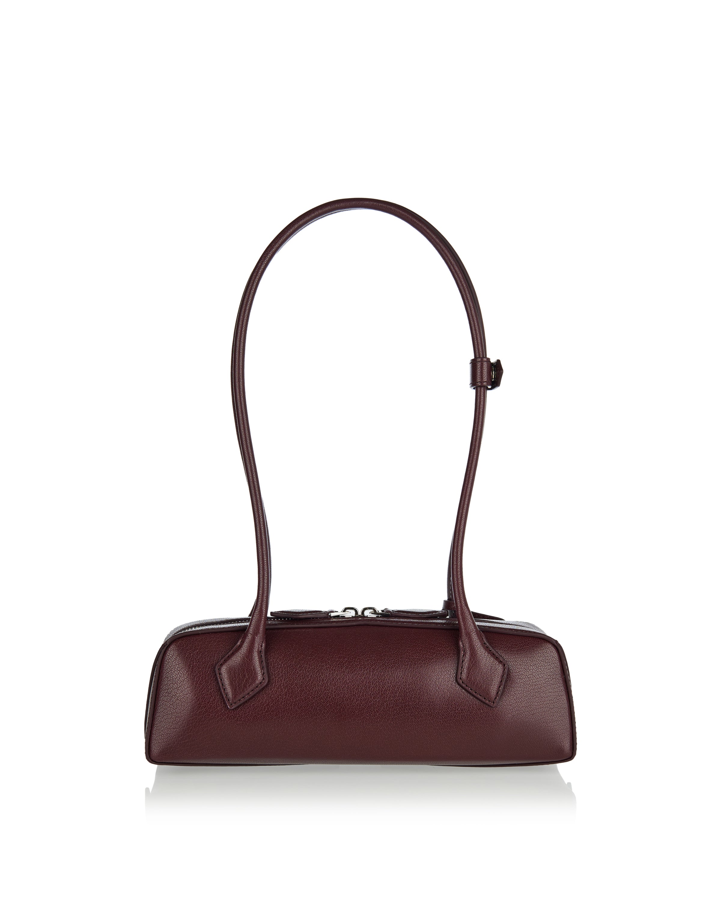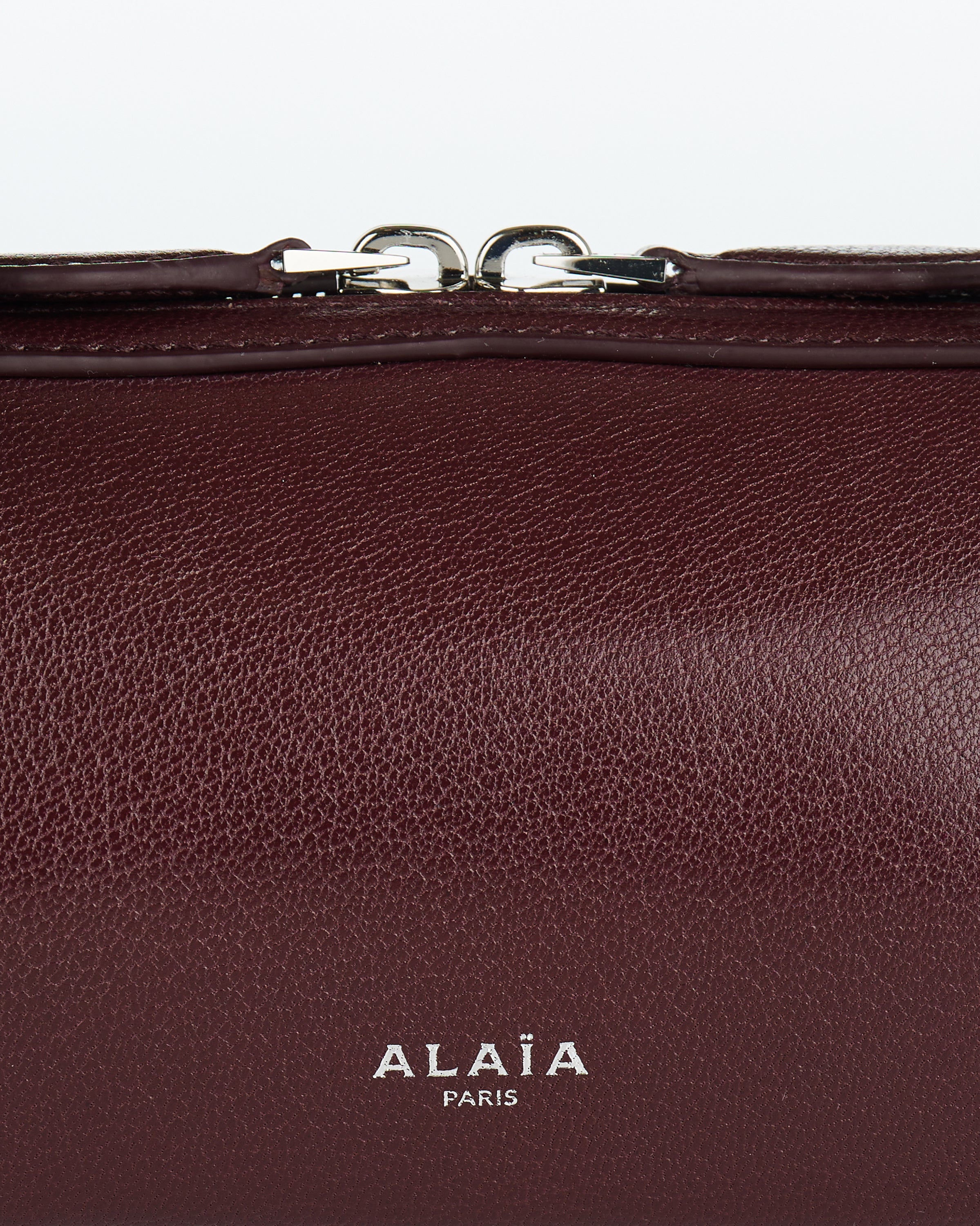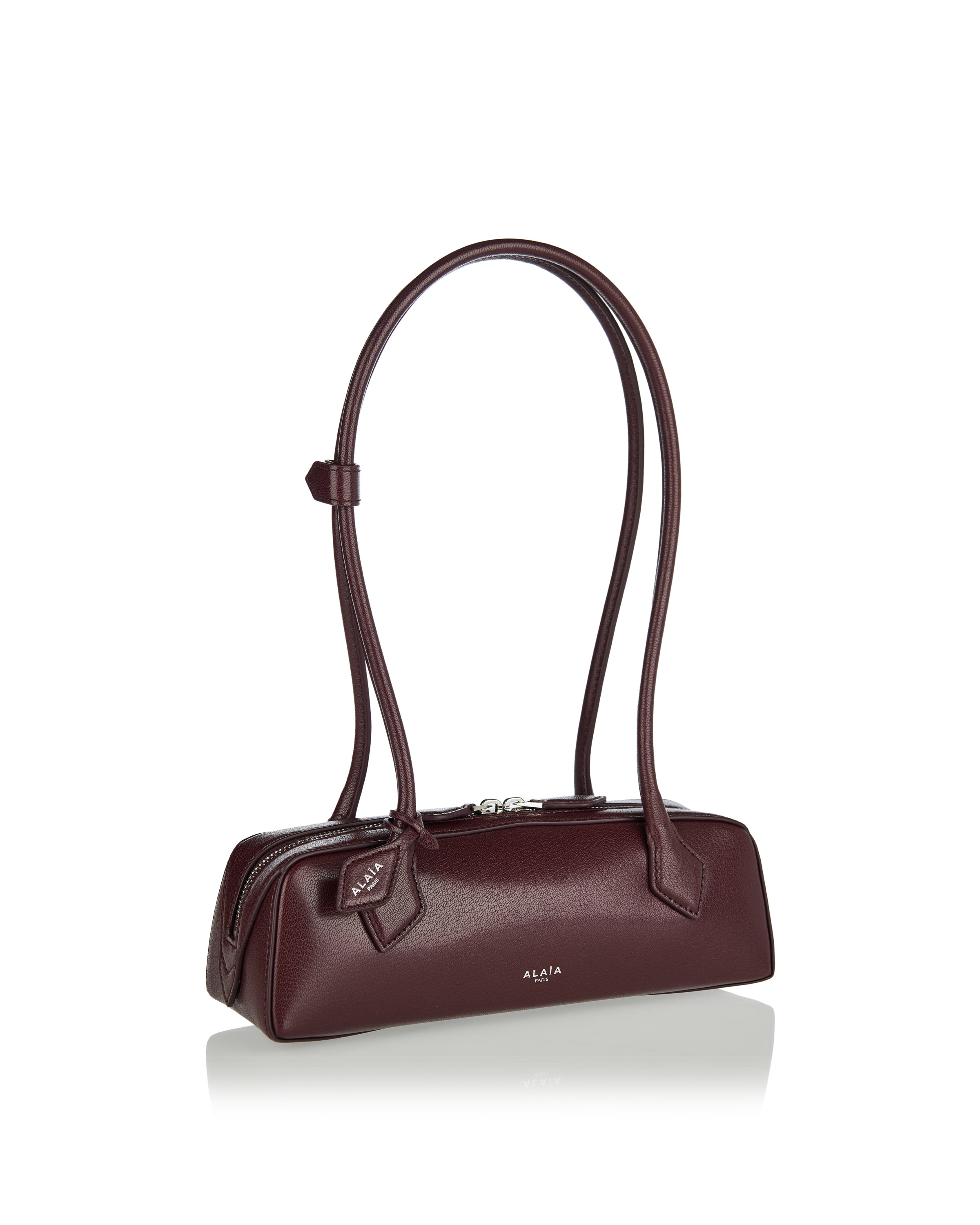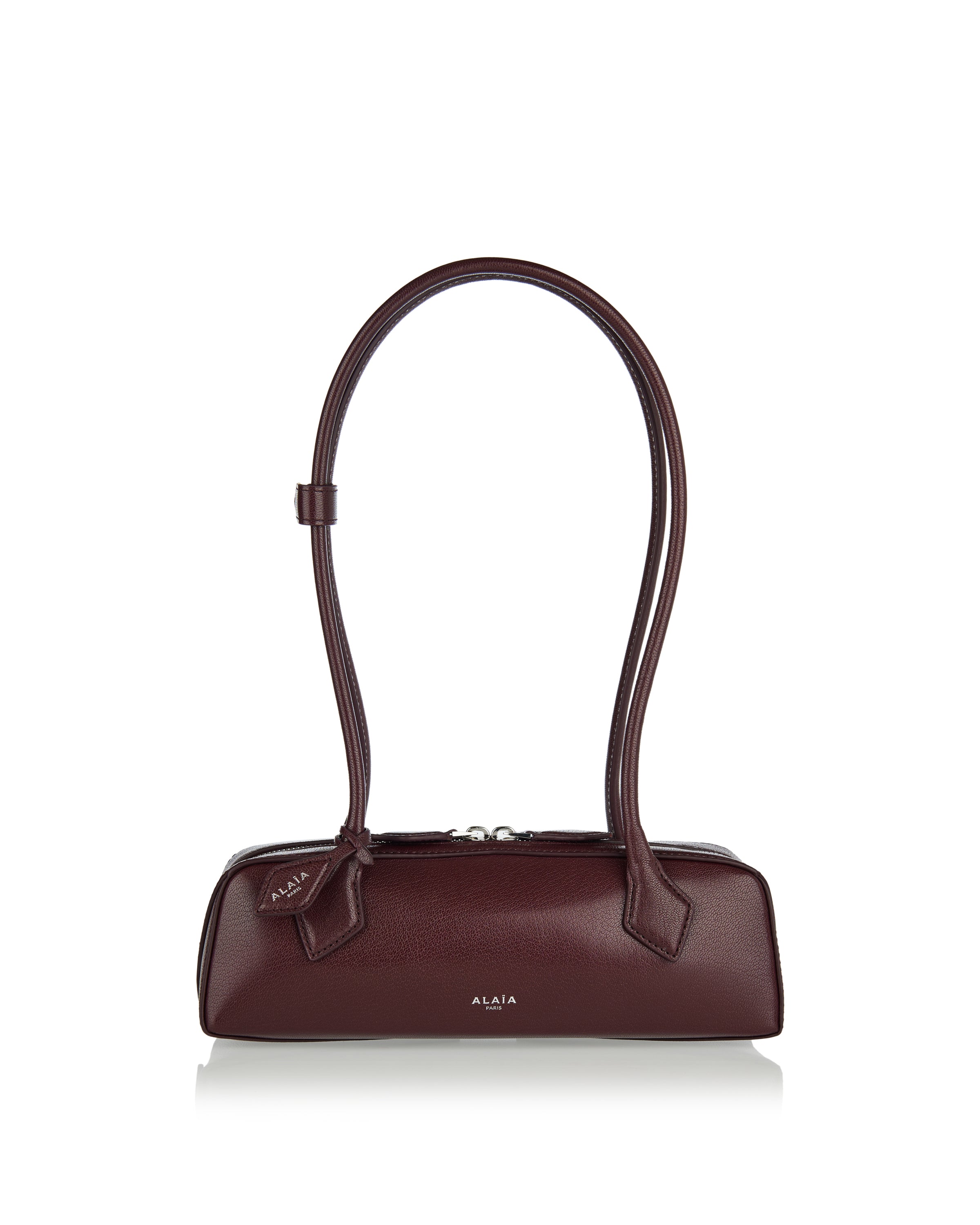 The ALAÏA le teckel small bag in goatskin presents a refined elongated silhouette with tubular top handles and decorative ties, a double zip closure and a small removable mirror inside the interior pocket. Crafted with meticulous Italian expertise, this elegant piece enhances both casual and formal ensembles with its distinctive shape and luxurious finish.