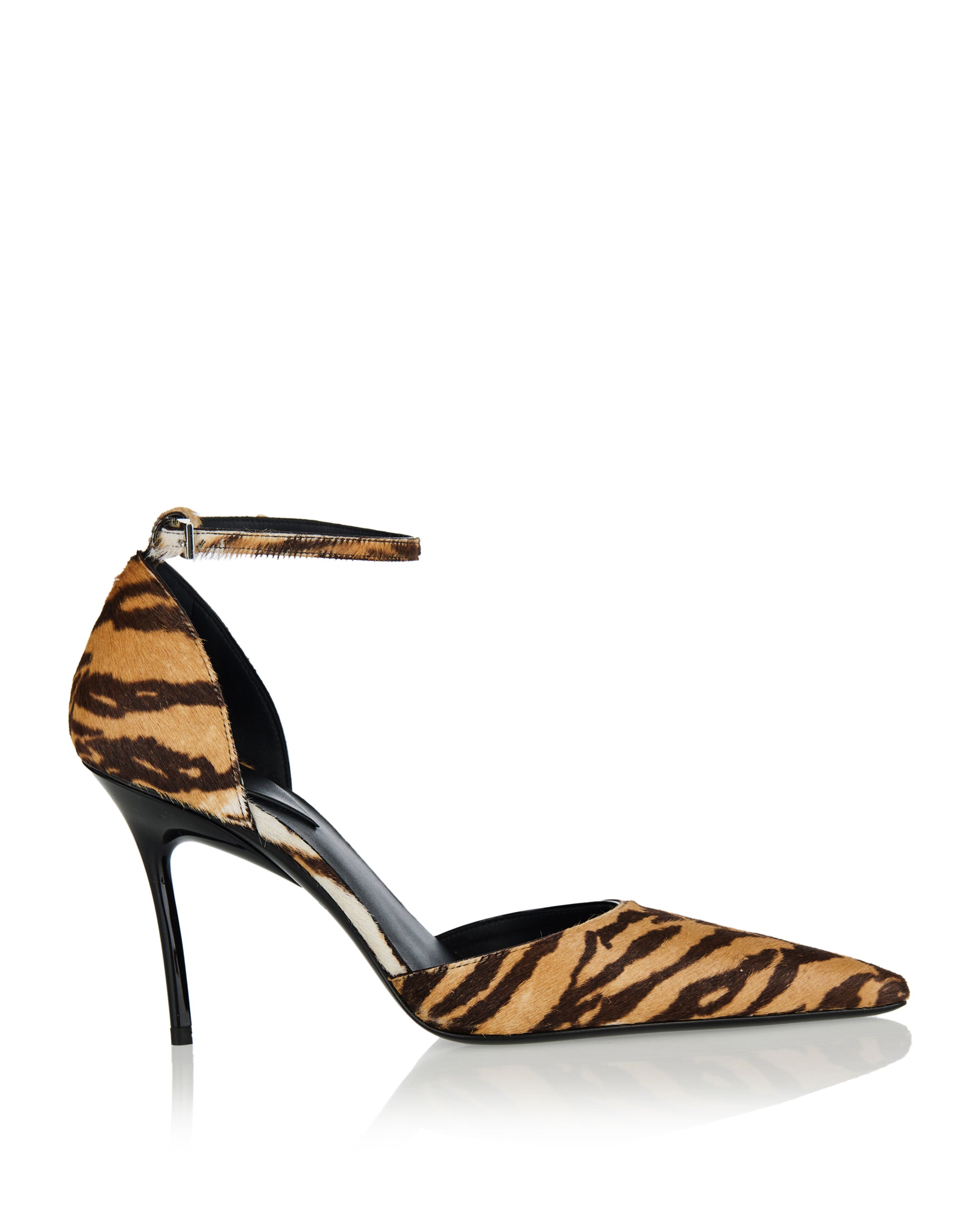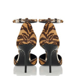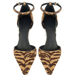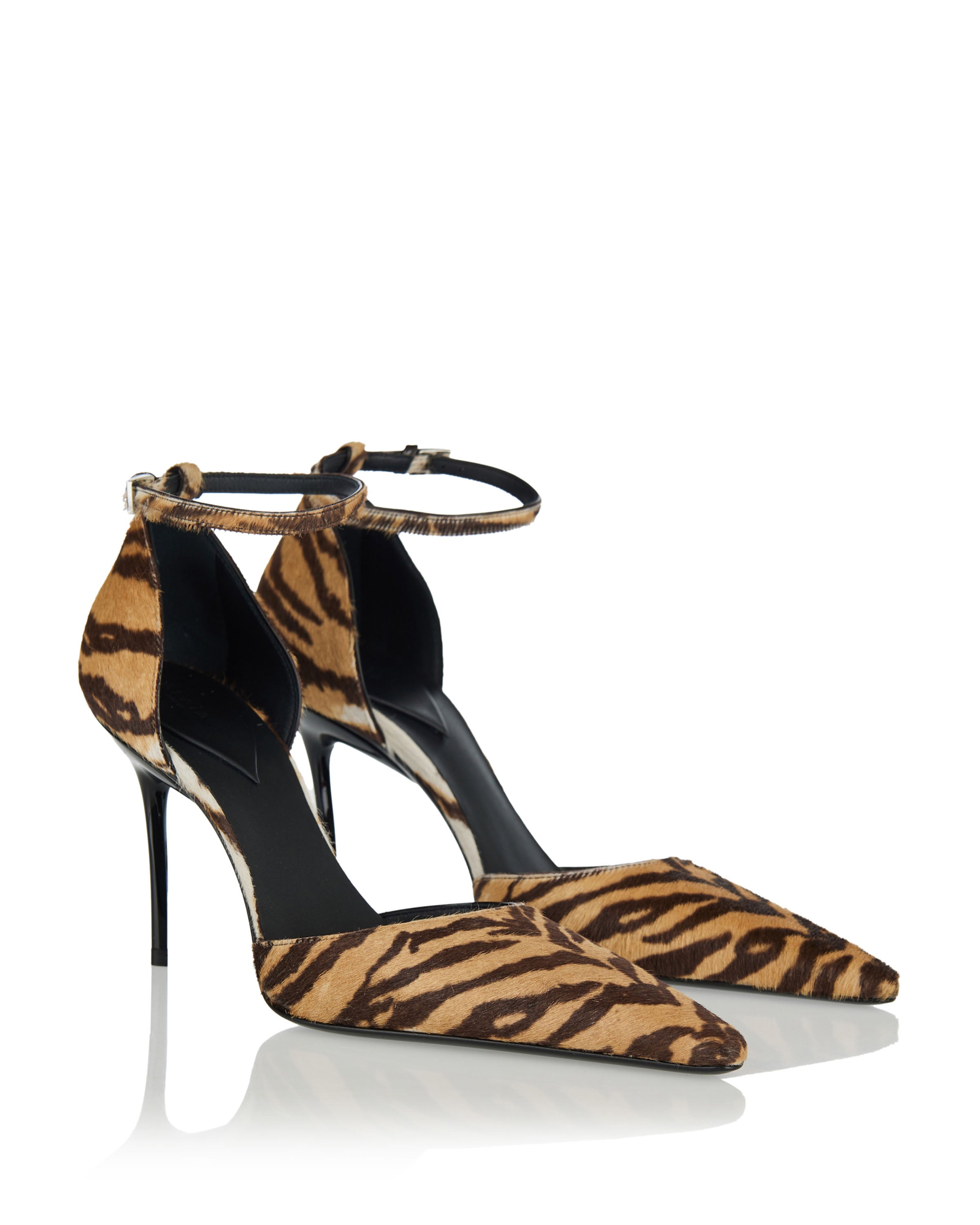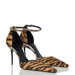 Statement D’Orsay pumps crafted in tiger-print calf hair, set on a dramatic stiletto heel for a bold yet refined silhouette.