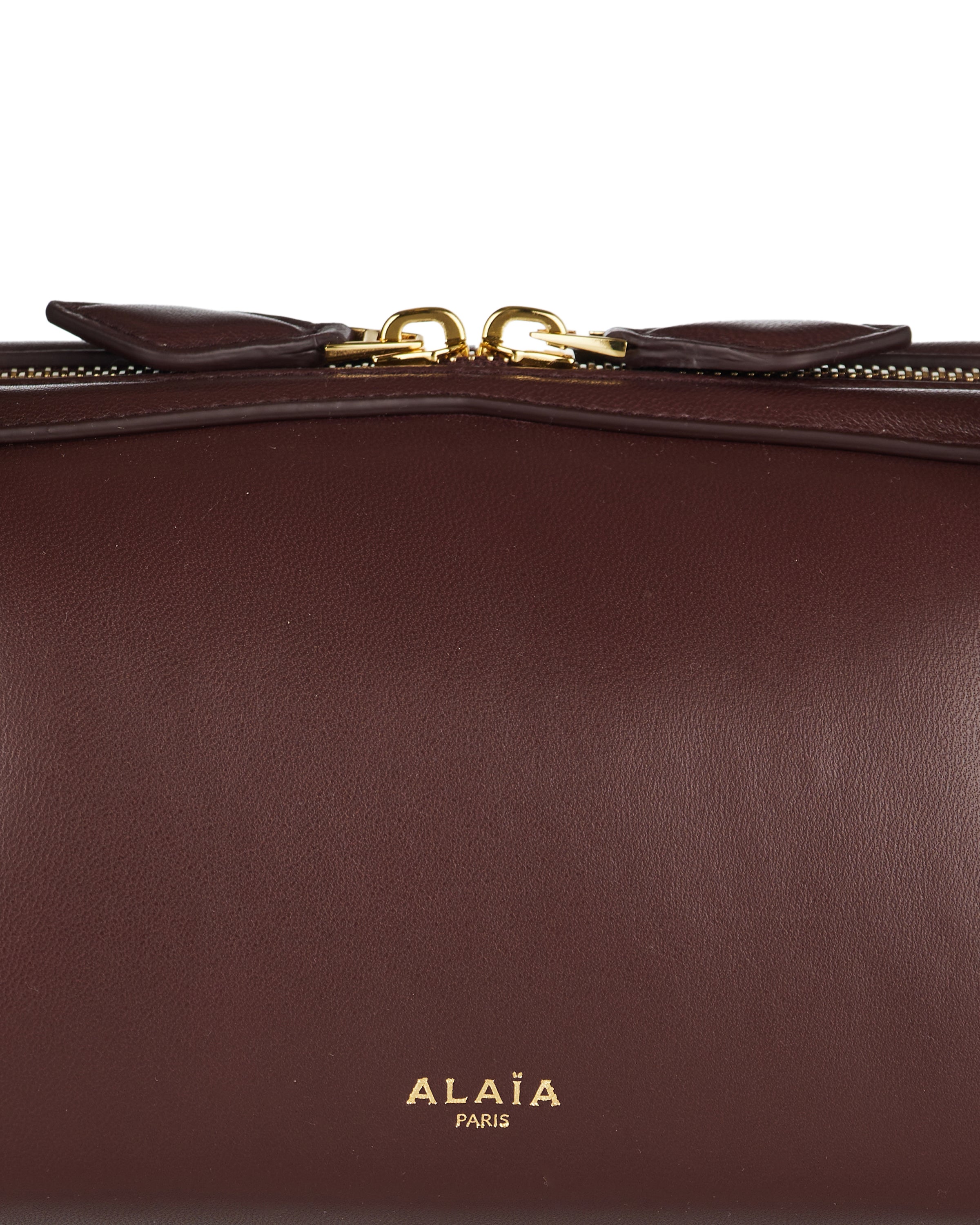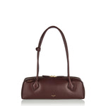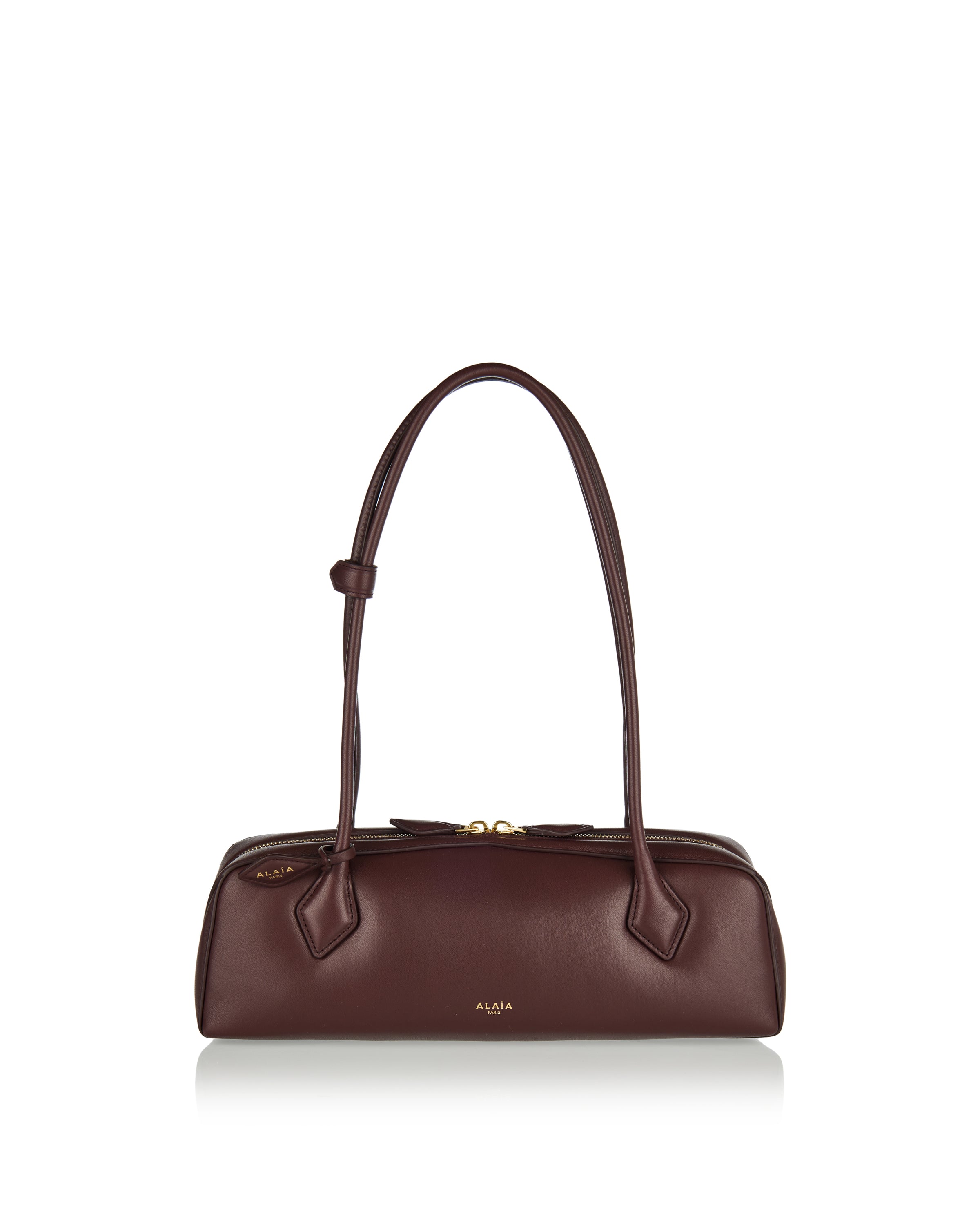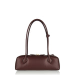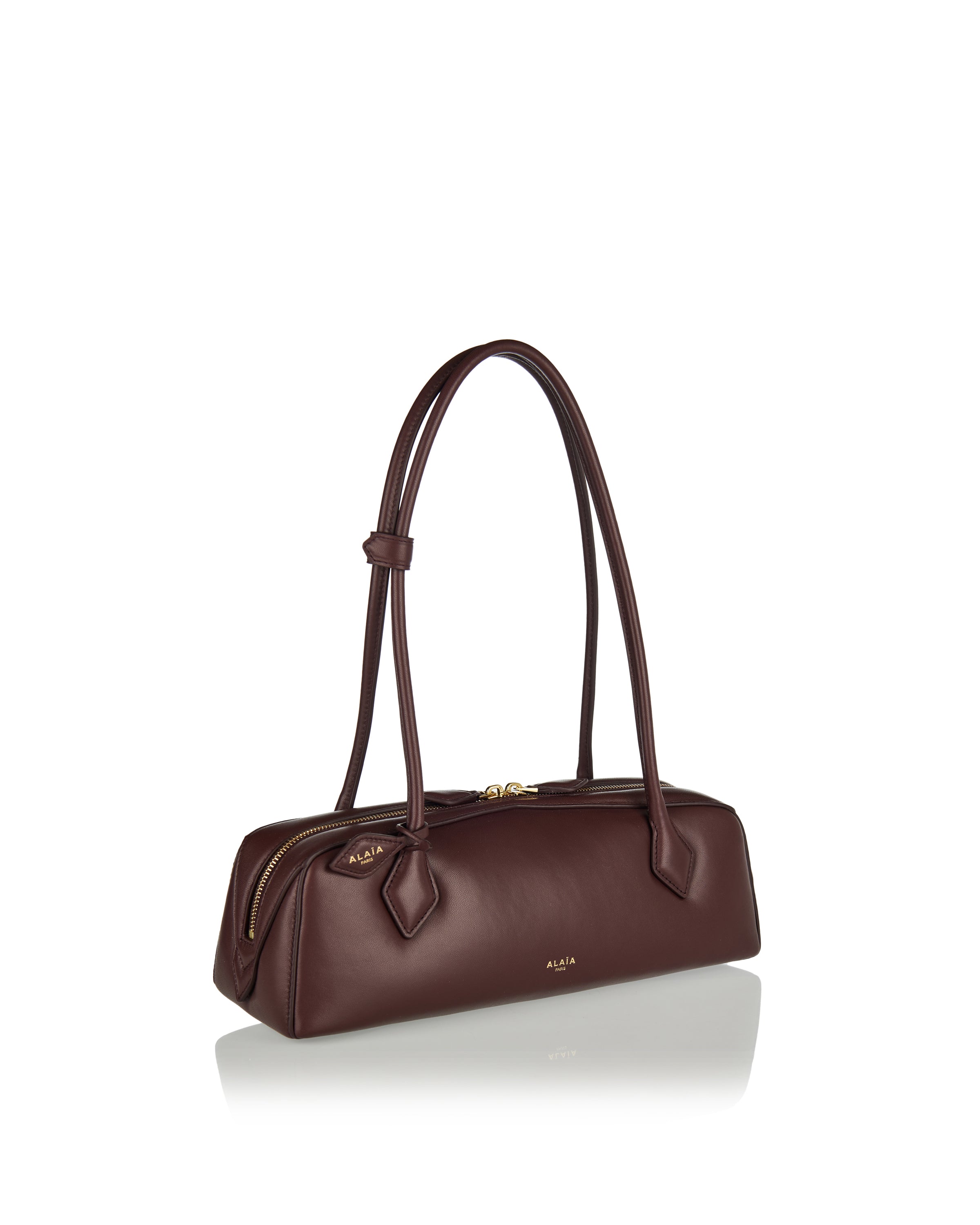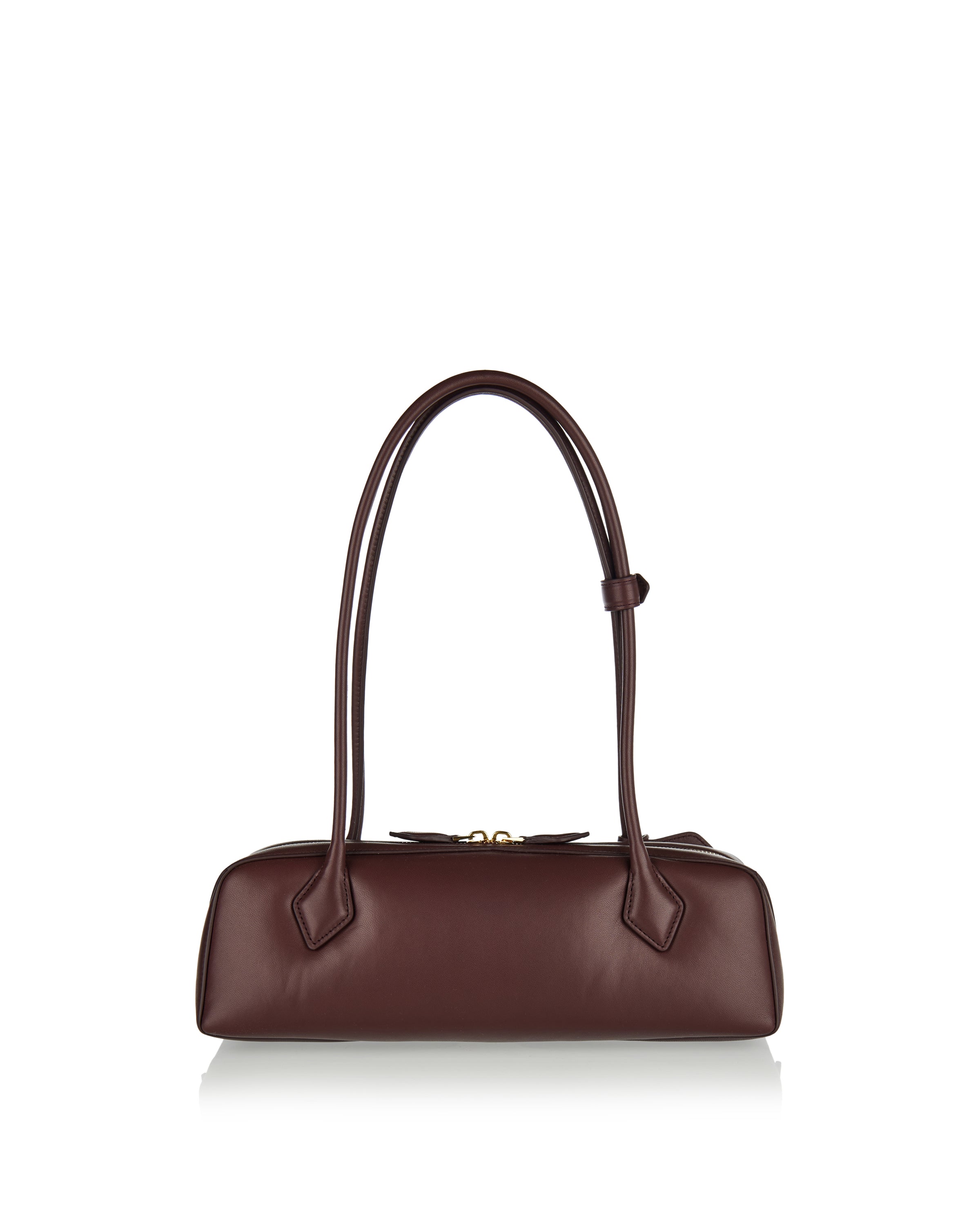 A sculptural, elongated shoulder bag crafted from padded nappa lambskin leather with tubular handles and decorative ties. Featuring a double-zip closure, internal pocket with removable mirror and refined Italian craftsmanship, this elegant silhouette brings architectural flair to refined everyday and elevated evening wardrobes.