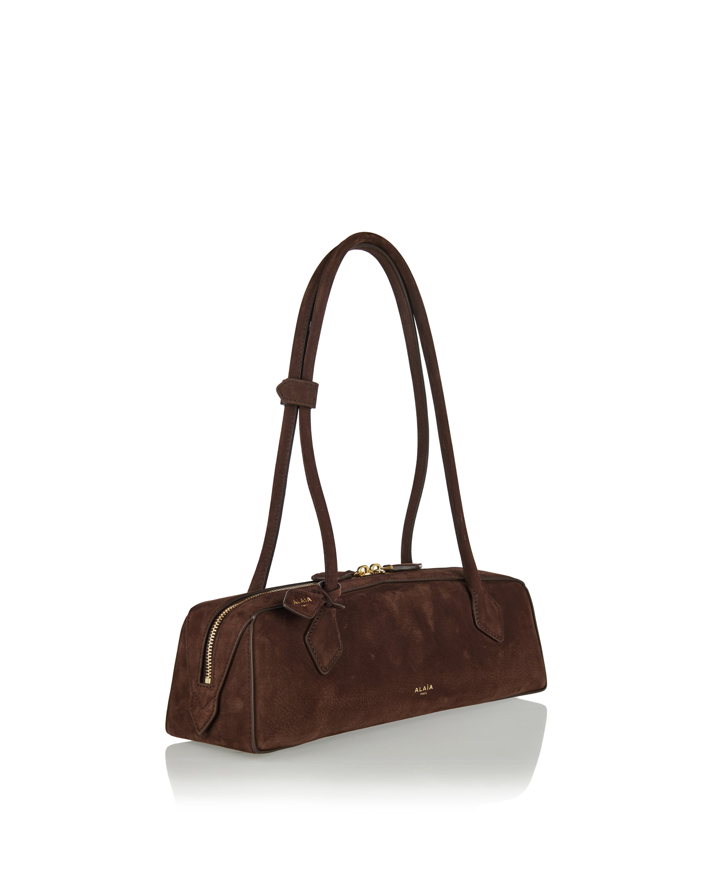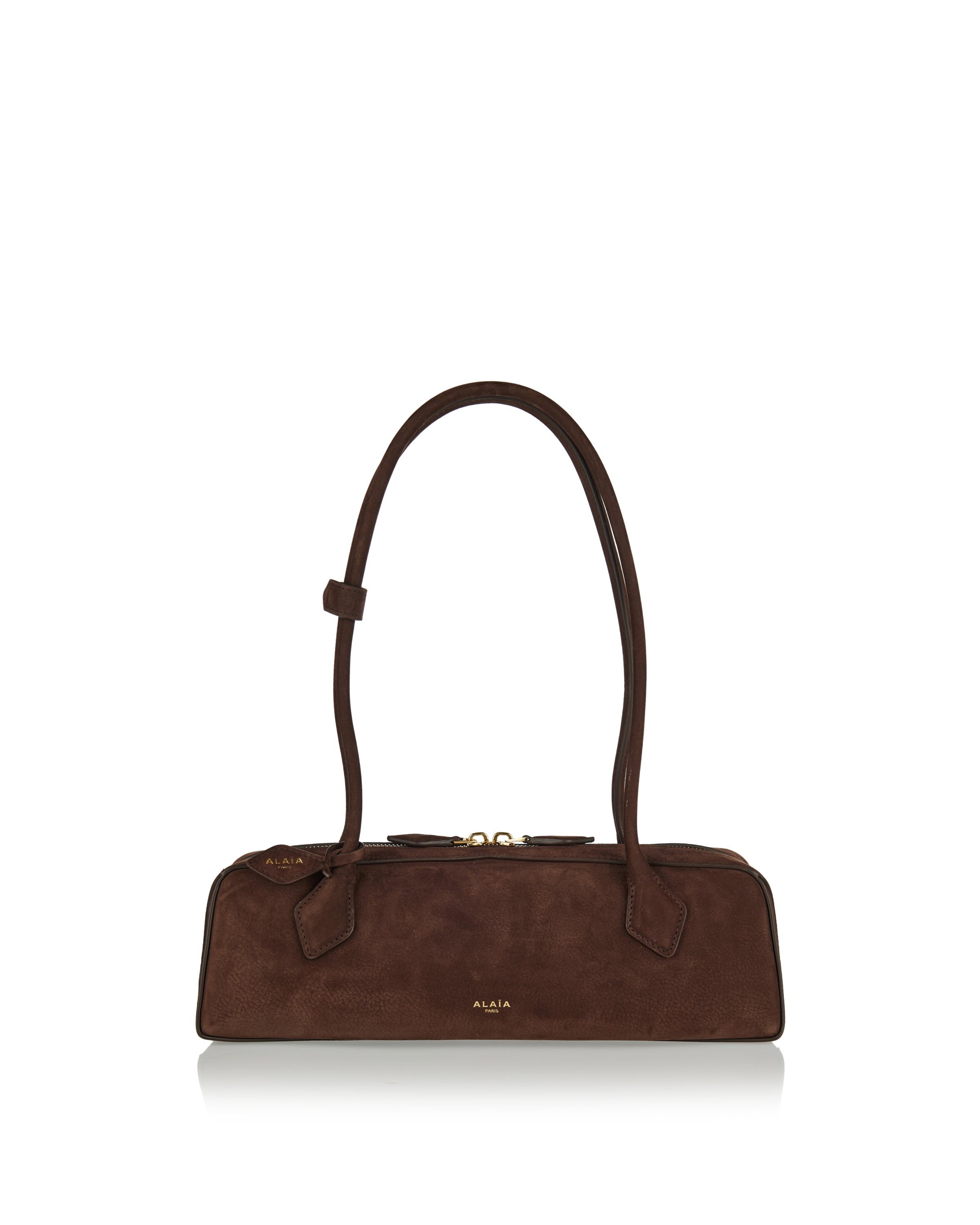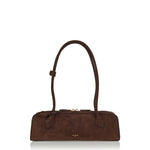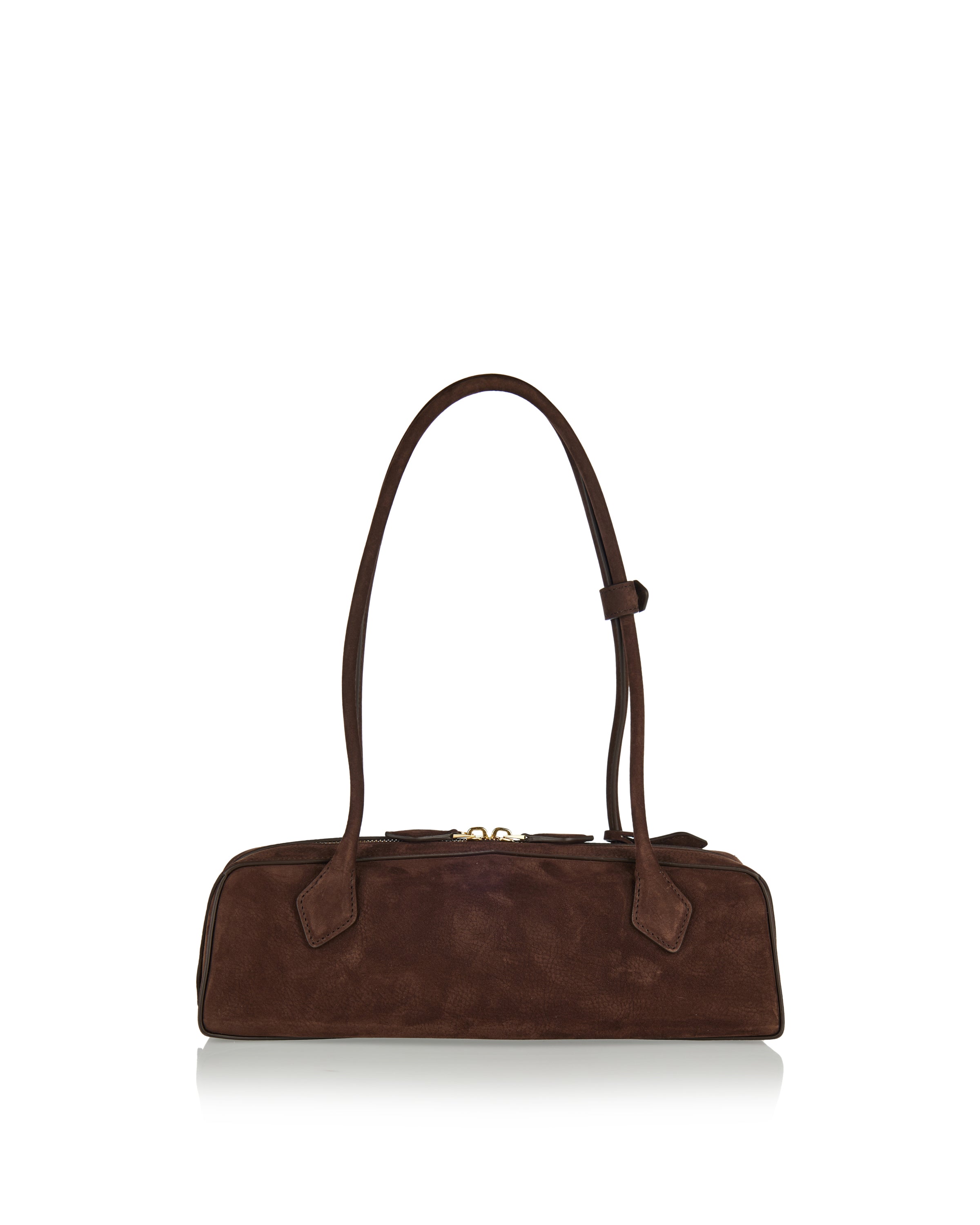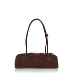Refined nubuck calf leather shoulder bag with an elongated silhouette inspired by the dachshund shape, featuring long tubular top handles and a two-way zip closure. Complete with an internal card slot and suede-lined interior, this Italian-made piece blends sculptural elegance with everyday functionality for elevated casual and contemporary wardrobes.