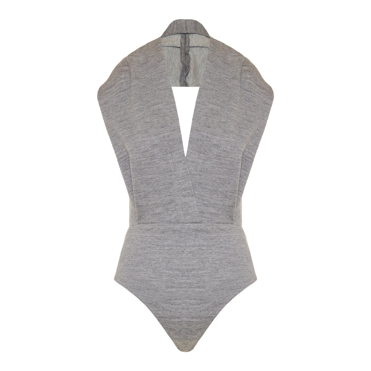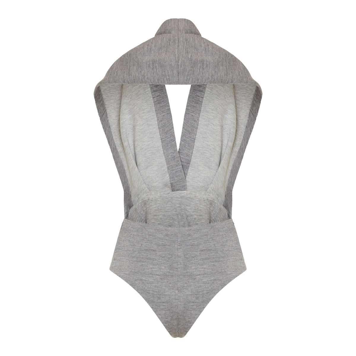 This Balmain bodysuit is crafted from a luxurious wool‑blend jersey, featuring a deep V‑neck and dramatic hood that drapes elegantly over the shoulders. The open back adds a bold touch, while the integrated waist insert enhances the figure. Ideal for evening events or high‑fashion styling, this piece combines comfort with couture appeal.