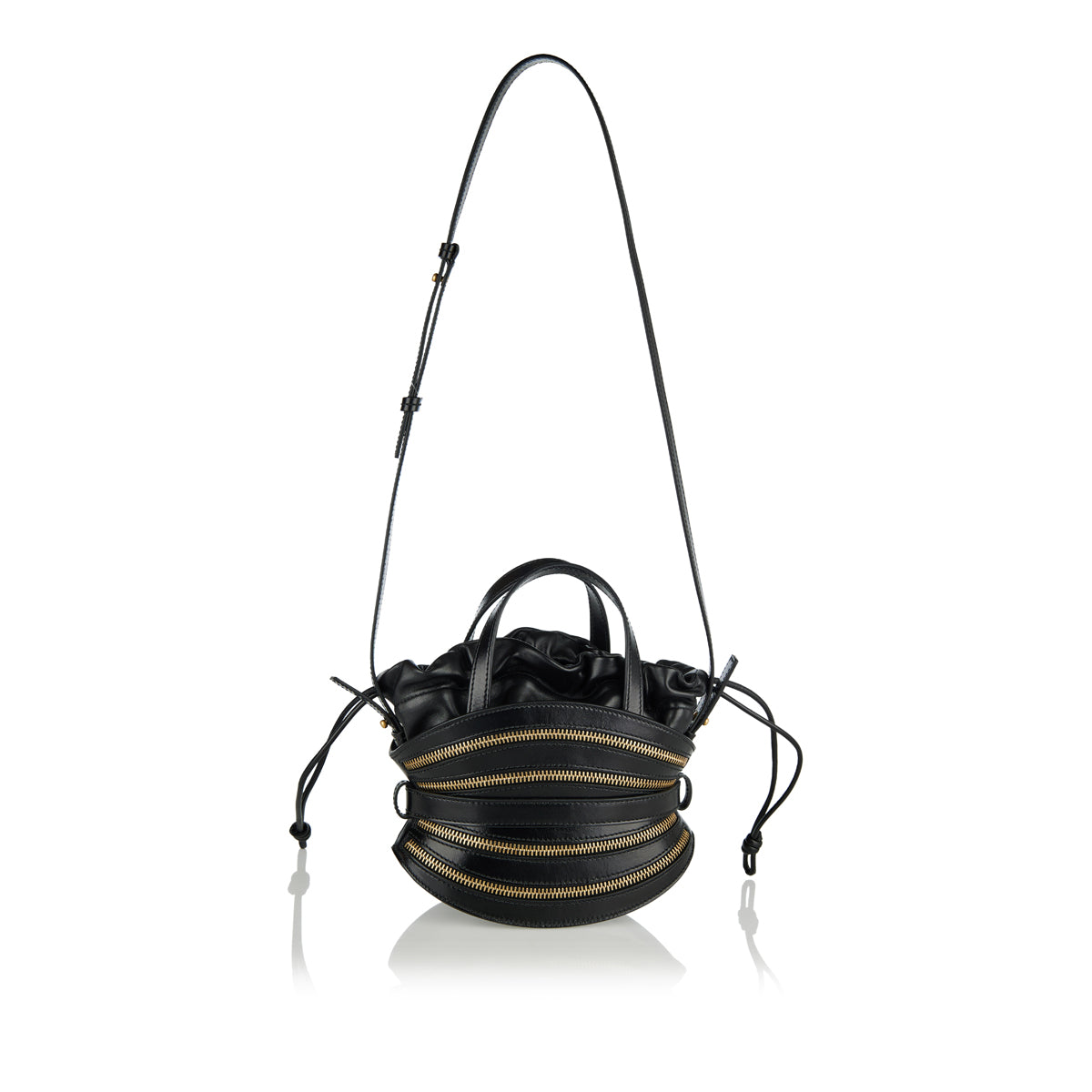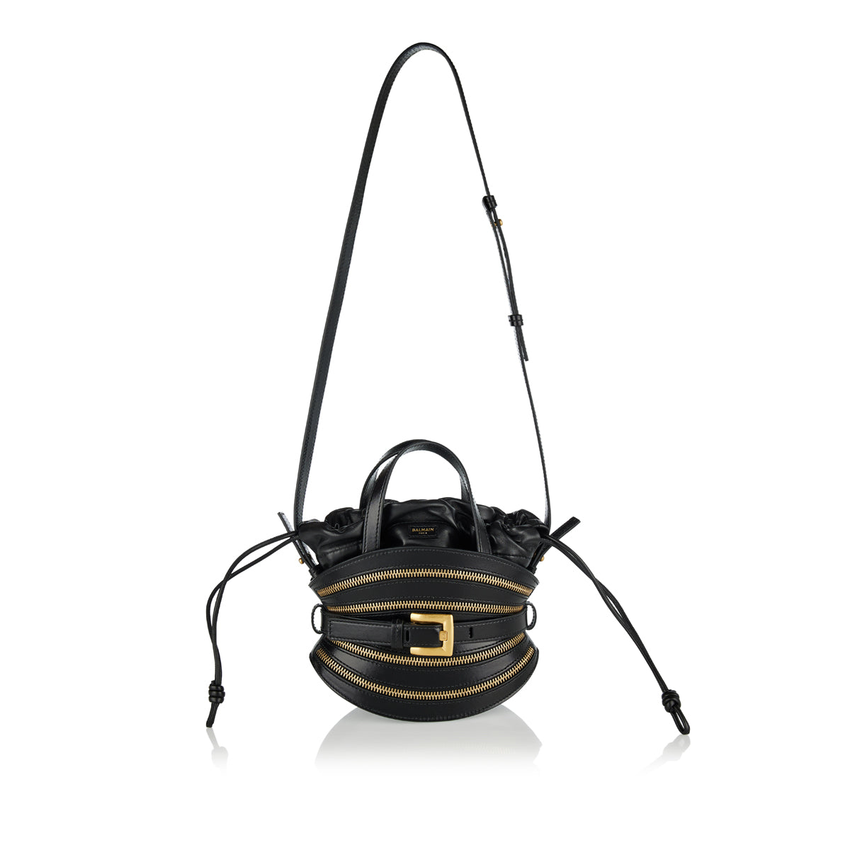 A refined and versatile mini bag, this Balmain design is crafted in smooth calfskin leather. It includes dual zips for ease of access, a detachable strap, and the iconic PB belt buckle accent. With a drawstring interior and compact silhouette, it’s ideal for elevated day-to-night wear.