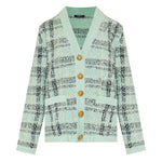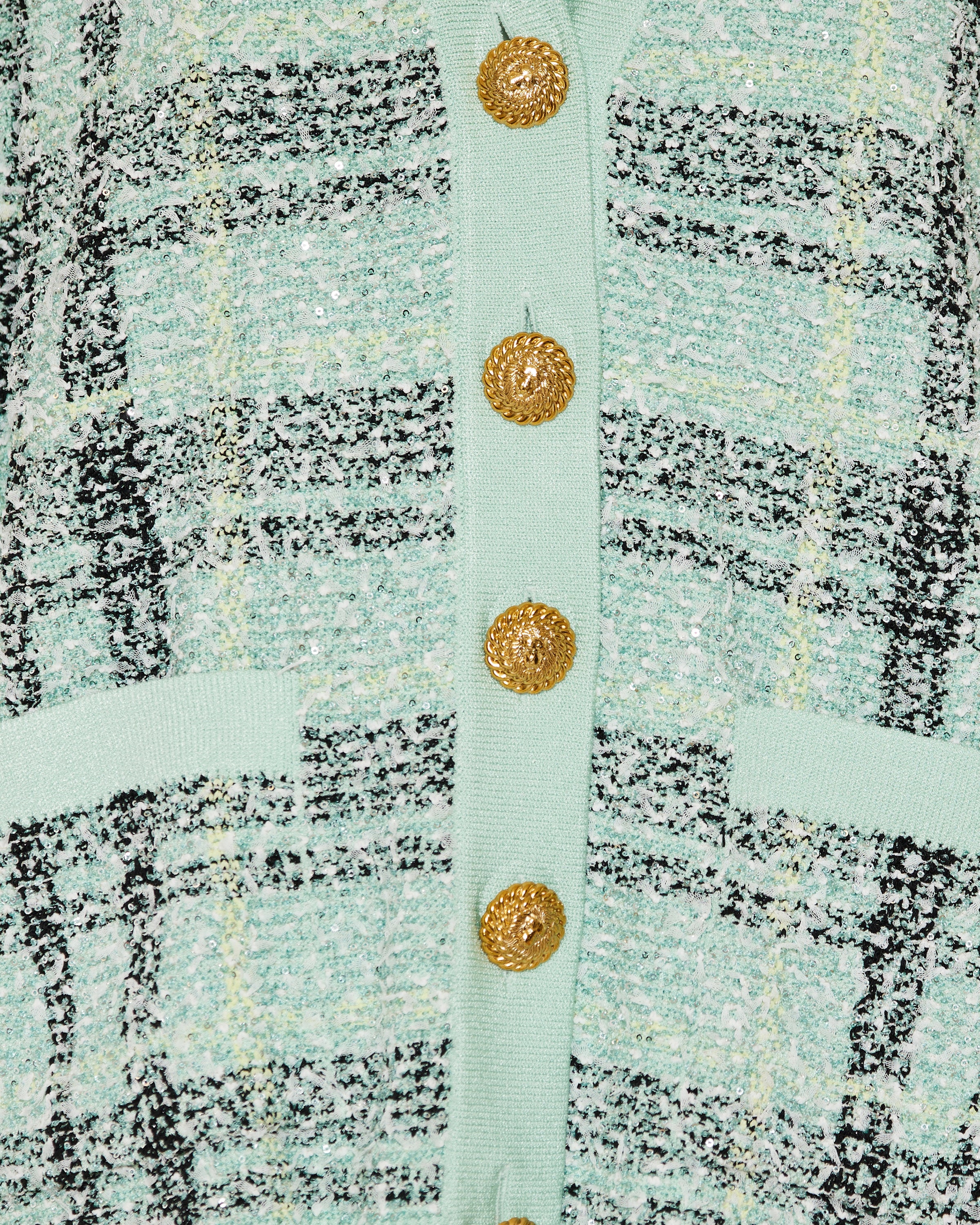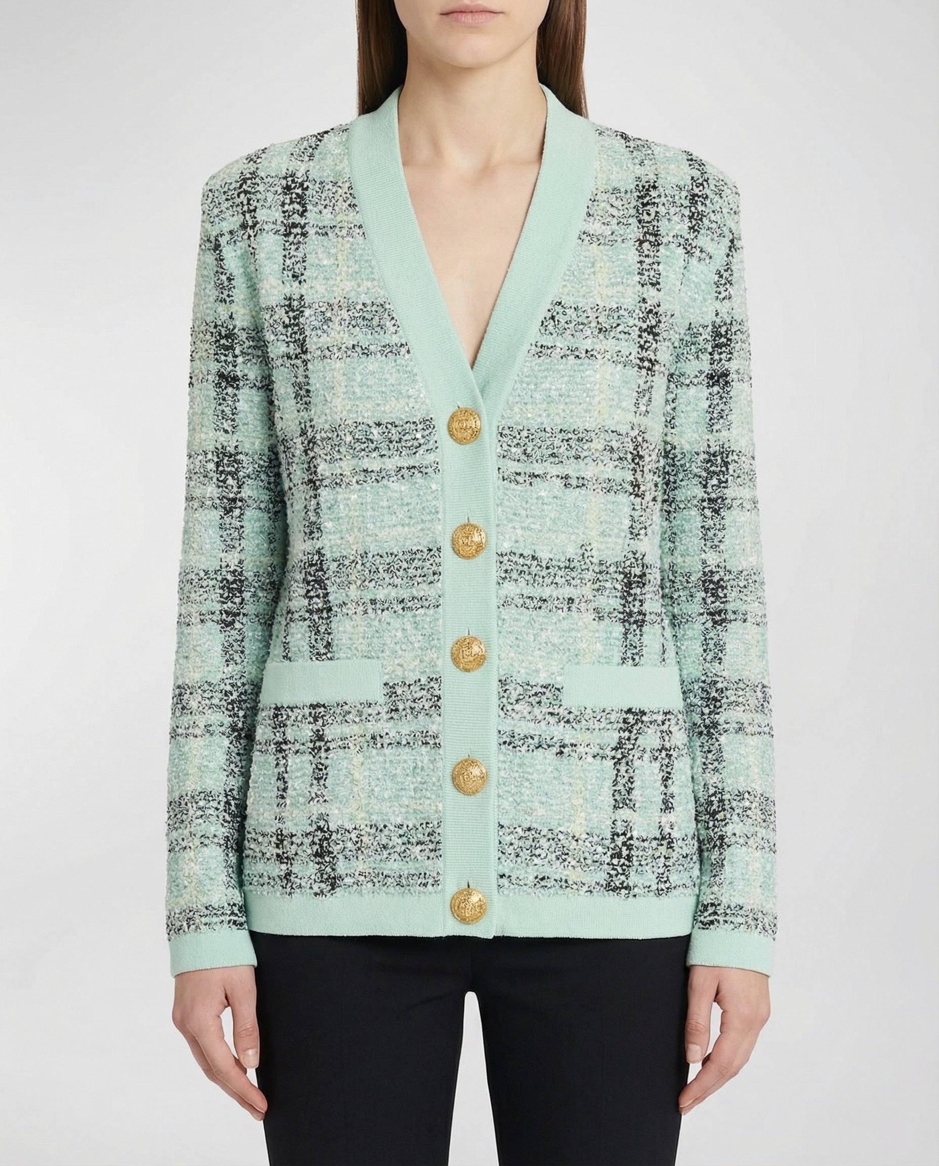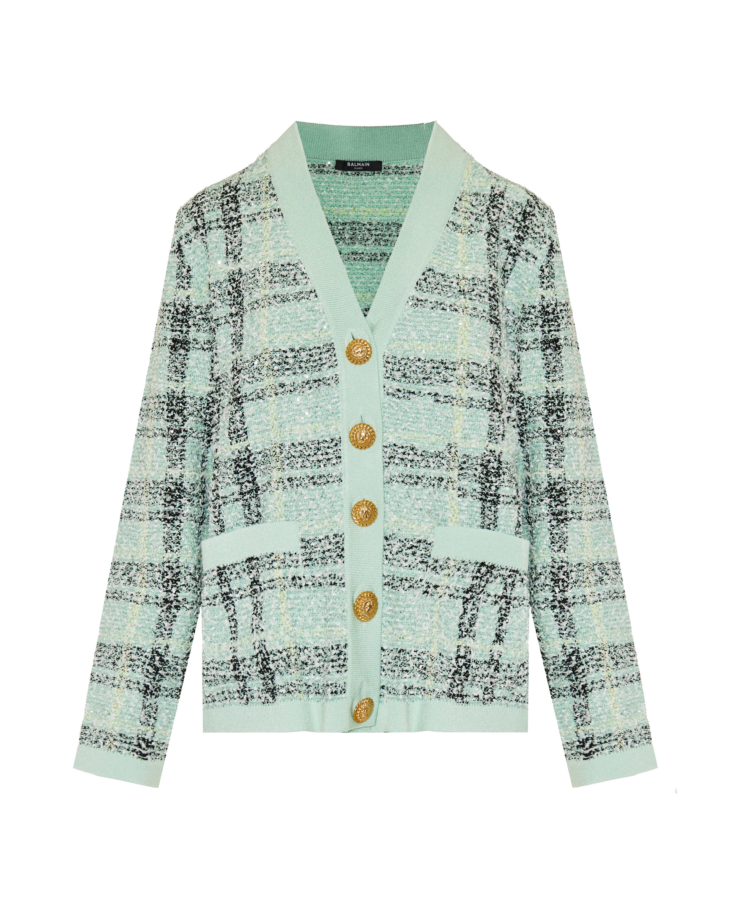 A relaxed‑fit glitter tweed cardigan from Balmain, woven with metallic‑accented threads for subtle shimmer and elevated texture. With a V‑neck, long sleeves, front button fastening and patch pockets, this Italian‑made piece brings Parisian couture elegance to refined casual and everyday wardrobes.