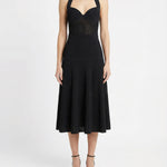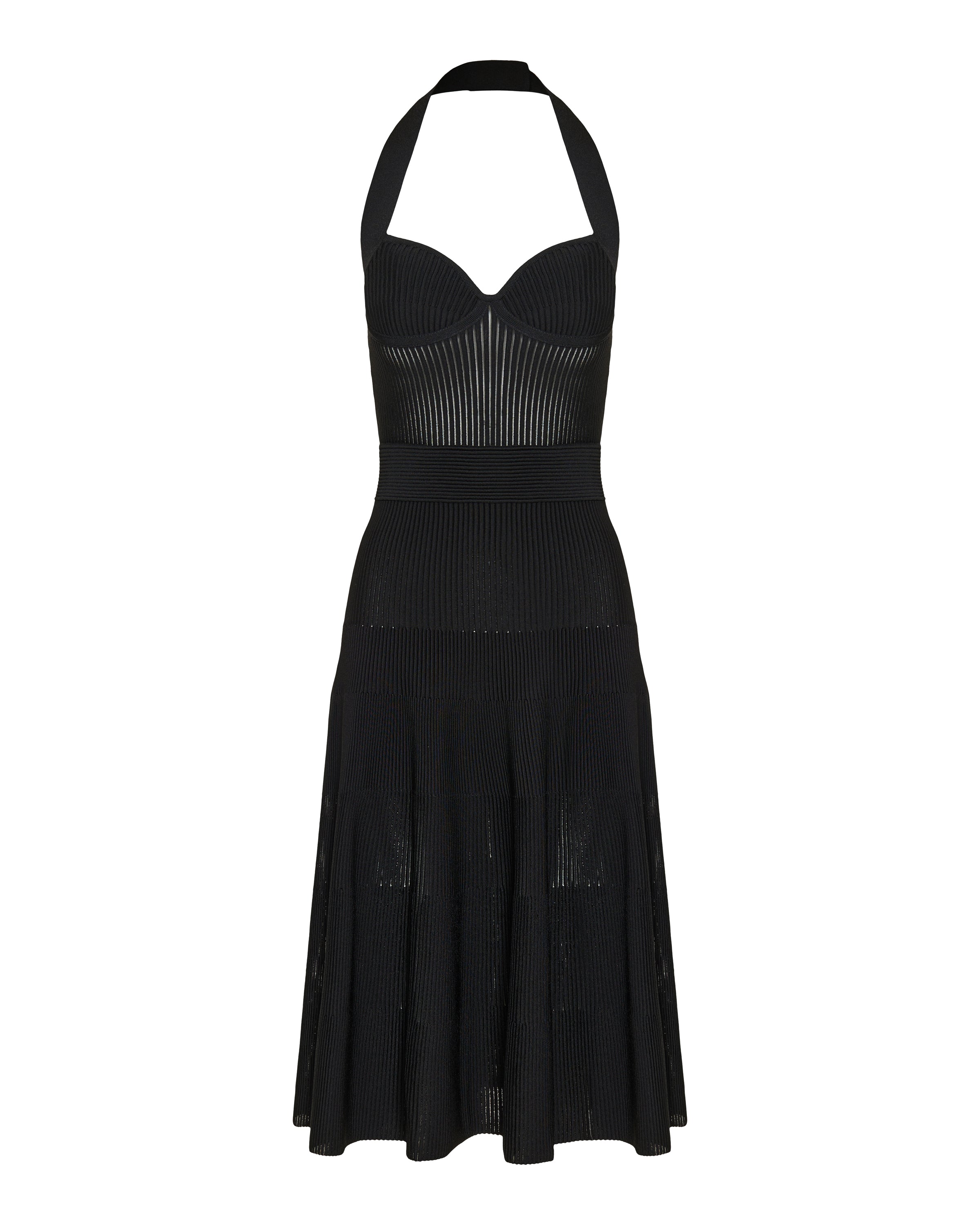 Midi dress crafted in pleated knit, defined by a sculptural halterneck silhouette that highlights the shoulders and neckline. Designed with a fluid yet structured drape, it balances movement with precision. Elegant and confident, this piece is suitable for evening occasions, formal events, and elevated contemporary styling with a refined, modern edge.