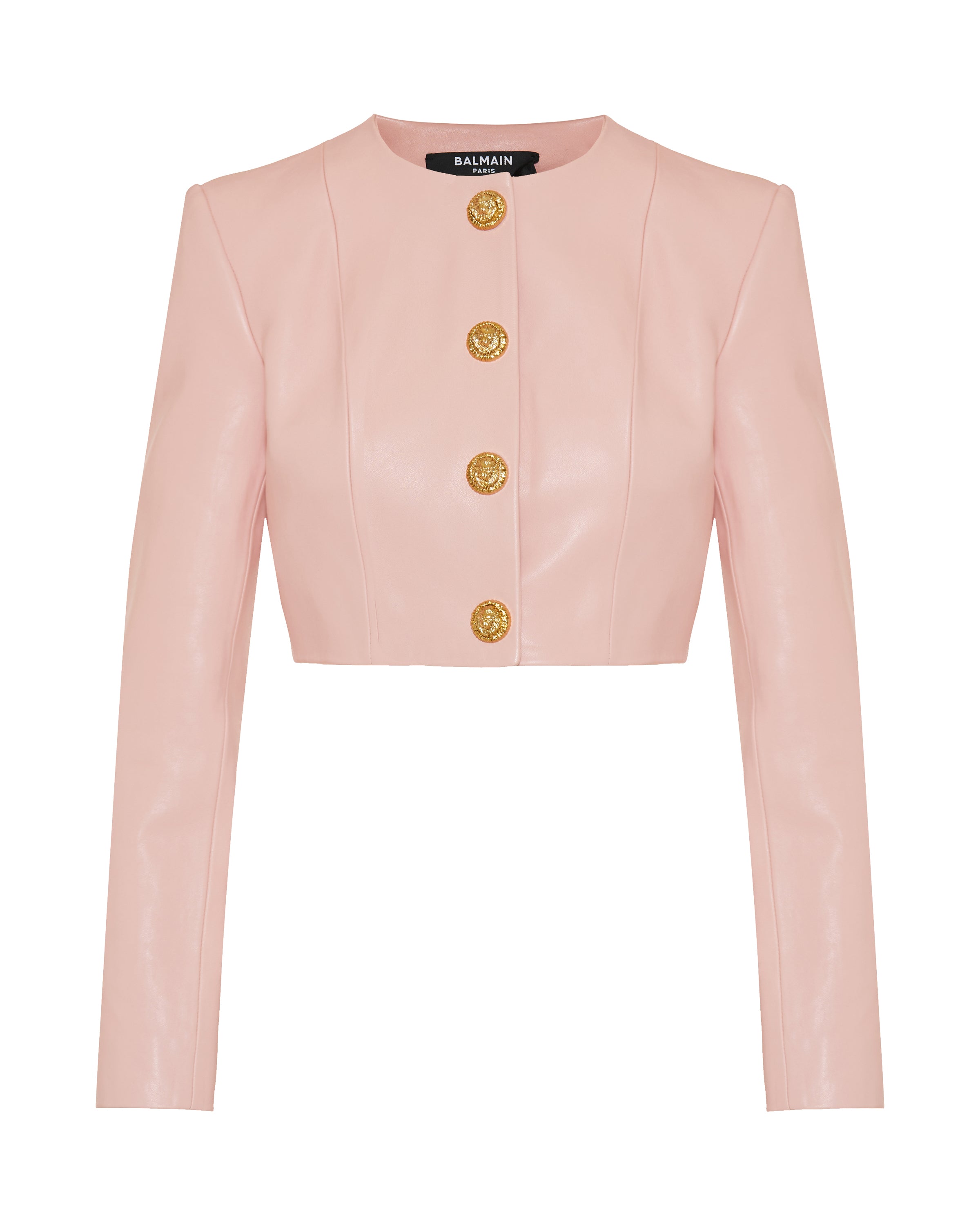 Cropped Balmain leather jacket in a soft pink lambskin with signature gold‑toned Tête de Lion buttons, structured shoulders and a snap‑button front. This refined piece combines Parisian couture heritage with contemporary tailoring, ideal for elevated casual and transitional wardrobes