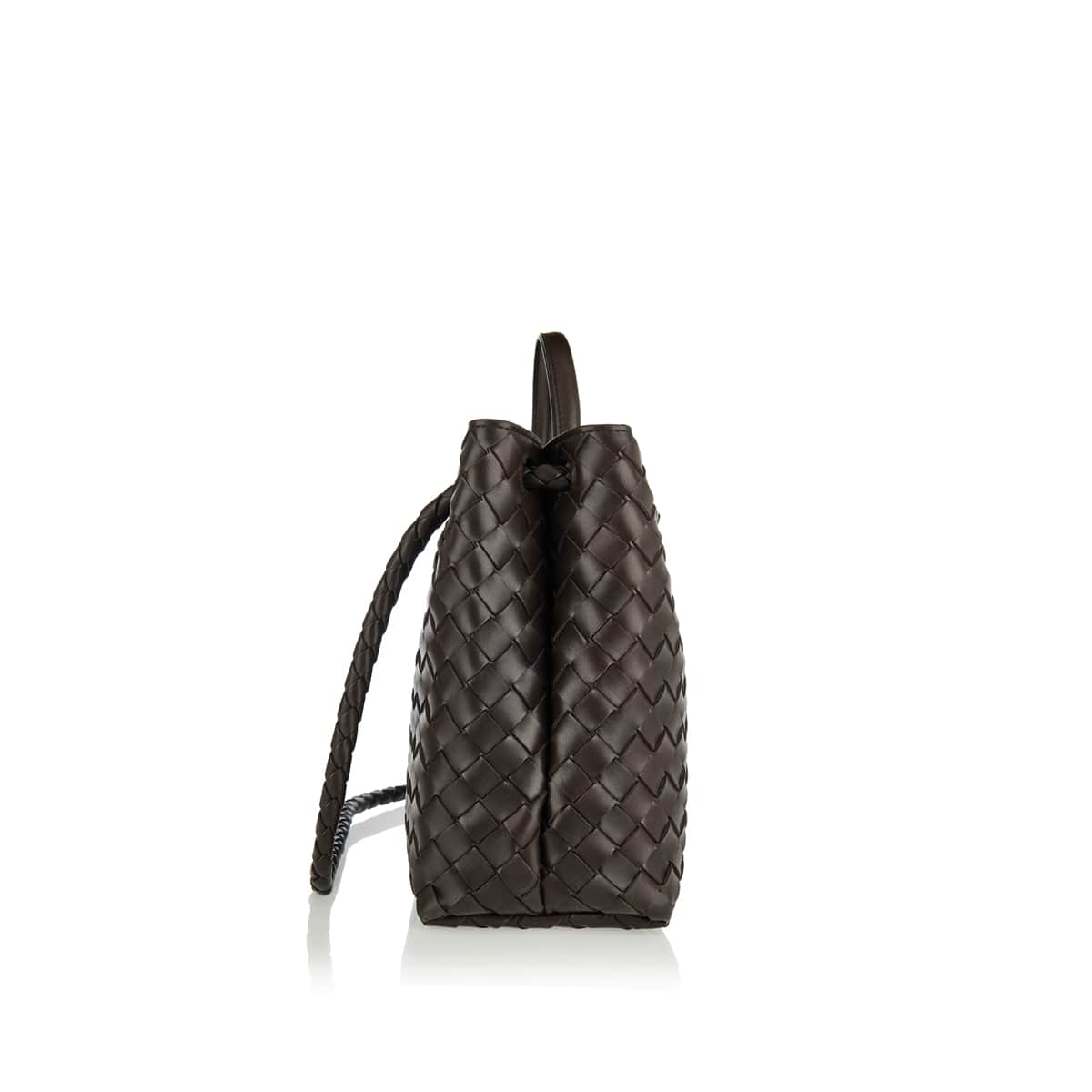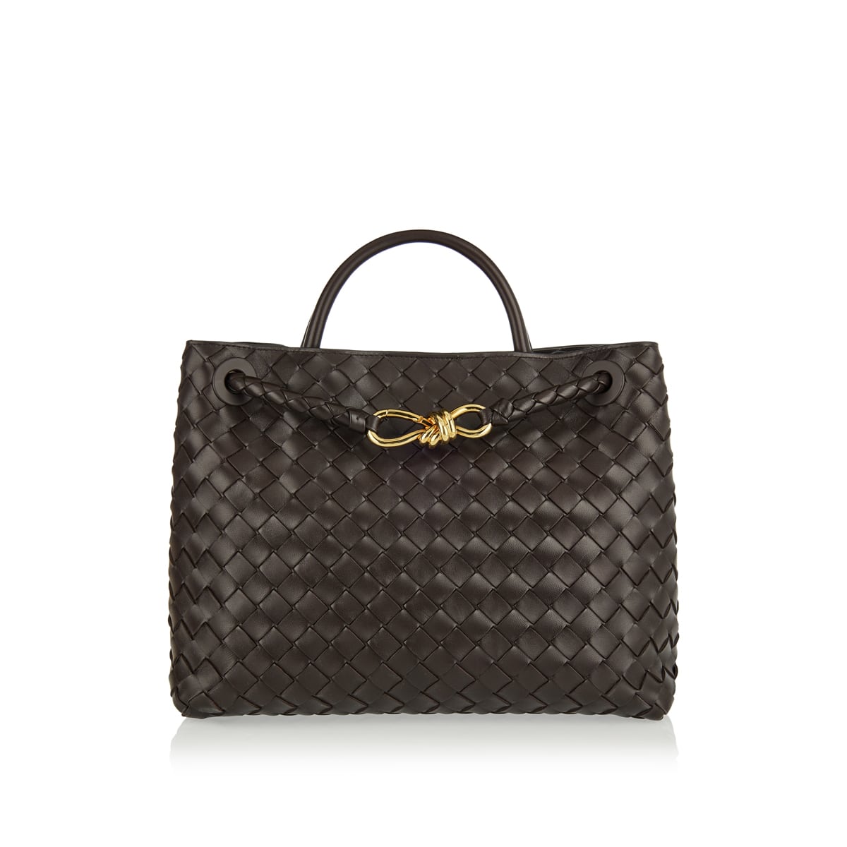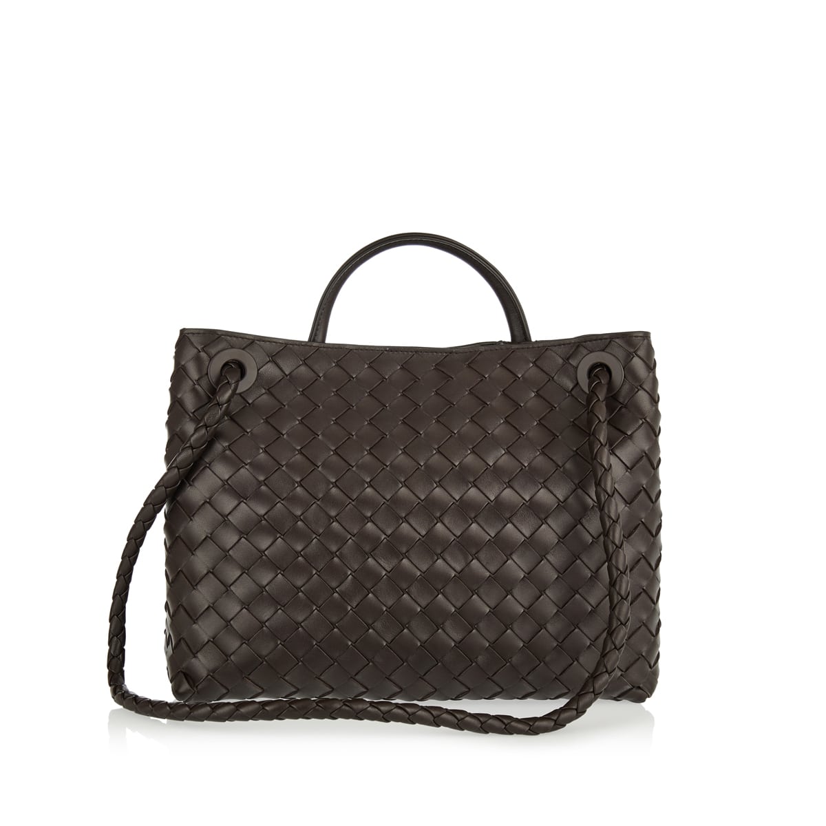 The Andiamo medium top-handle bag is crafted in supple Intrecciato nappa leather with sliding cross-body strap and signature knot detail in gold at the front. It features compartmented interior with one zip pocket, two open pockets and magnet closure.