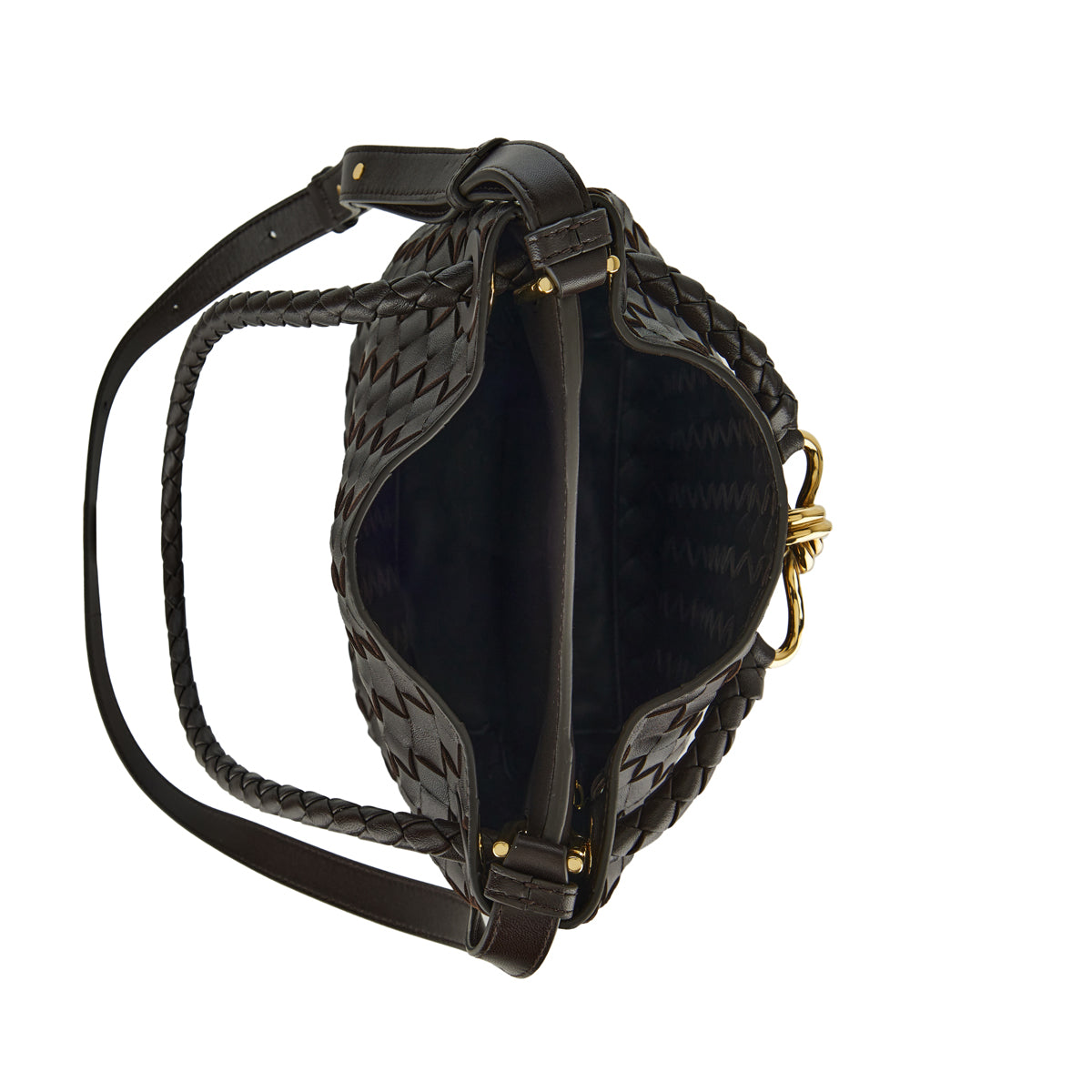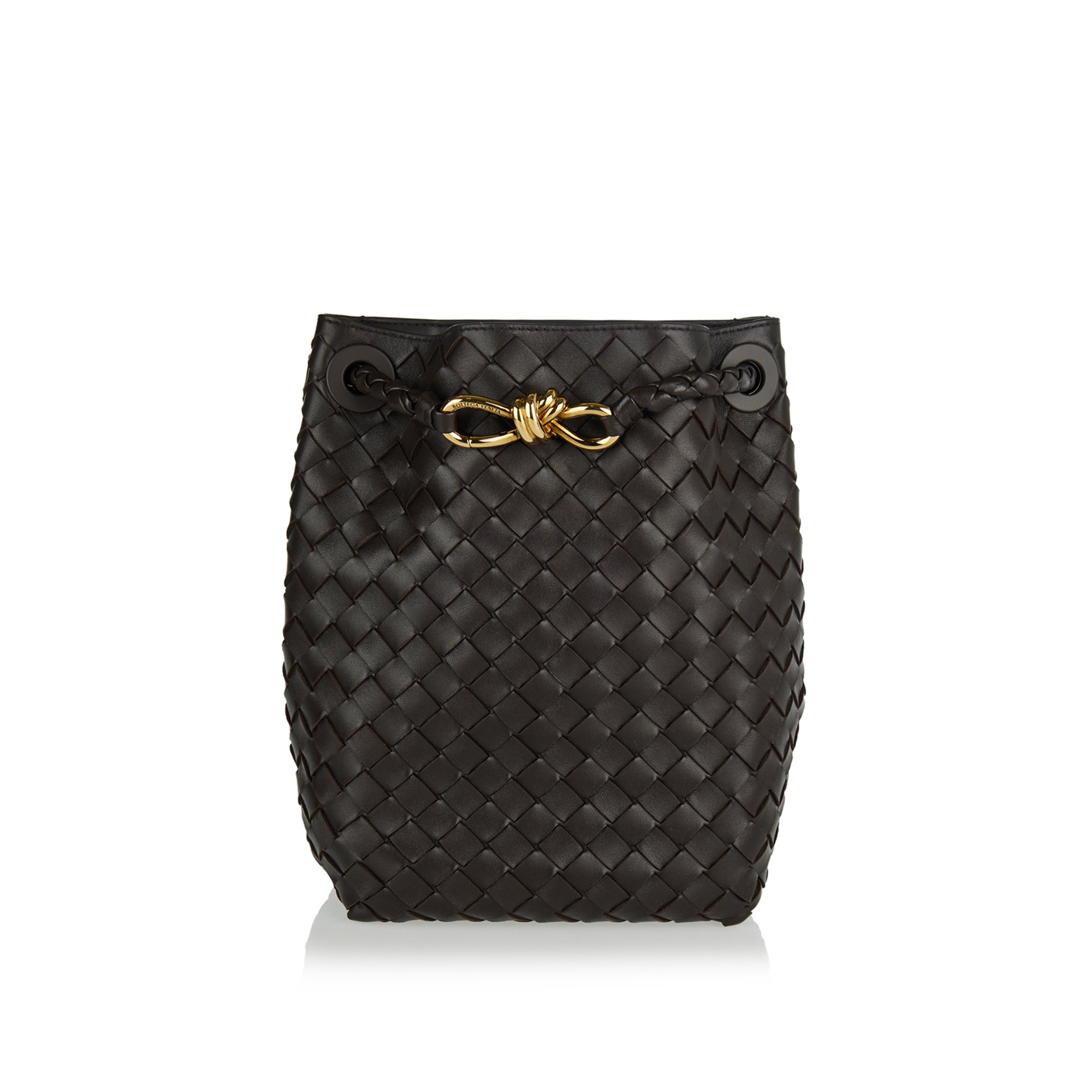 A refined bucket bag crafted in supple woven leather with signature knotted hardware, offering a sculptural yet understated silhouette. Compact but spacious enough for essentials, it suits elevated daywear or polished evening looks — an ideal accessory for those who appreciate subtle luxury and versatile styling.