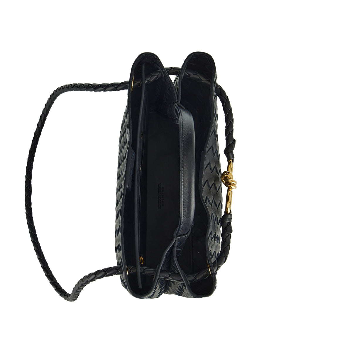 The Andiamo medium top handle bag is crafted in supple Intrecciato nappa leather with sliding cross-body strap and signature knot detail in gold at the front. It features compartmented interior with one zipped pocket, two open pockets and magnetic closure.