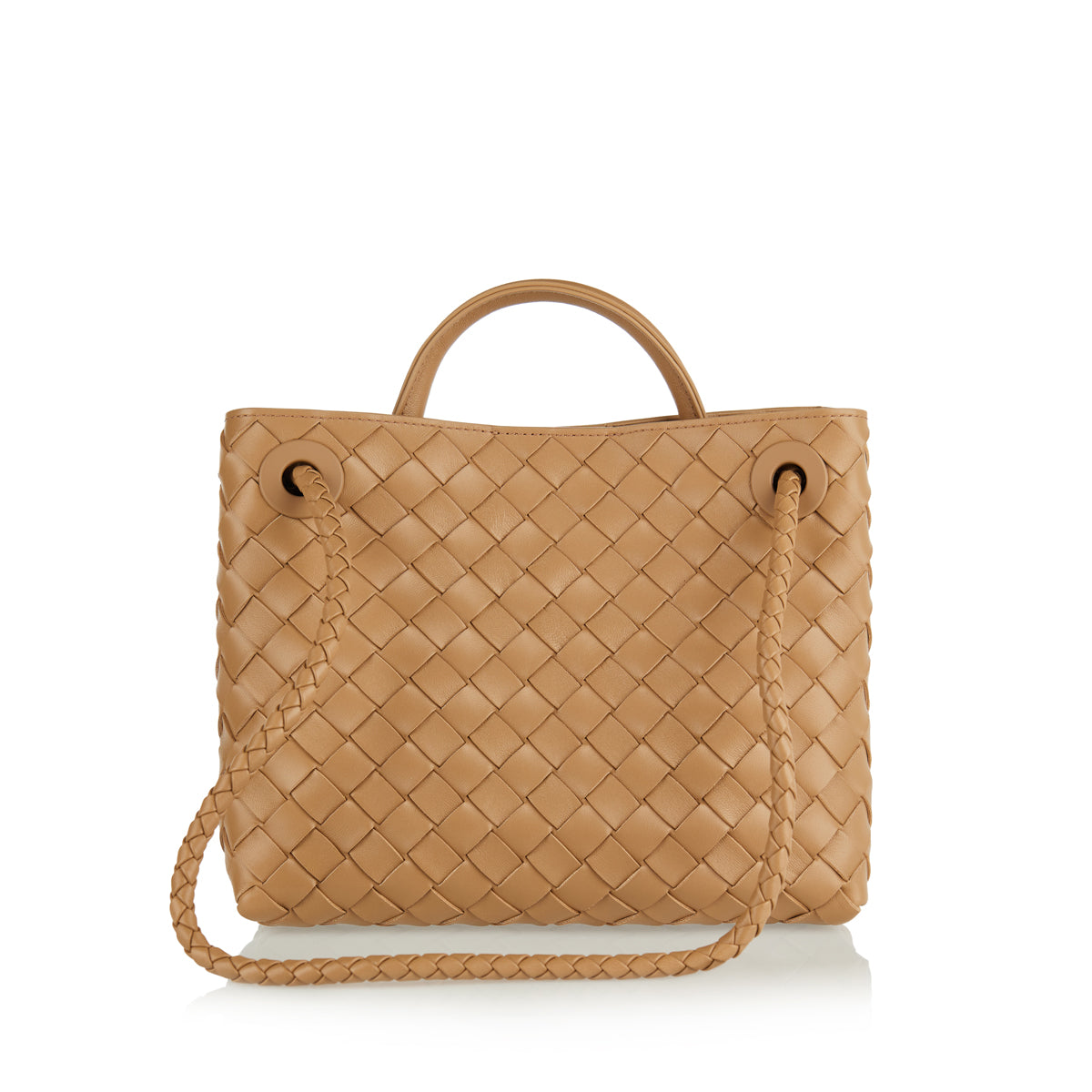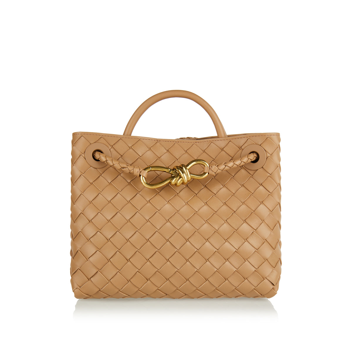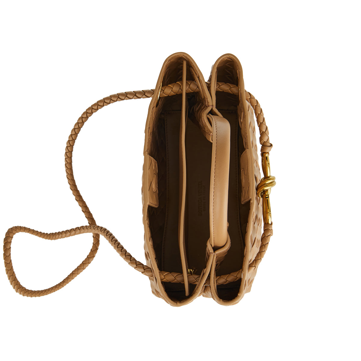 The Andiamo small top-handle bag is crafted in supple Intrecciato nappa leather with sliding cross-body strap and signature knot detail in gold at the front. It features compartmented interior with one zip pocket, two open pockets and magnet closure.