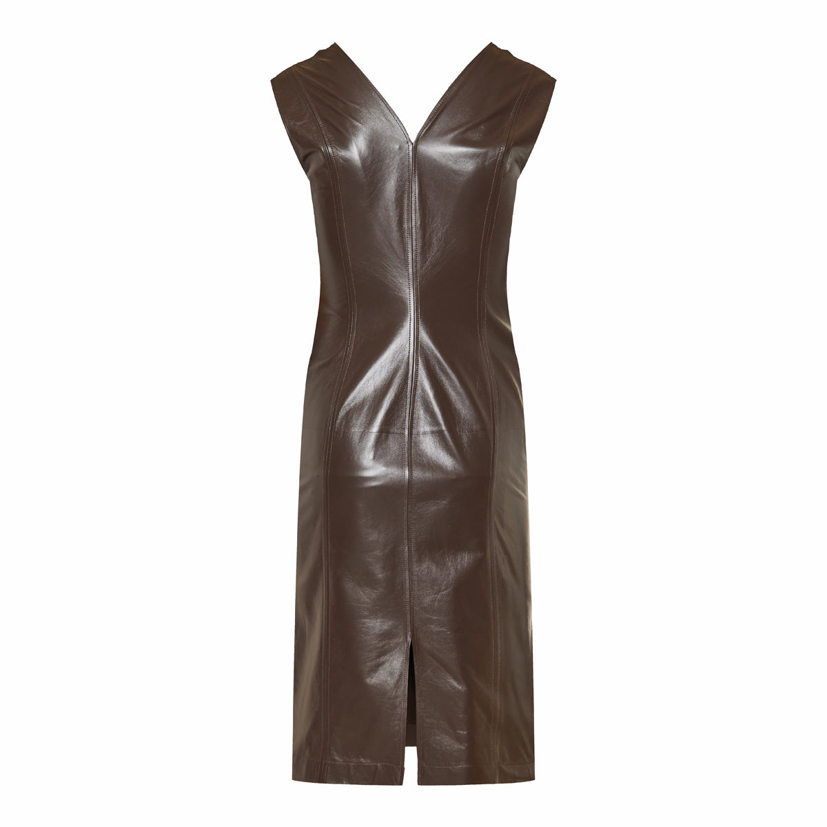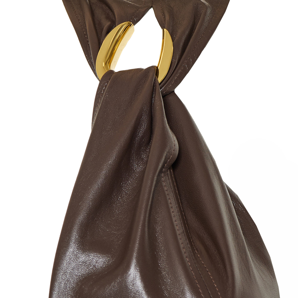 Crafted in Italy from rich tobacco-hued leather, this sculptural Bottega Veneta dress features a deep V-neckline and statement gold-tone ring details that gather the shoulders into soft folds. A striking balance of minimalism and bold craftsmanship, it’s cut in a sleek midi silhouette that flatters from every angle. 100% leather.