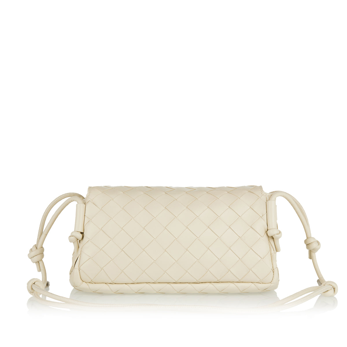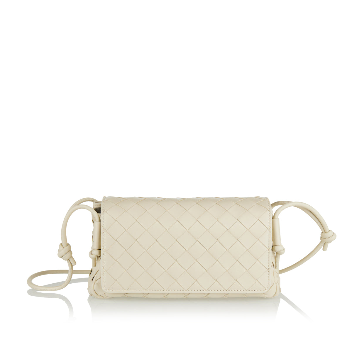 The Bottega Veneta Notturno pouch is an elegant accessory crafted from Intrecciato nappa leather. Featuring a sea salt hue and gold-tone hardware, it offers a minimalist design with a flap closure and an adjustable tubular strap with sliding knot details. The suede-lined interior includes two main compartments and an interior zip pocket, providing both style and functionality. Ideal for evening events or as a refined everyday companion.
