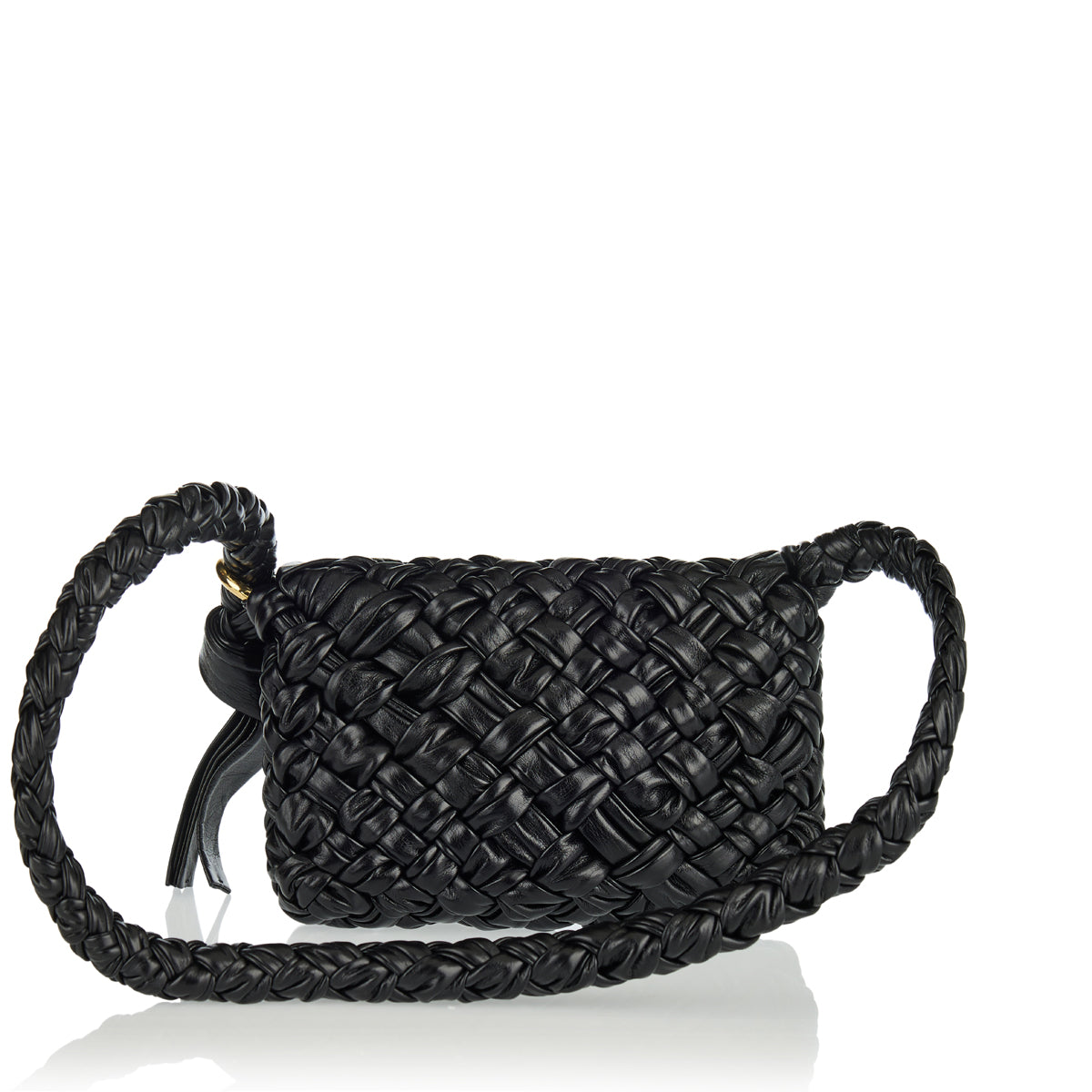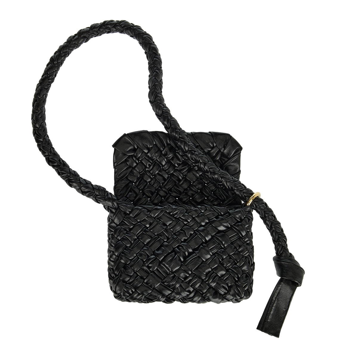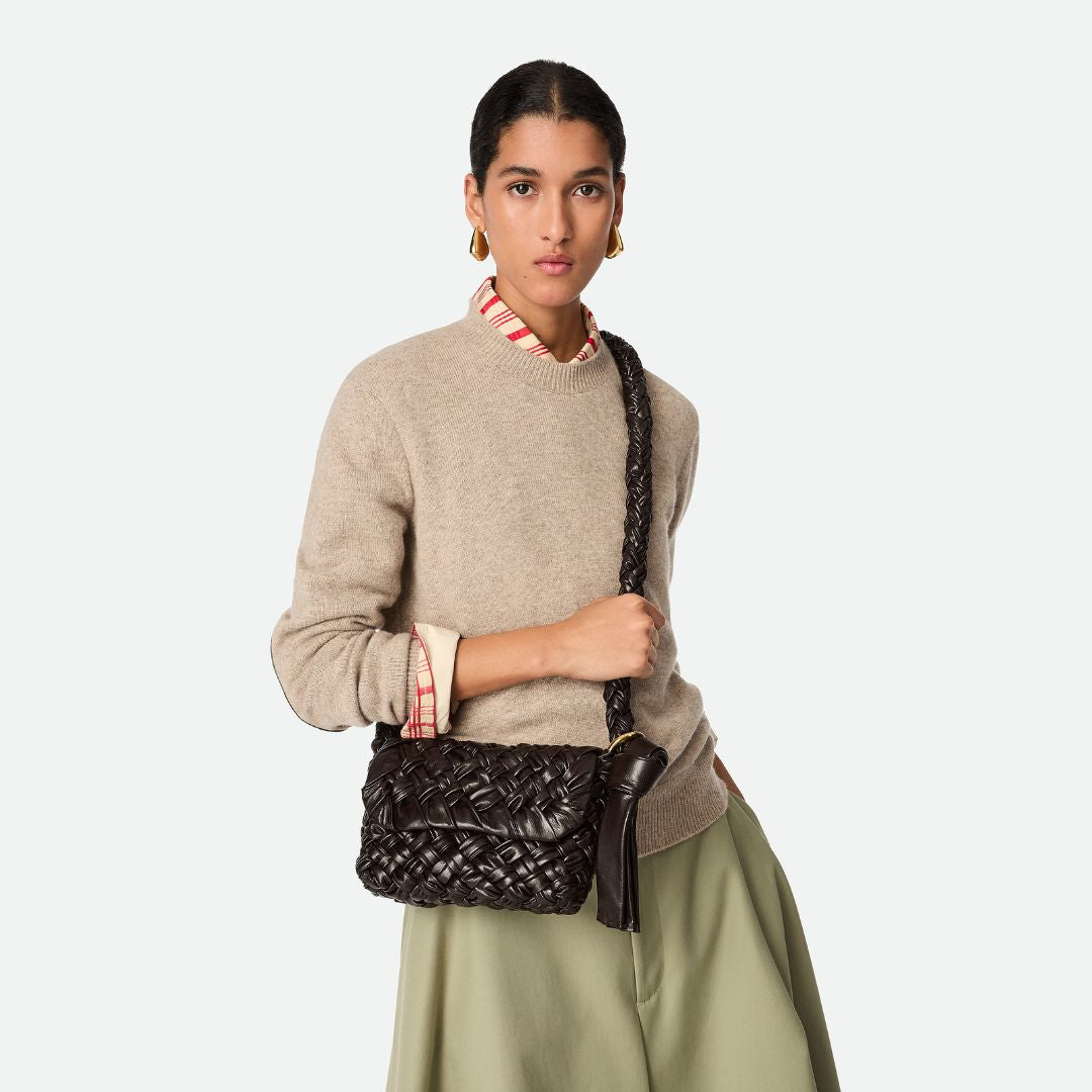 The small Kalimero Città bag in soft foulard Intreccio leather with sliding shoulder strap, metallic ring and knot detail features single interior with zipped pocket and magnetic closure.