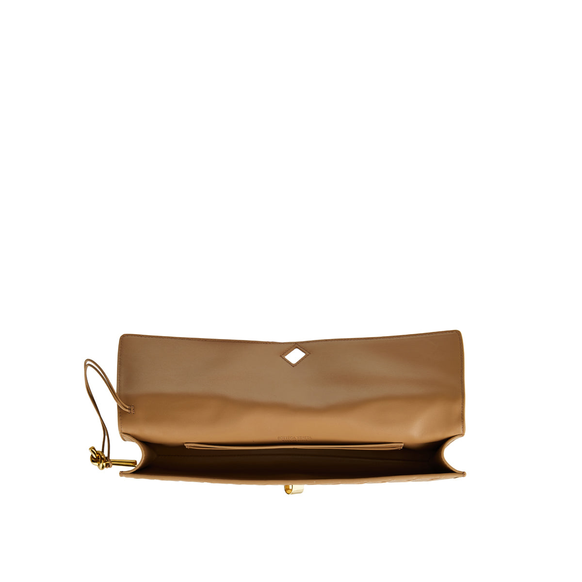 Expertly handcrafted in Italy from signature intrecciato lambskin, the Andiamo clutch by Bottega Veneta in pale brown exudes modern luxury. Featuring a sleek top handle, metallic knot closure and six interior card slots, this compact silhouette effortlessly complements evening ensembles and elevated daytime looks with understated sophistication.