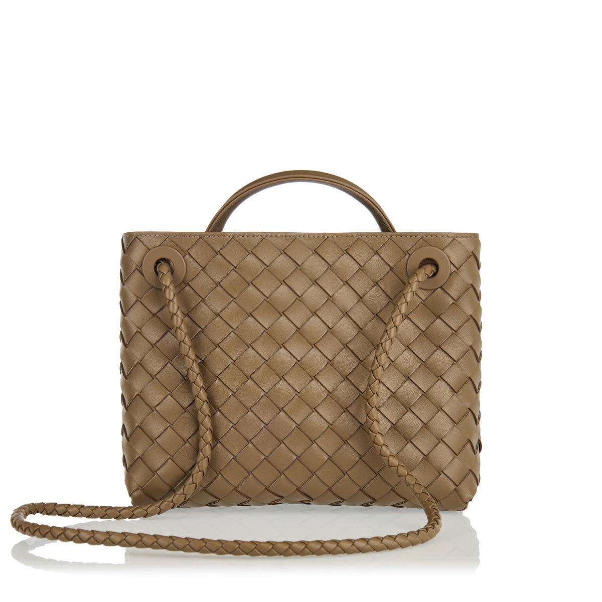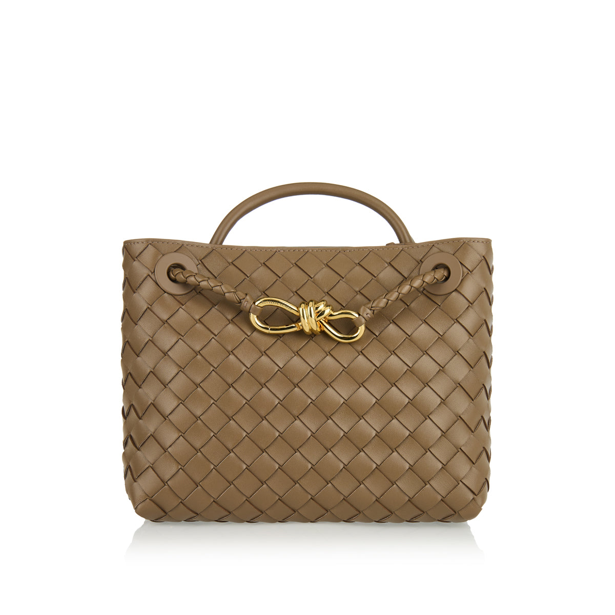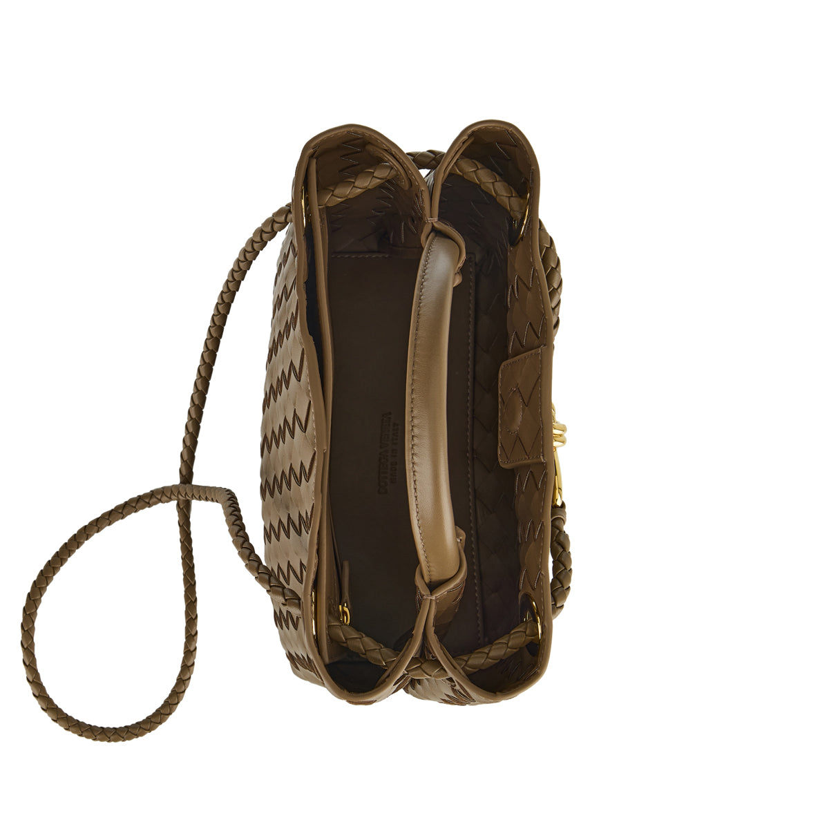 The Andiamo small top-handle bag is crafted in supple Intrecciato nappa leather with sliding cross-body strap and signature knot detail in gold at the front. It features compartmented interior with one zip pocket, two open pockets and magnet closure.
