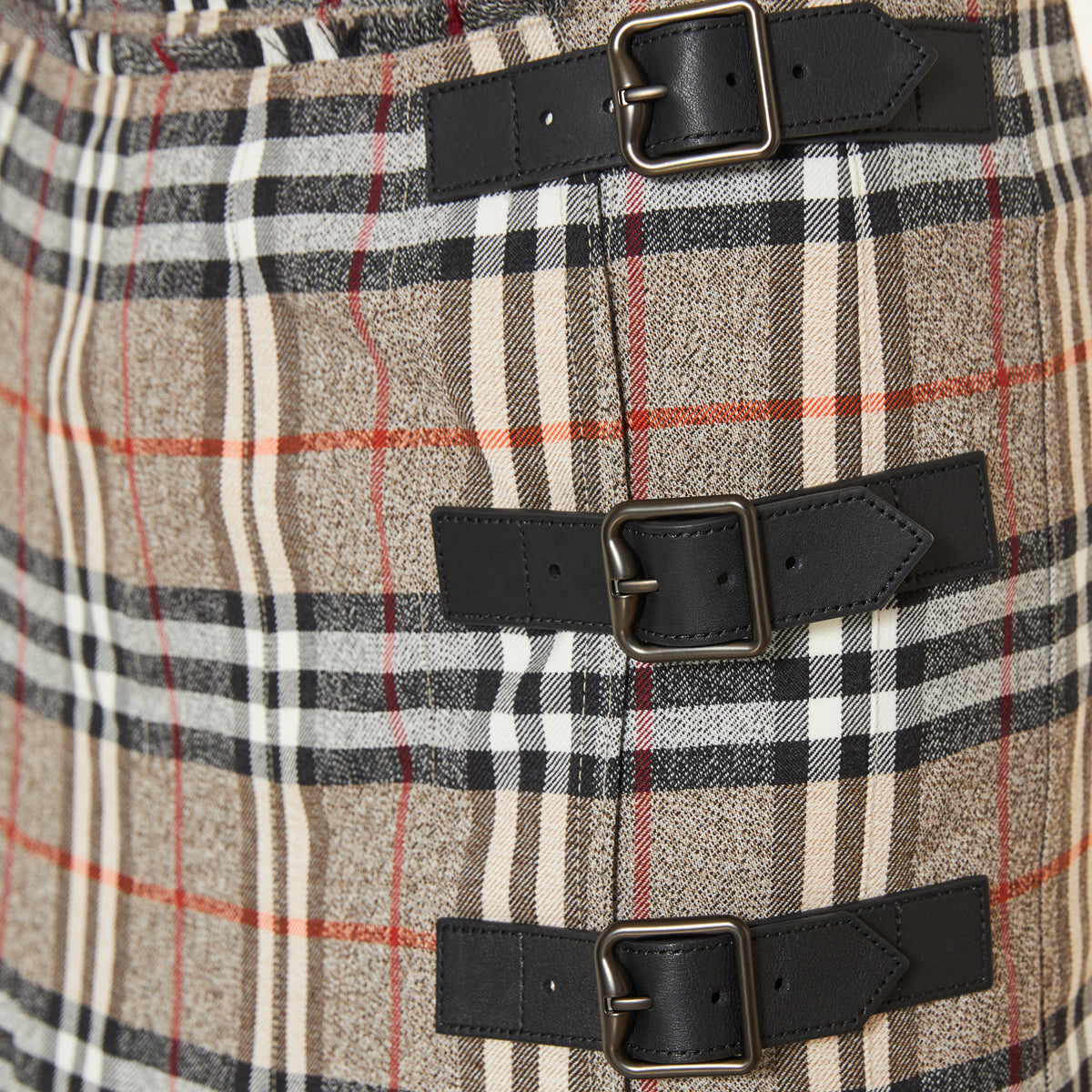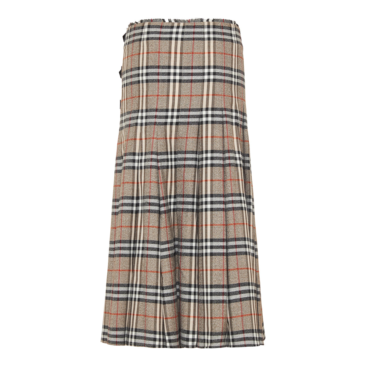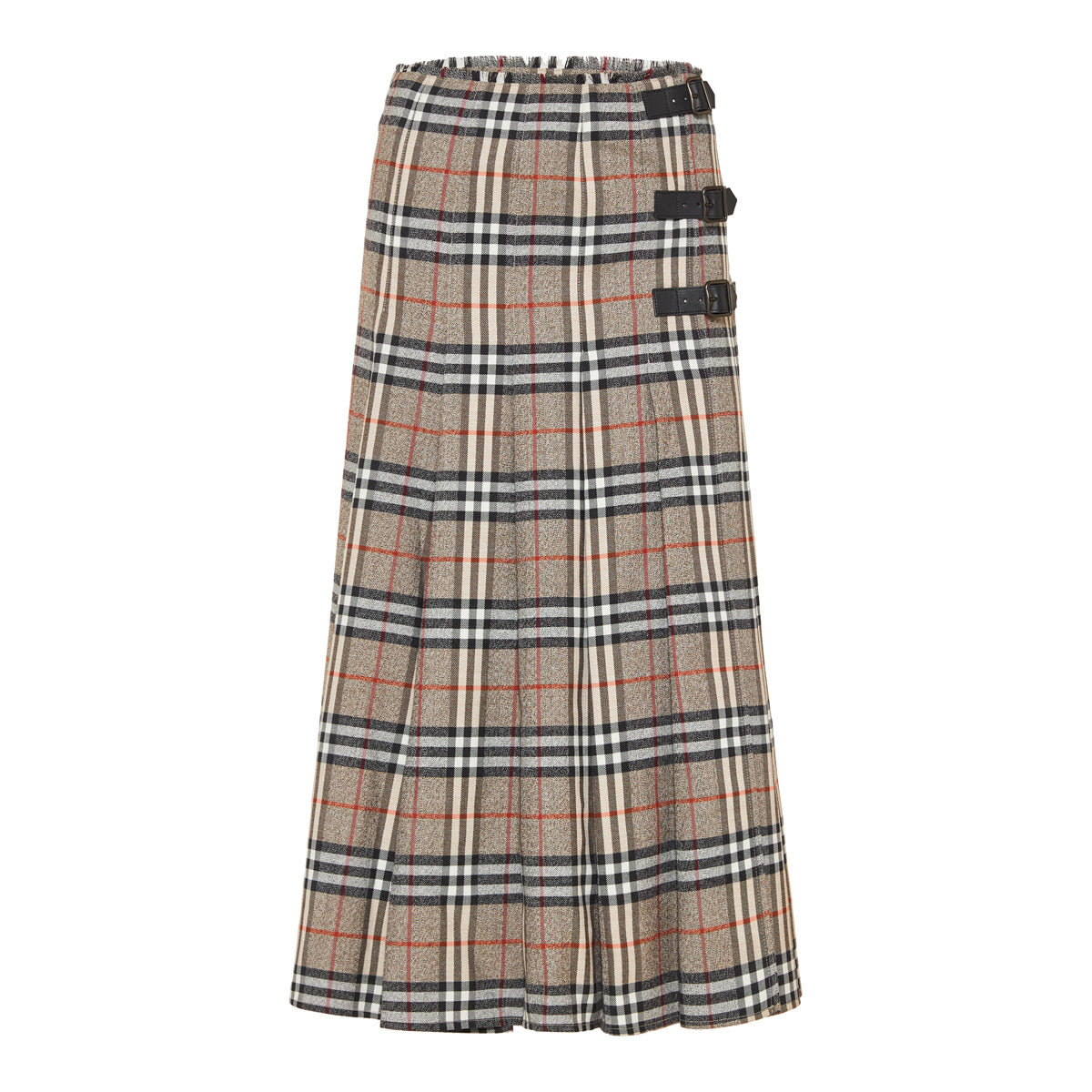 This Burberry midi skirt is crafted from a luxurious wool blend in a classic check pattern. Featuring a wrap-style front with a side buckle fastening, it creates a flattering A-line silhouette. Designed to sit at the waist with a concealed zip closure, it merges Scottish heritage-inspired design with contemporary tailoring.