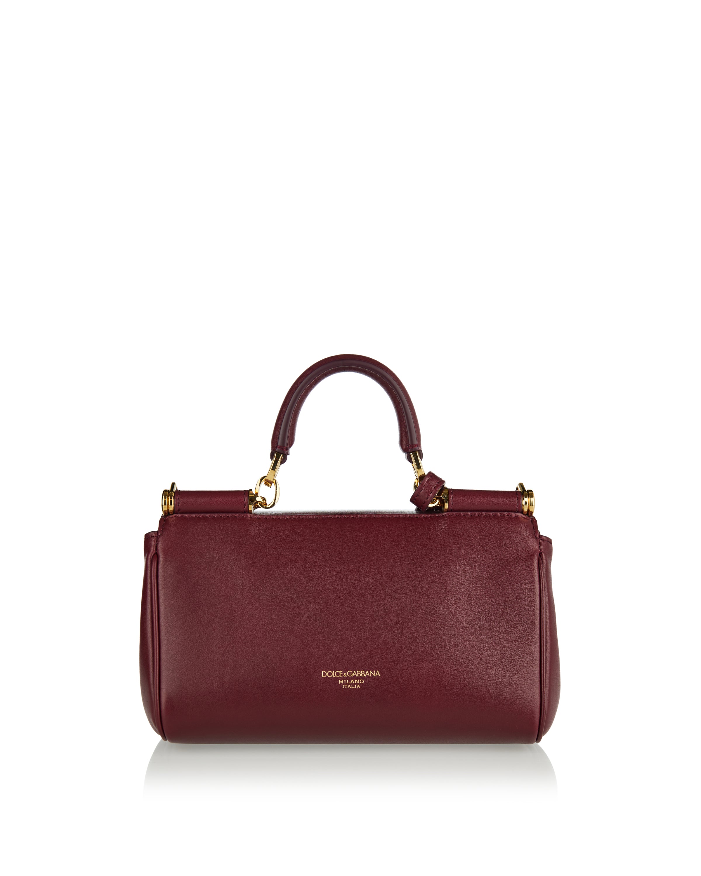 The Dolce & Gabbana my sicily handbag in burgundy leather showcases a structured silhouette with a tuck-in front flap, top handle and adjustable, removable shoulder strap, complemented by gold-tone hardware and interior organizational pockets. A refined Italian-crafted accessory that elevates both casual and formal ensembles with timeless elegance.