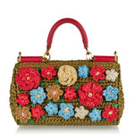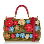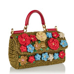 A structured top-handle bag crafted from woven raffia for a lightweight, textured silhouette.