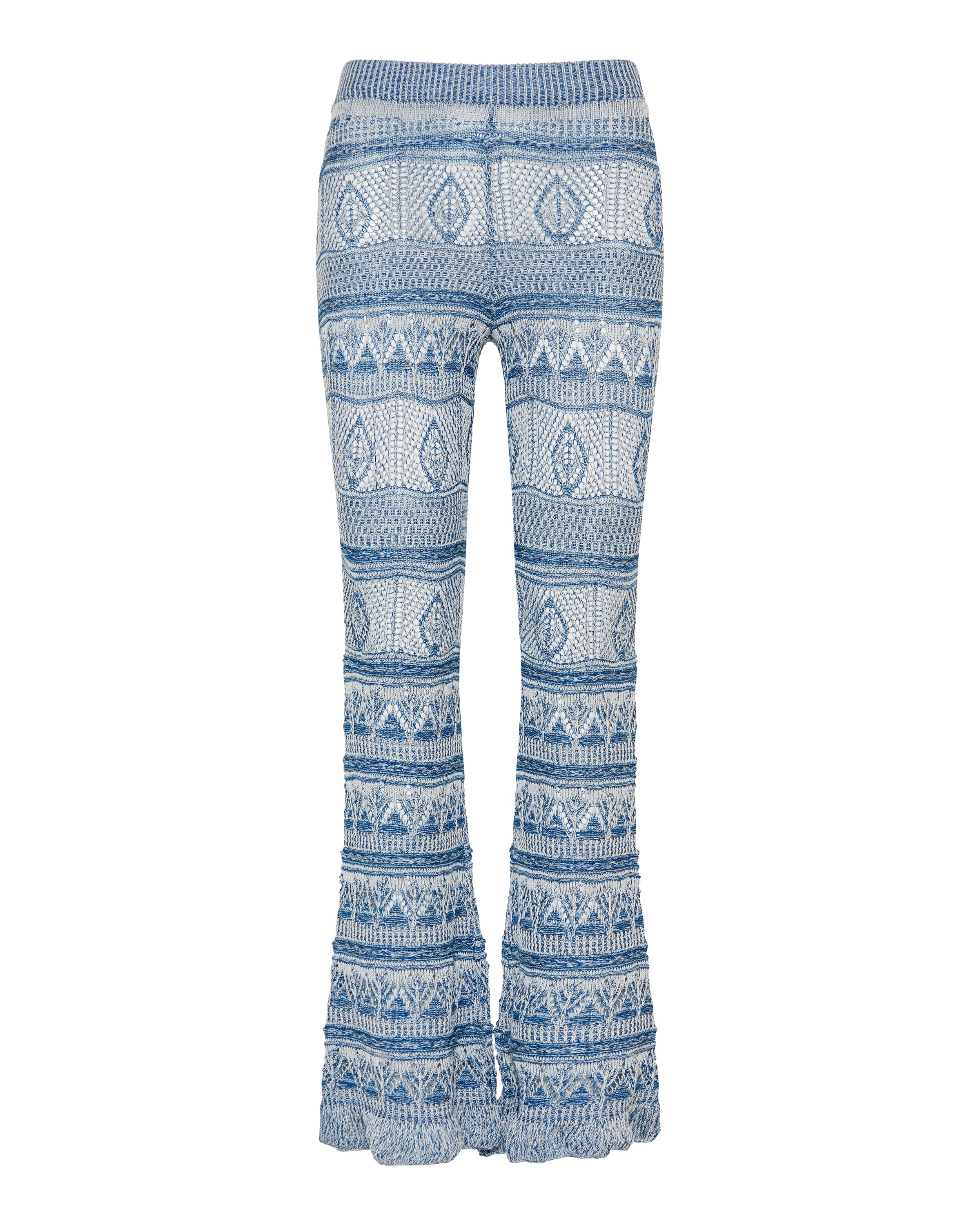 Flared trousers crafted from crochet cotton, expressing Etro’s refined artisanal aesthetic. Designed for elevated casual and polished daytime wear, the silhouette offers fluid movement and tactile texture. The high-waisted cut and flared leg create a flattering, contemporary profile suited to sophisticated summer styling.