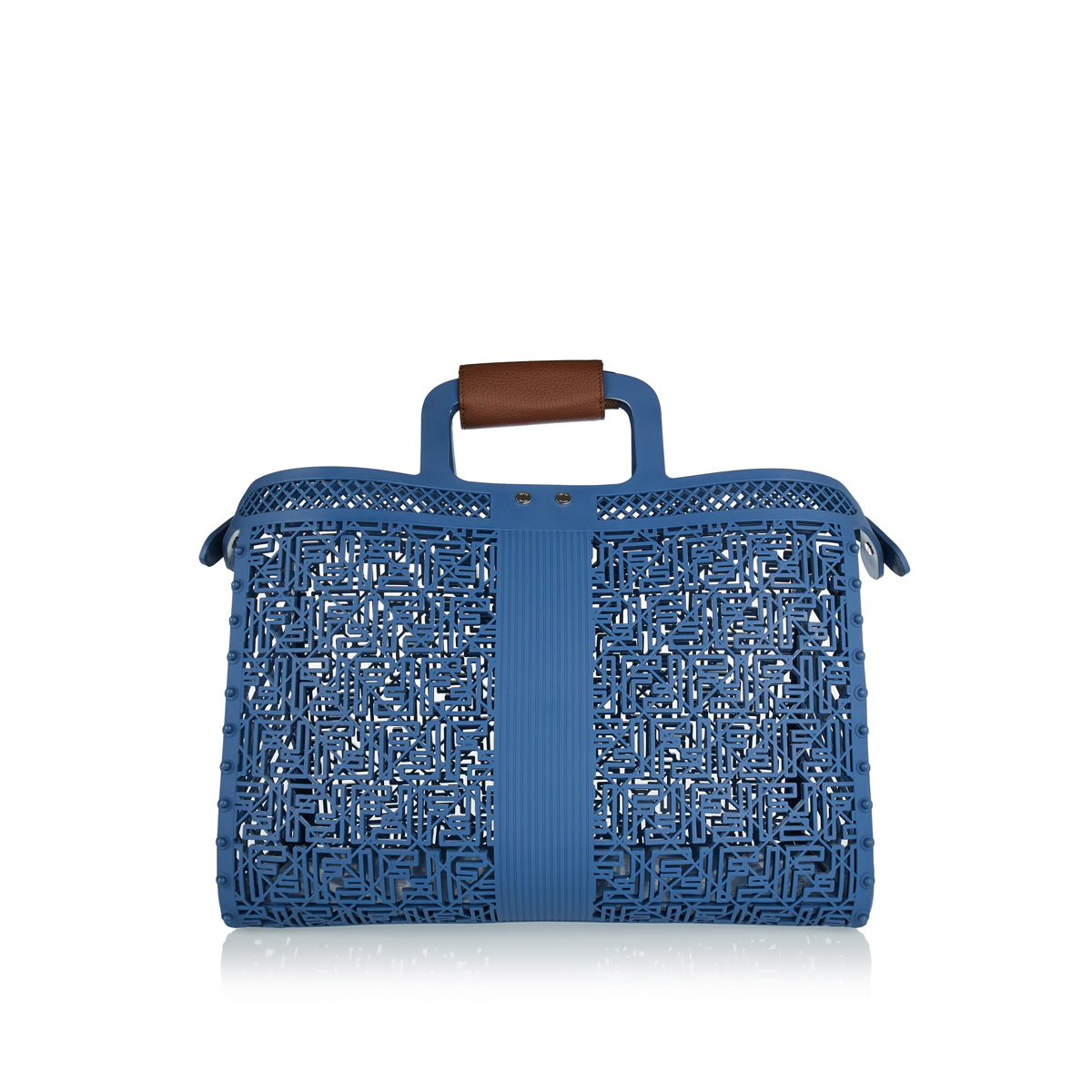 The Fendi Basket Forty8 bag is crafted from blue recycled plastic, designed for versatile casual and resort styling. Featuring a structured silhouette with open-top construction and logo detailing, it offers a contemporary approach to sustainable luxury.