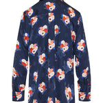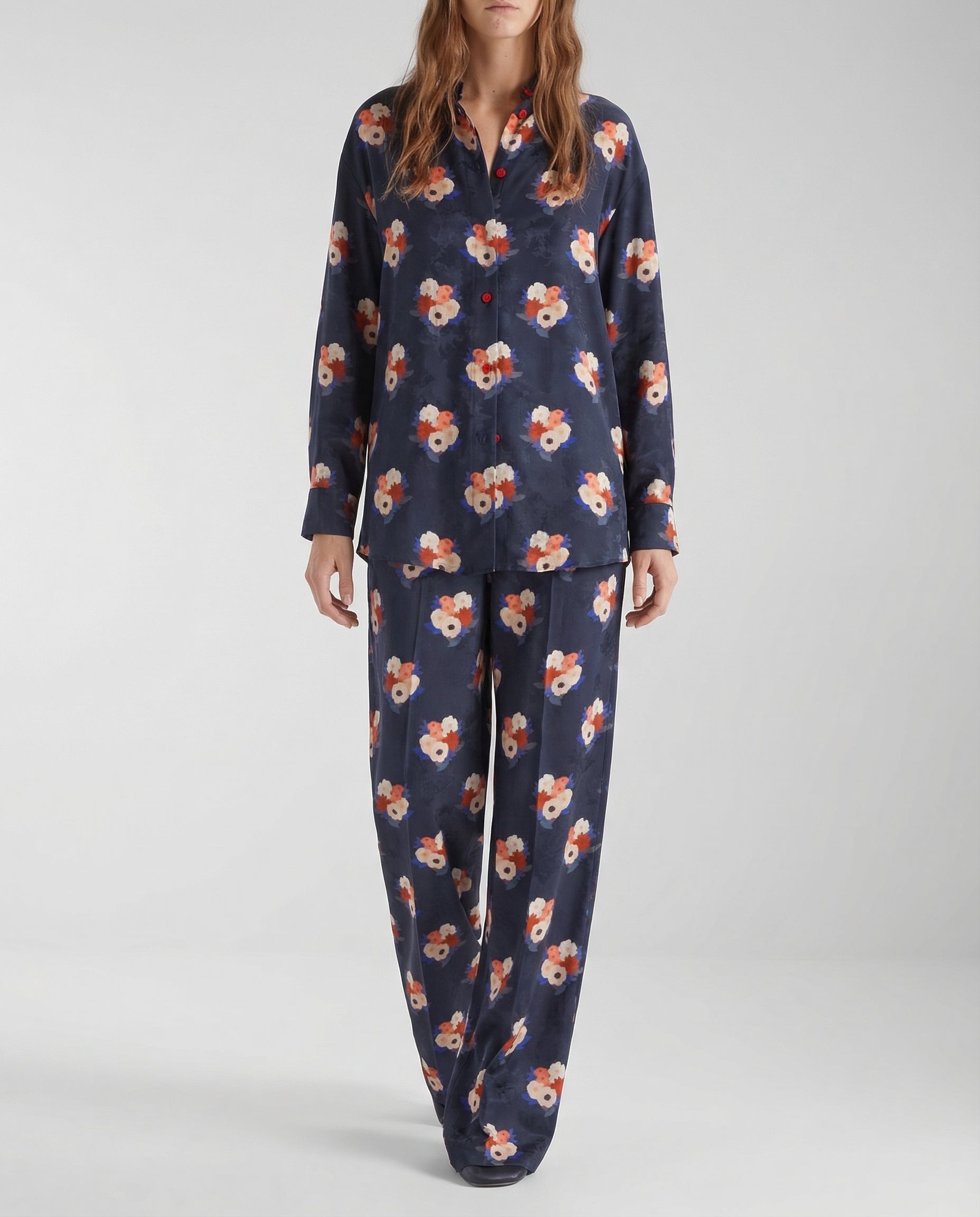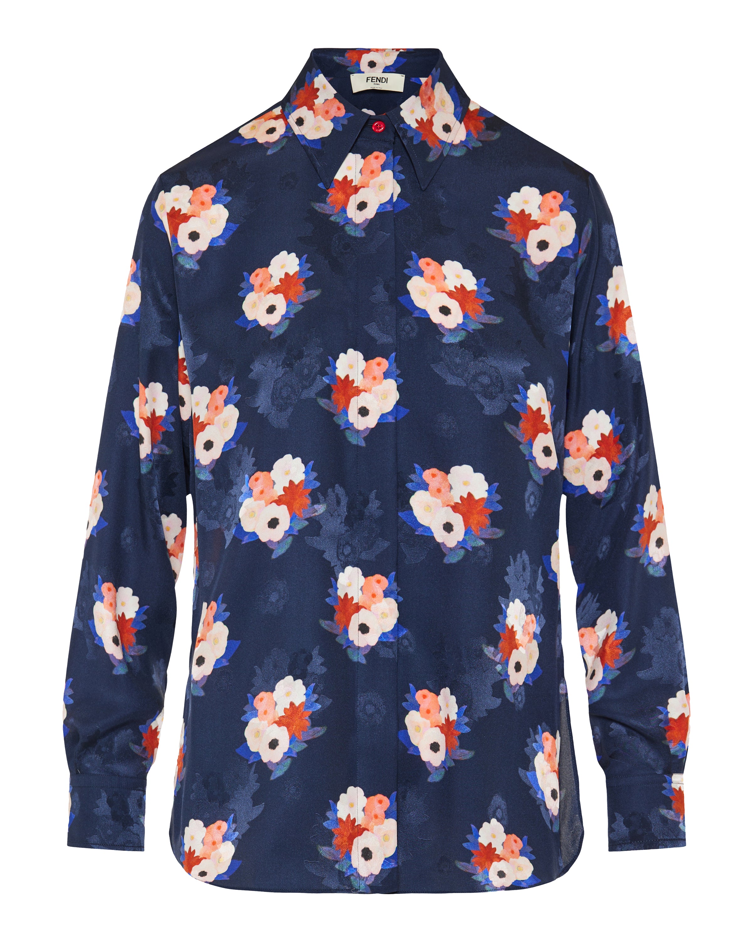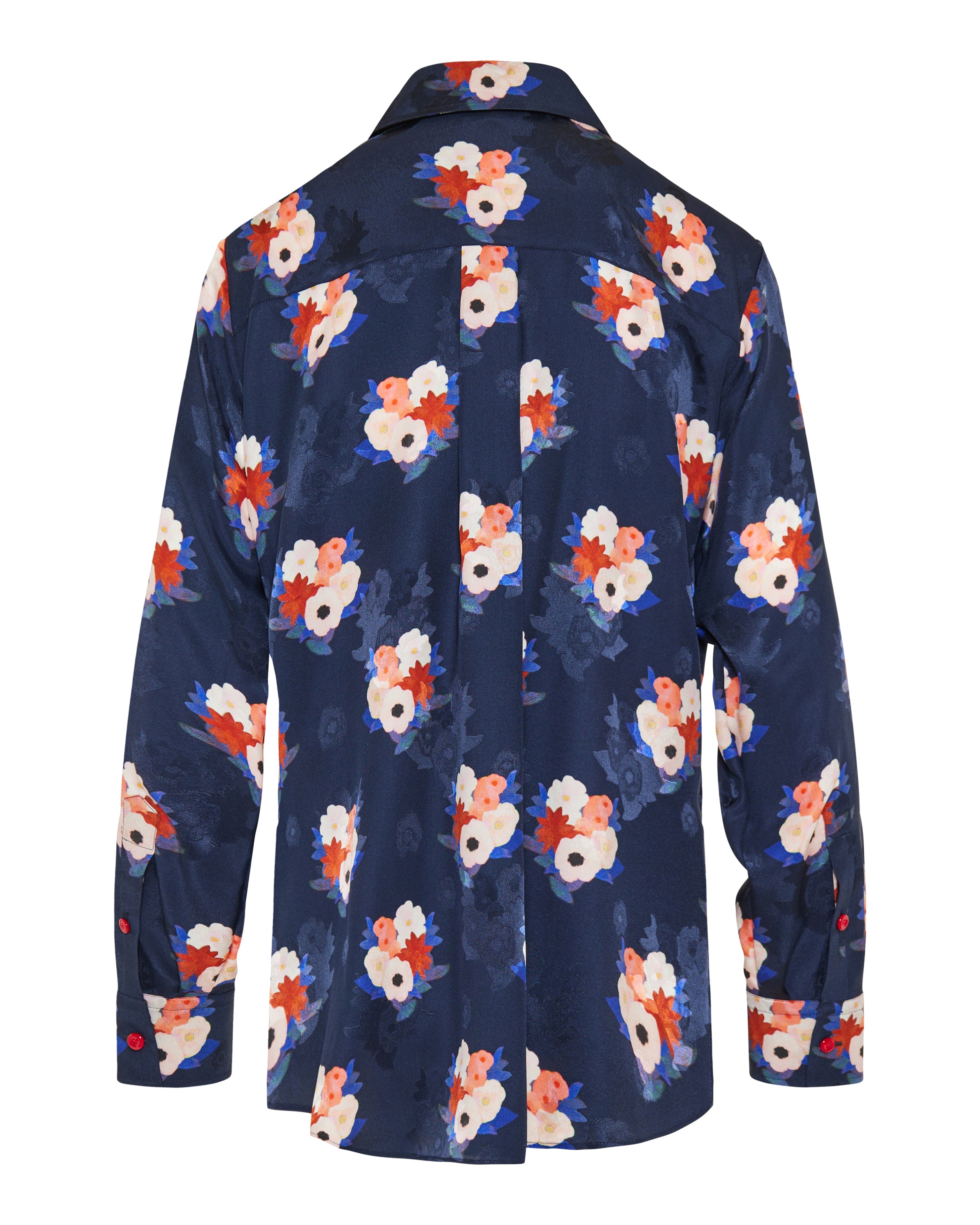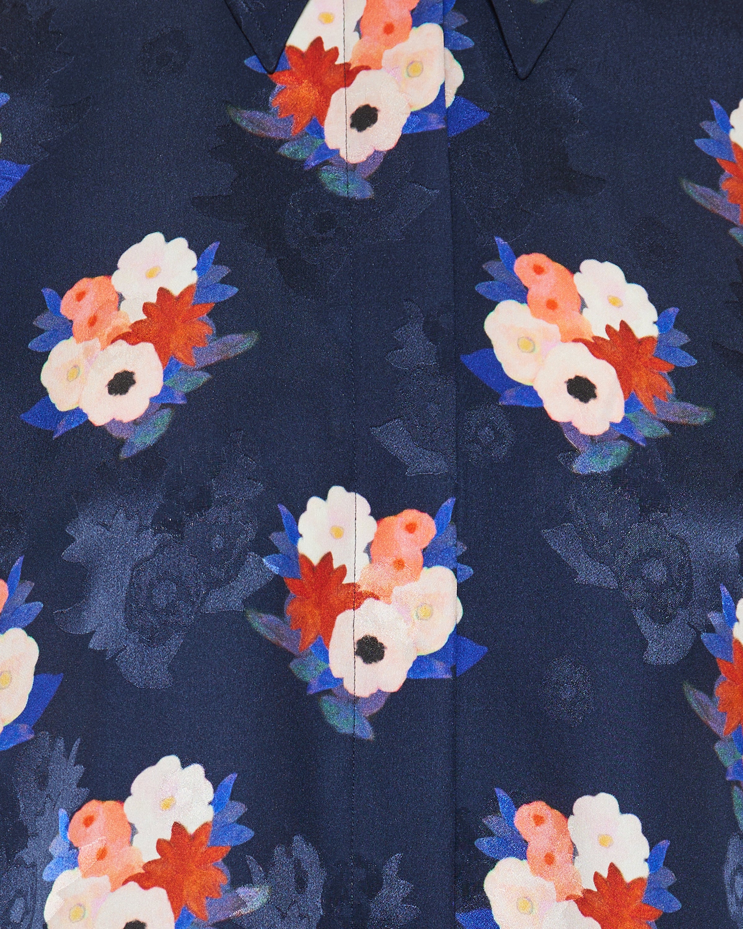 A fluid silk shirt featuring an all-over jacquard weave and expressive bouquet motif, finished with a softly tailored silhouette.