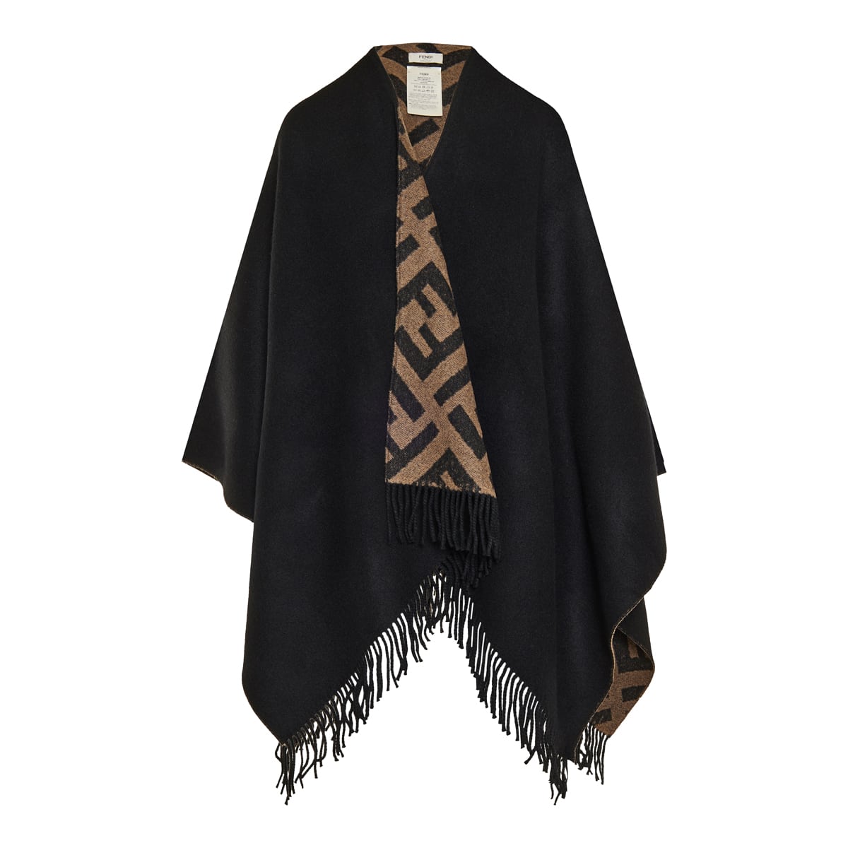 This cape is made from wool and cashmere in a reversible design with one side in solid black and the other in FF theme. It is finished with fringes across the hem.
