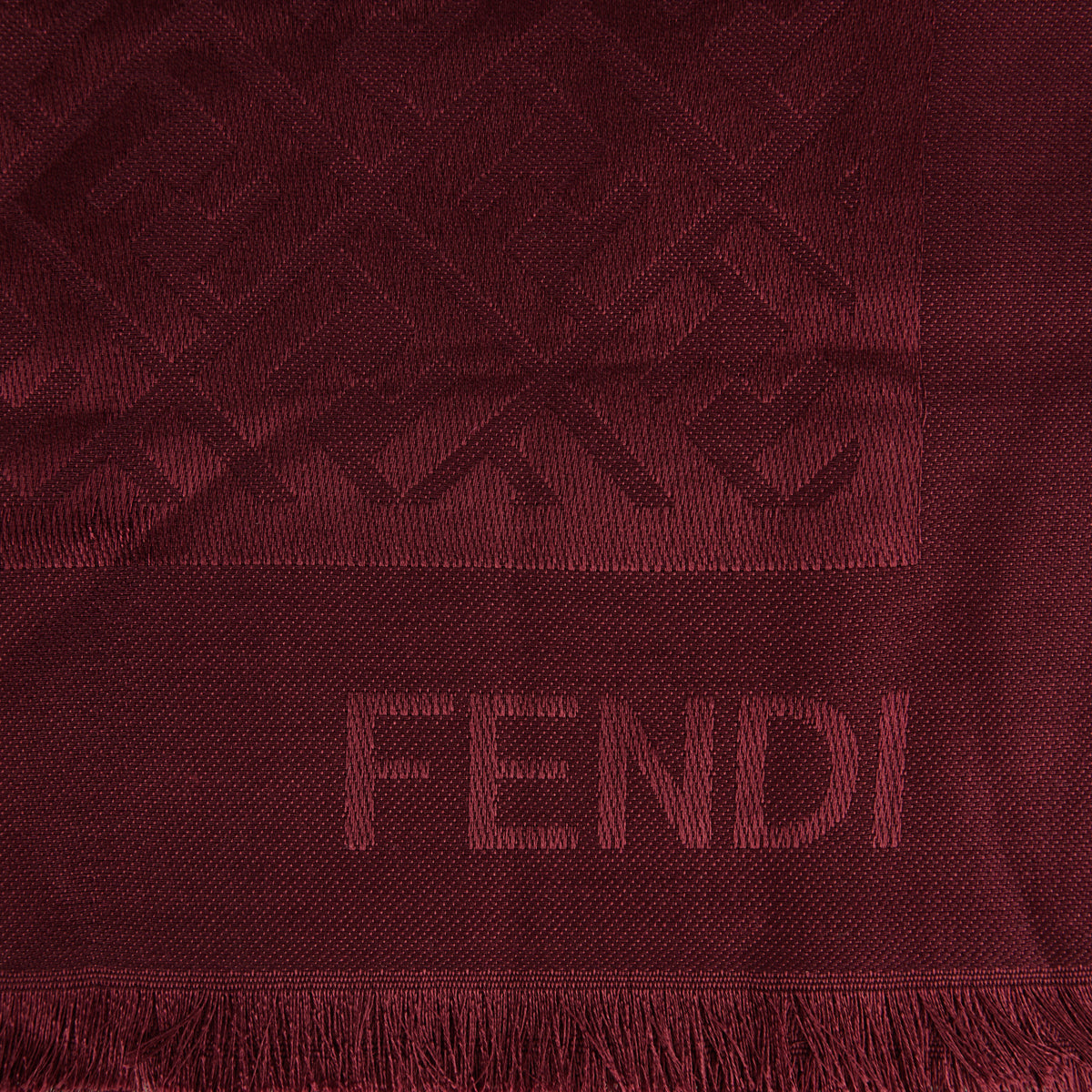 A refined Fendi shawl, expertly woven from a silk-wool blend in a rich burgundy shade. The iconic FF motif is jacquard-woven, giving the piece depth and signature elegance. With its generous 140 × 140 cm size, it wraps comfortably in all seasons — ideal for luxurious layering or chic draping.