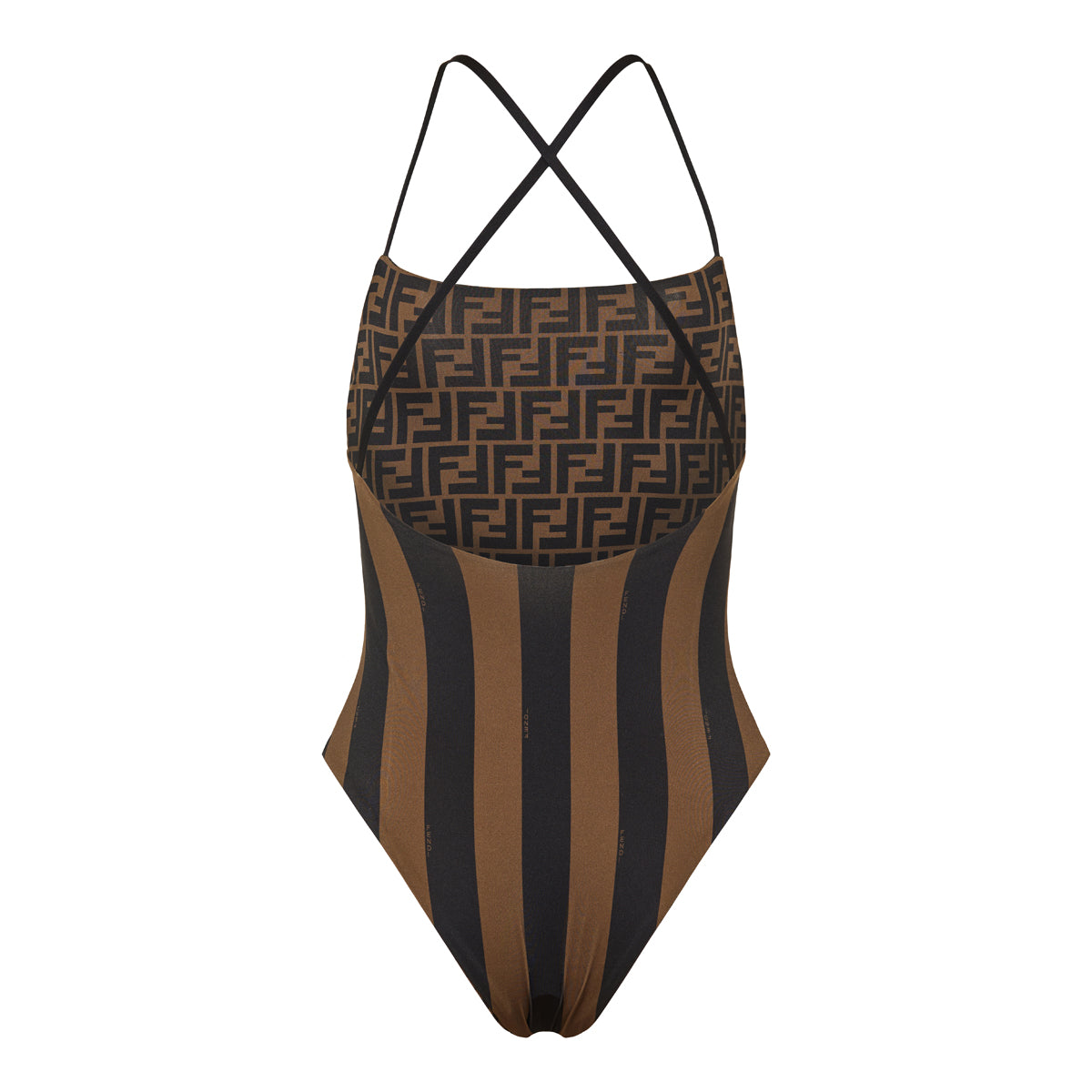 Elevate your swimwear collection with Fendi's Brown Lycra® Reversible Swimsuit. This sophisticated one-piece features a straight neckline and elegant crossover shoulder straps at the back. Crafted in Italy from premium Lycra®, it showcases the iconic brown Pequin stripes on one side and the signature FF motif lining on the reverse, offering versatile styling options. The regular fit ensures comfort and a flattering silhouette, making it an essential piece for discerning wardrobes.