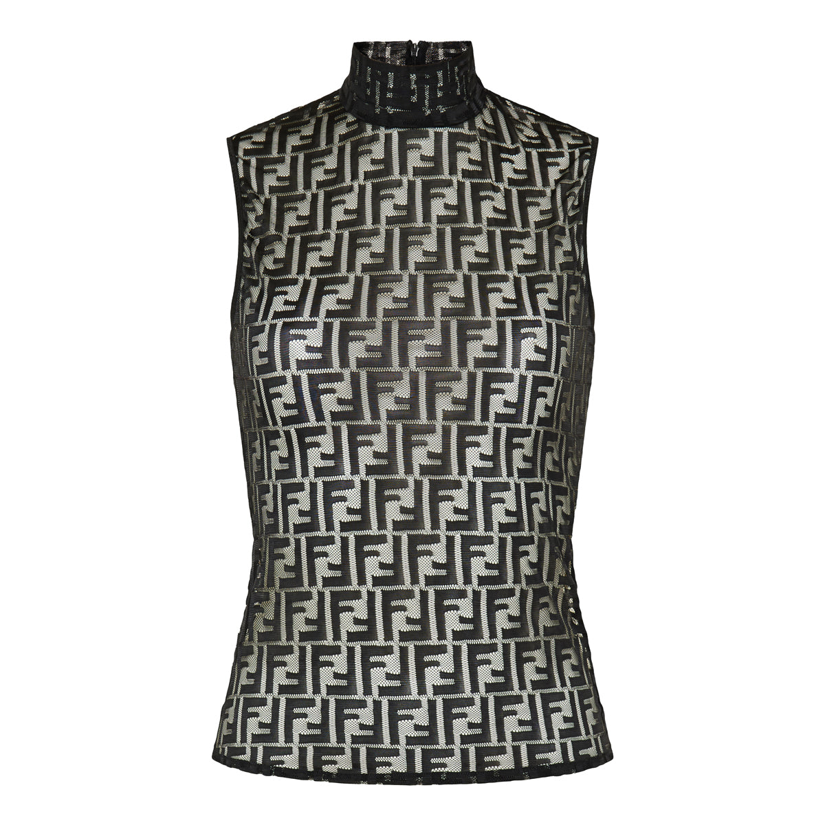 A refined sleeveless top by Fendi, crafted from sheer black jersey lace woven with the iconic FF motif to create a subtle translucent effect. The fitted silhouette and high neck lend sculptural elegance, making it perfect for evening layering or elevated daytime styling. Light, luxurious, and unmistakably Fendi.