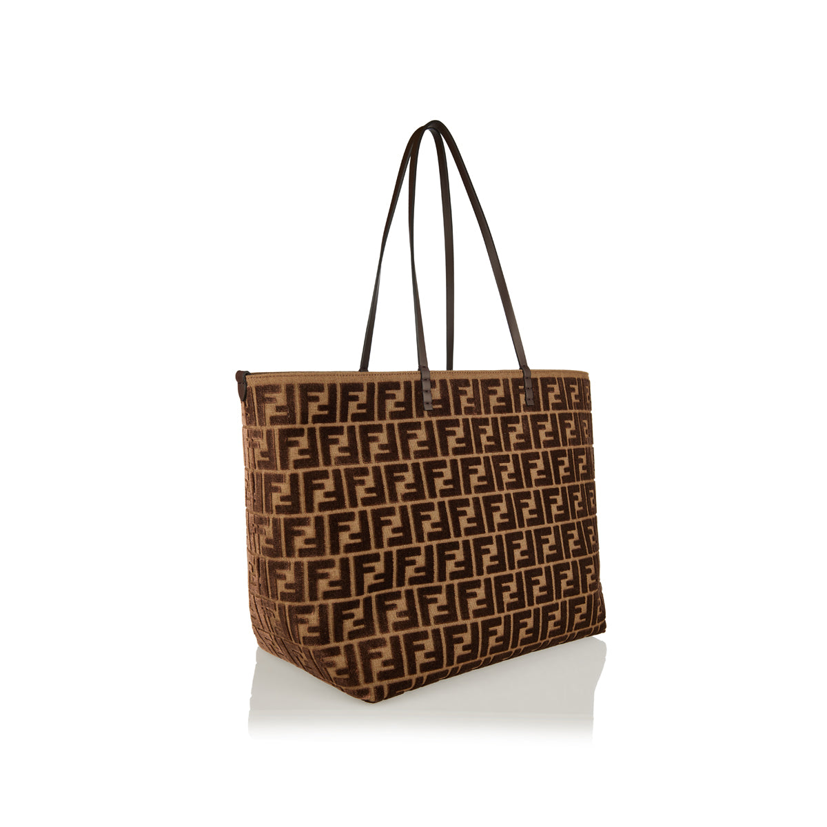 A luxurious tote crafted in soft velvet, featuring the iconic Fendi FF logo pattern. Spacious and structured, it includes two top handles and a removable internal pouch, combining elegance with everyday practicality. Perfect for both casual and refined looks.