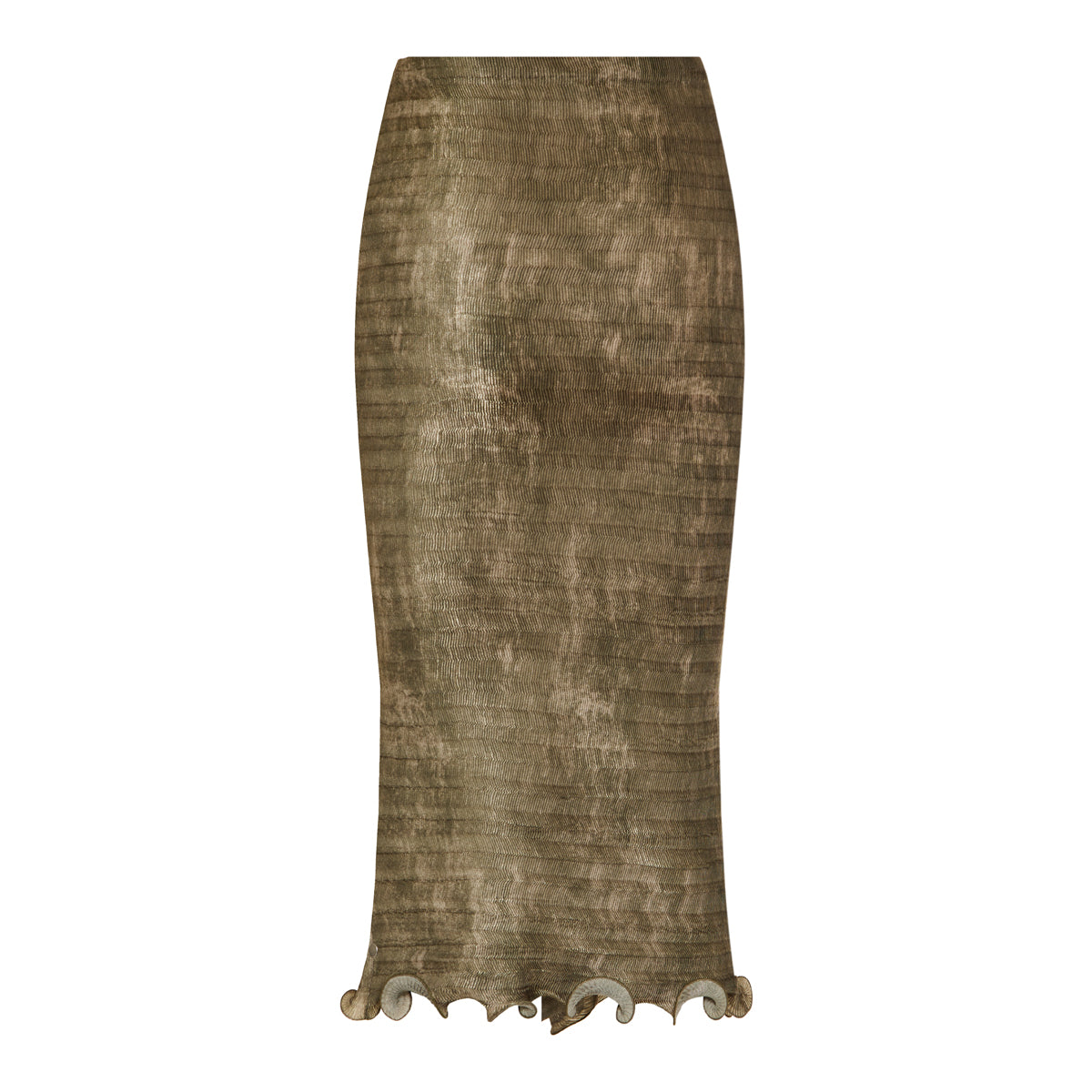 A sophisticated piece from Fendi's collection, this skirt features a high waist, midi length, and an asymmetrical hemline with ruffled details. The abstract gradient print in olive green tones enhances its contemporary appeal, making it a versatile addition to any wardrobe.