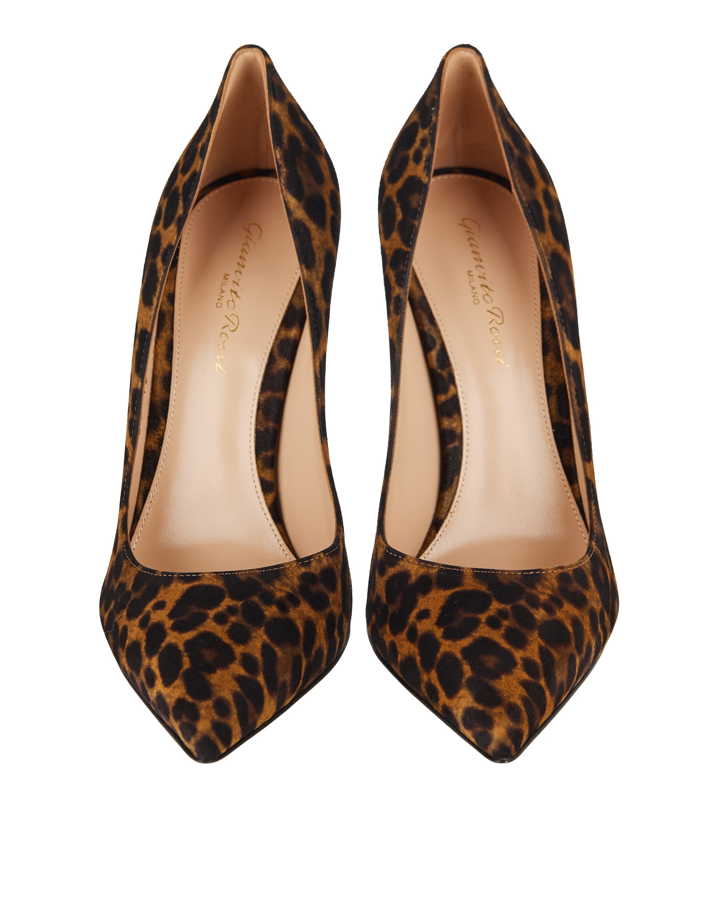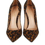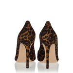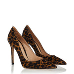 A classic pump silhouette crafted in smooth leather with a leopard-print finish, featuring a sleek pointed toe and elegant mid-height stiletto heel.
