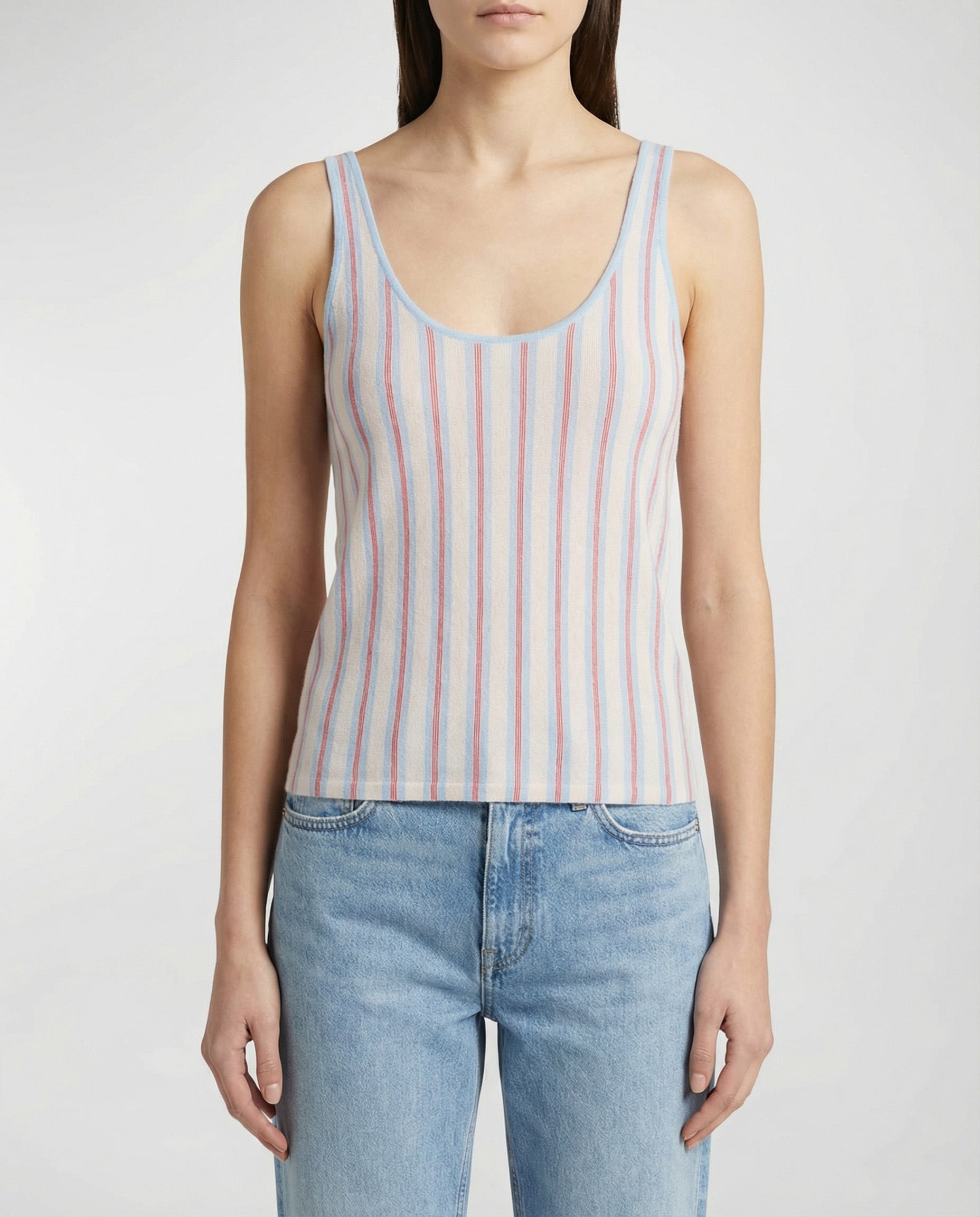 Crafted from luxurious cashmere, this sleeveless silhouette is elevated by timeless stripe detailing, offering a modern balance between comfort and polish.