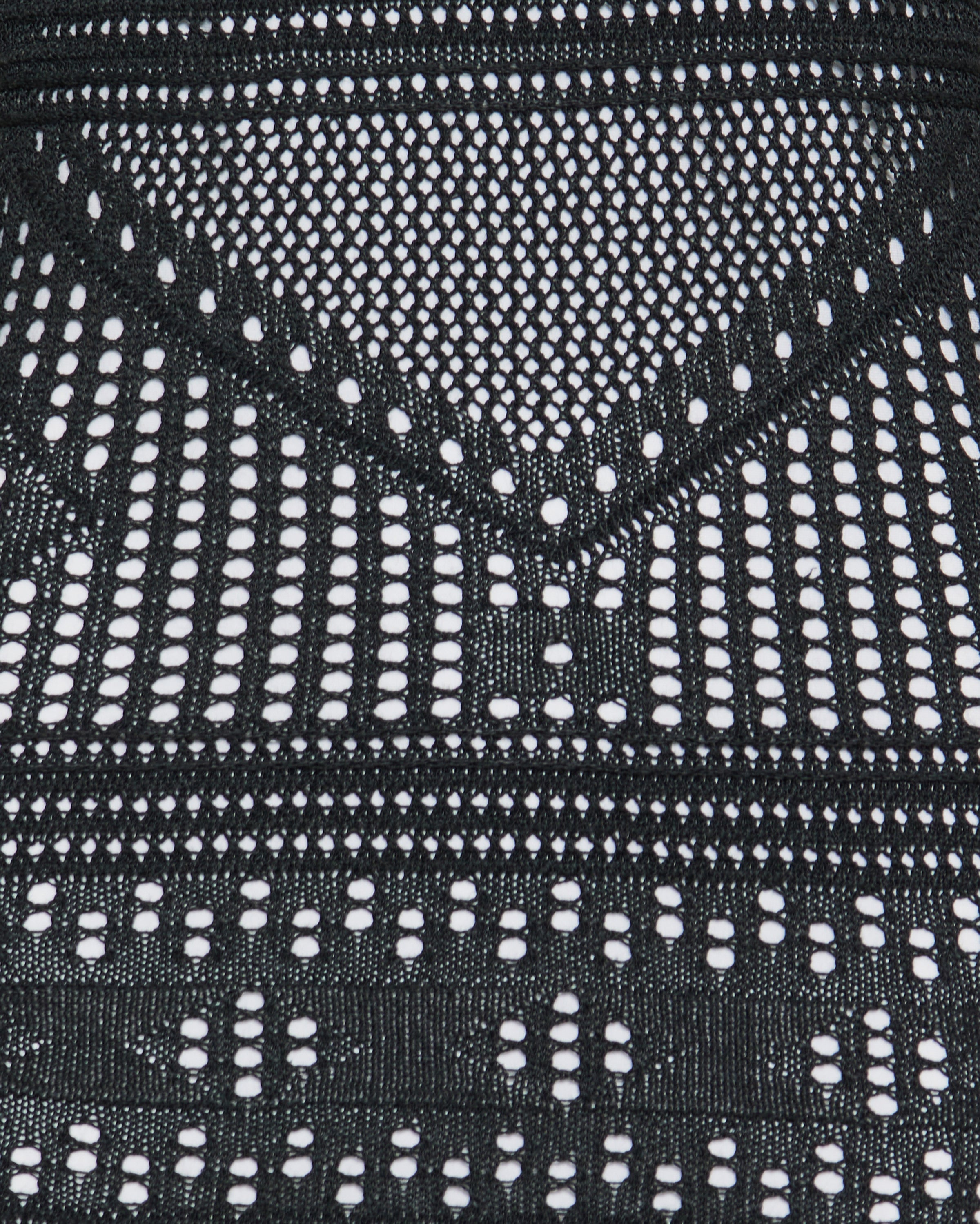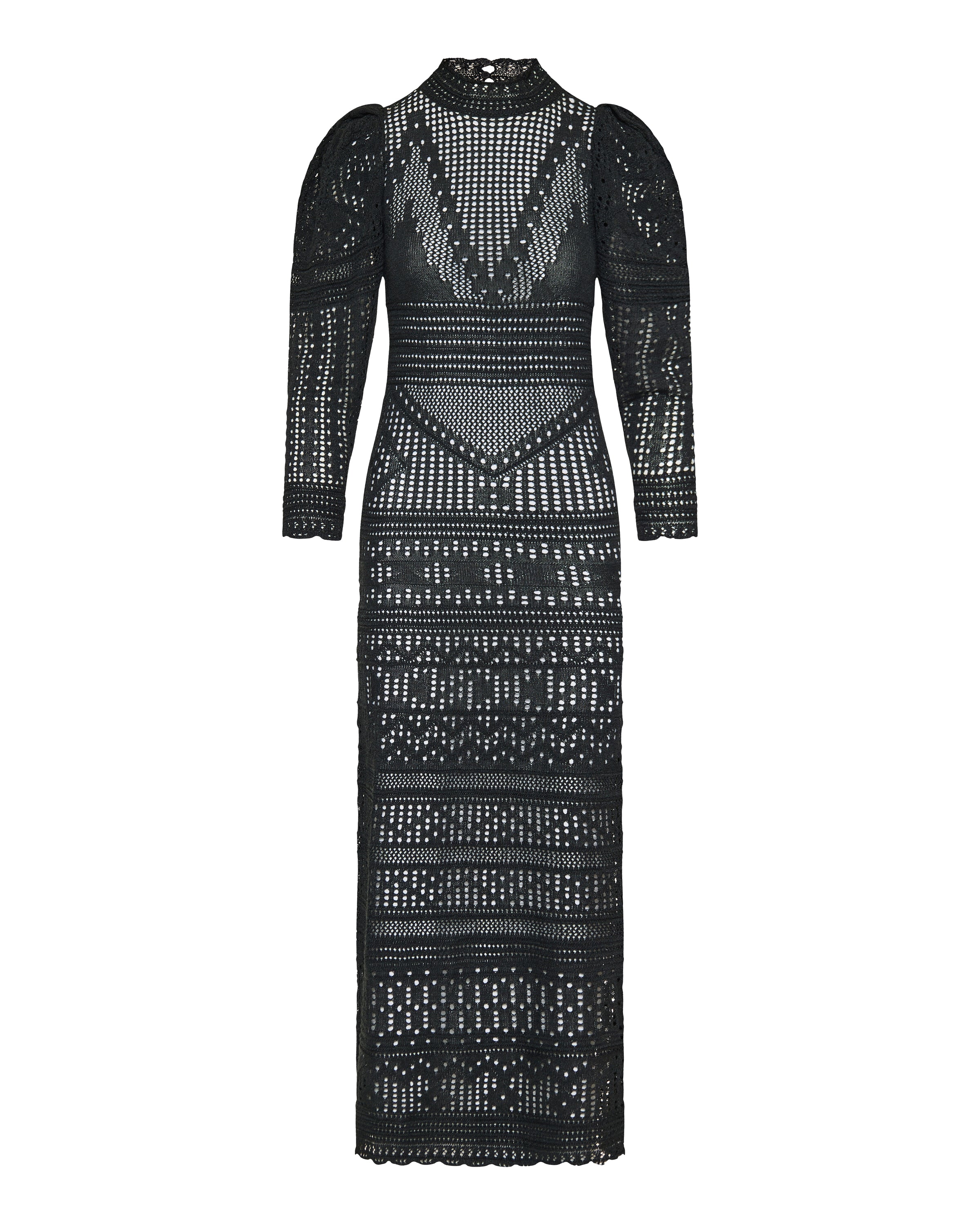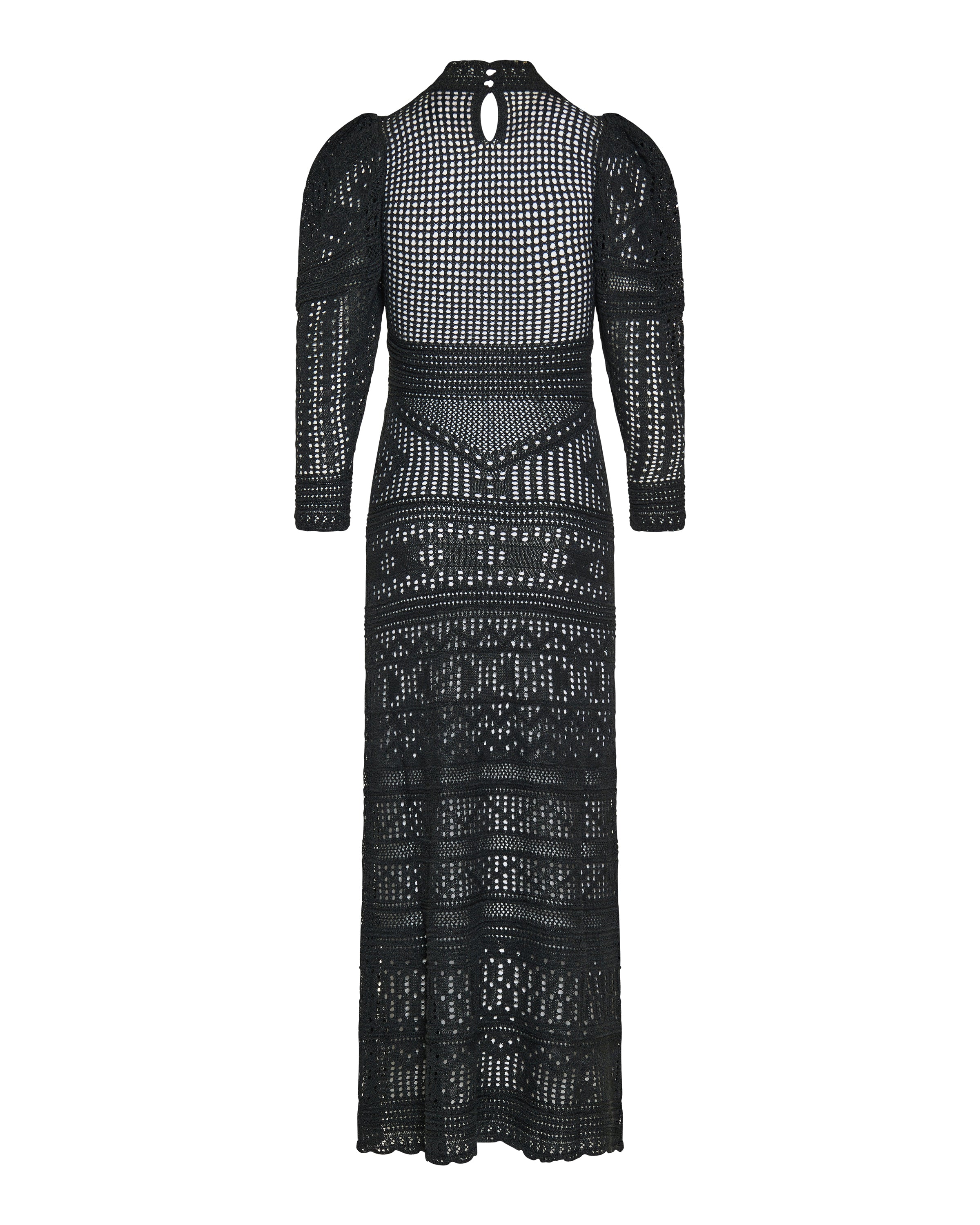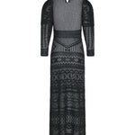 This Isabel Marant long dress is crafted in an intricate openwork knit that plays with transparency and structure. Designed with a fitted silhouette, it features a high neckline, softly puffed shoulders and long sleeves, creating a strong yet feminine profile. The geometric knit pattern runs throughout the body, accentuating the waist and elongating the figure, while the floor-length hem adds dramatic elegance.