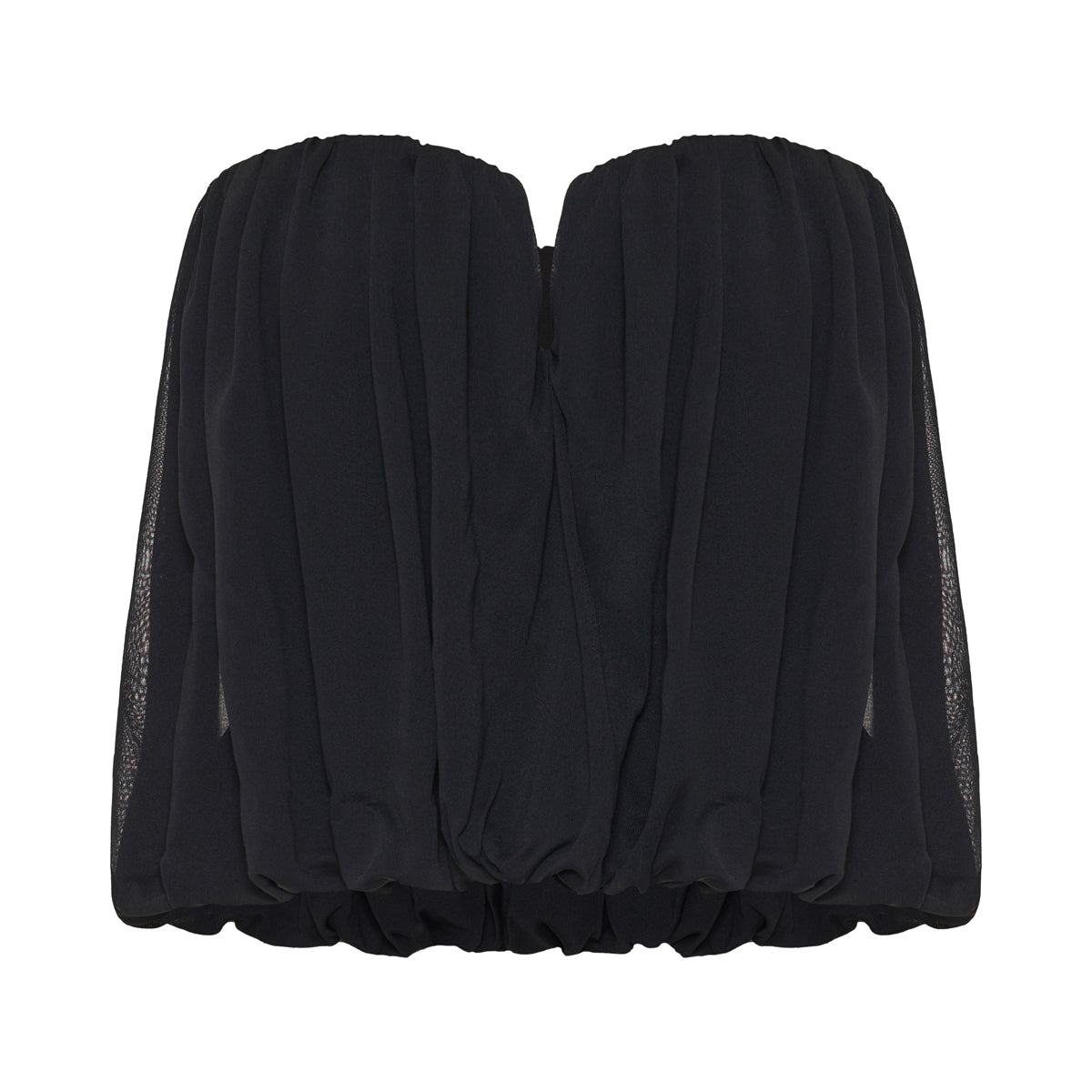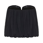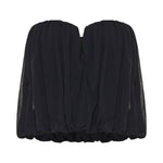 This strapless cropped top is crafted from stretch-jersey, featuring a notched neckline and gathered detailing that creates a textured, voluminous effect. The bubble hem, slightly longer at the back, adds dimension, while internal gumming ensures a secure fit.