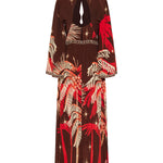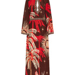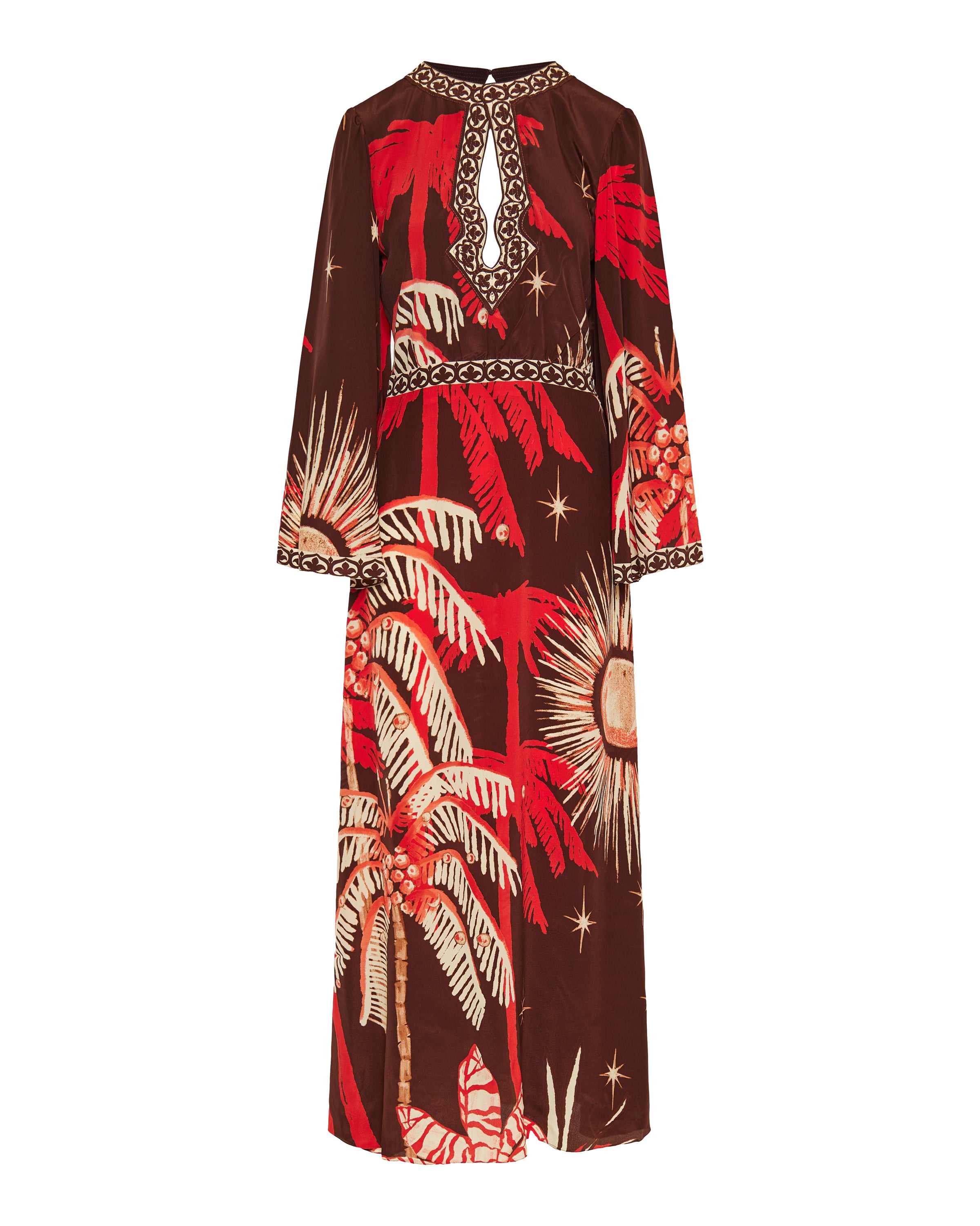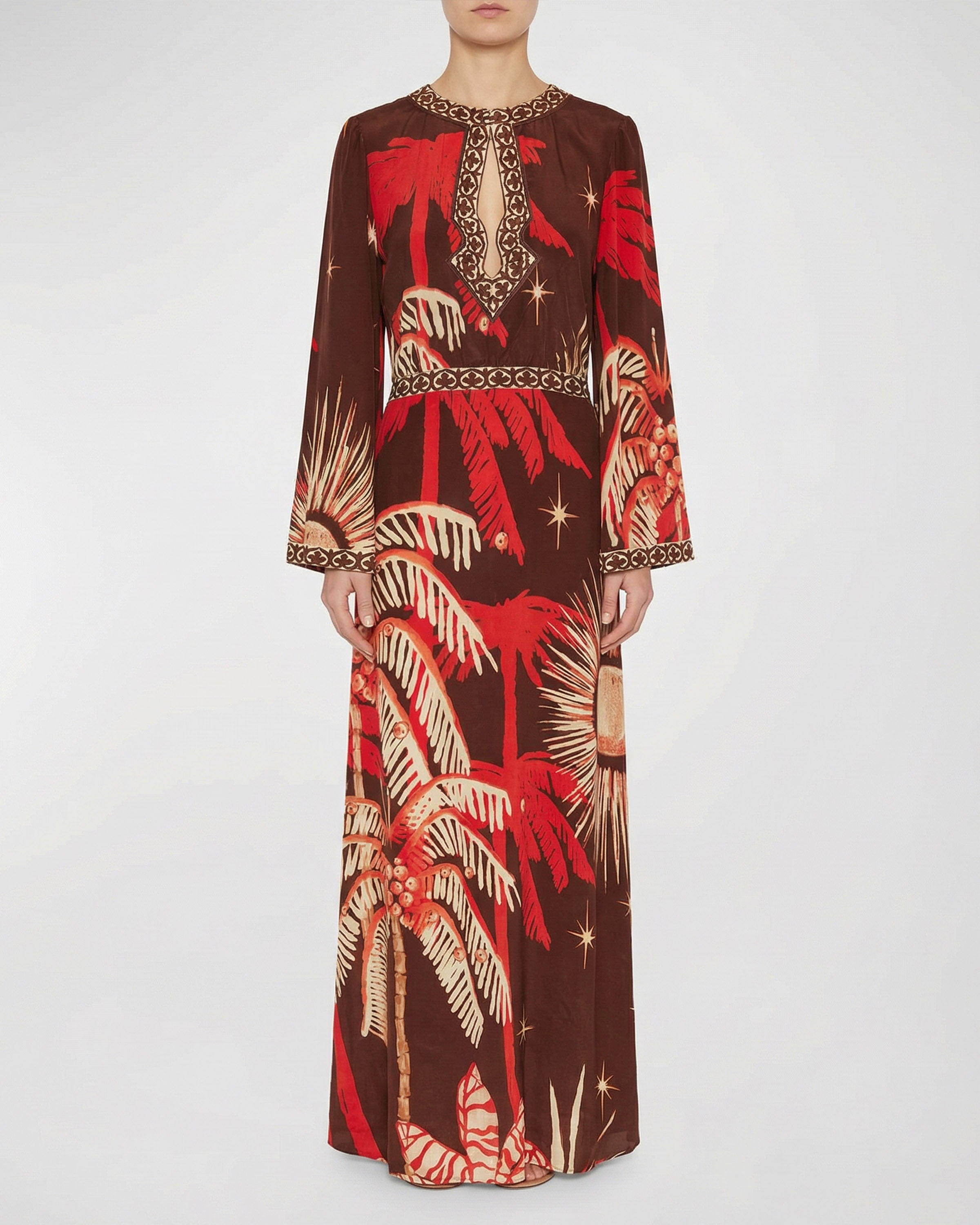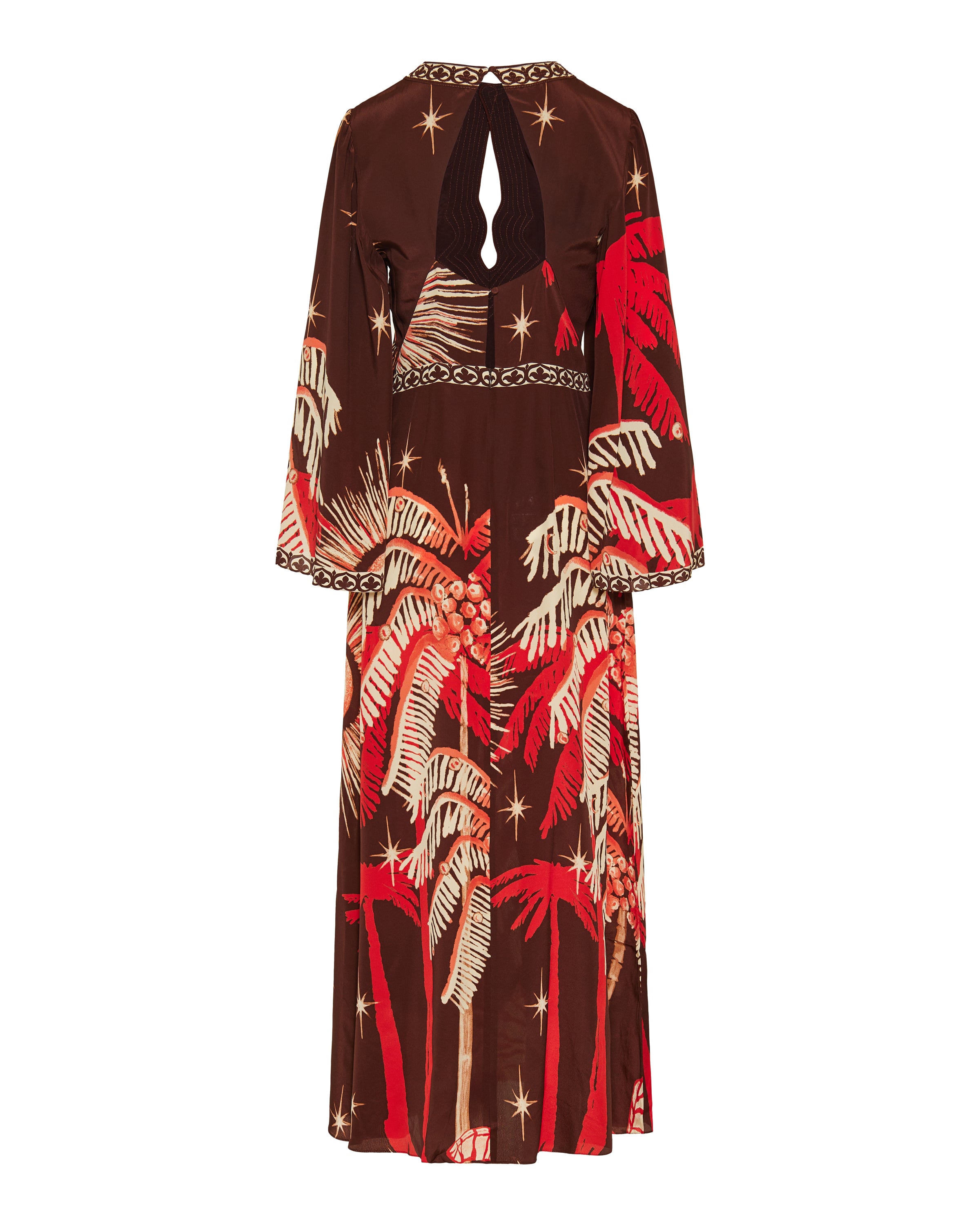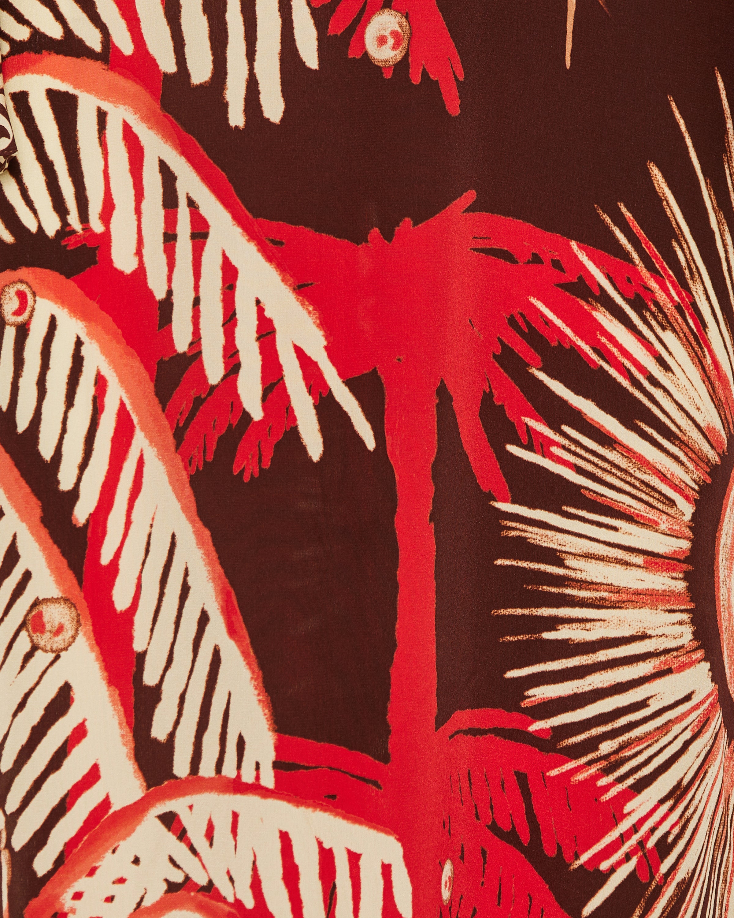 Maxi dress crafted from silk and printed with one of the collection’s signature palm motifs. Designed with long sleeves and a fluid silhouette, it’s an effortless piece that transitions beautifully from daytime gatherings to evening occasions.
