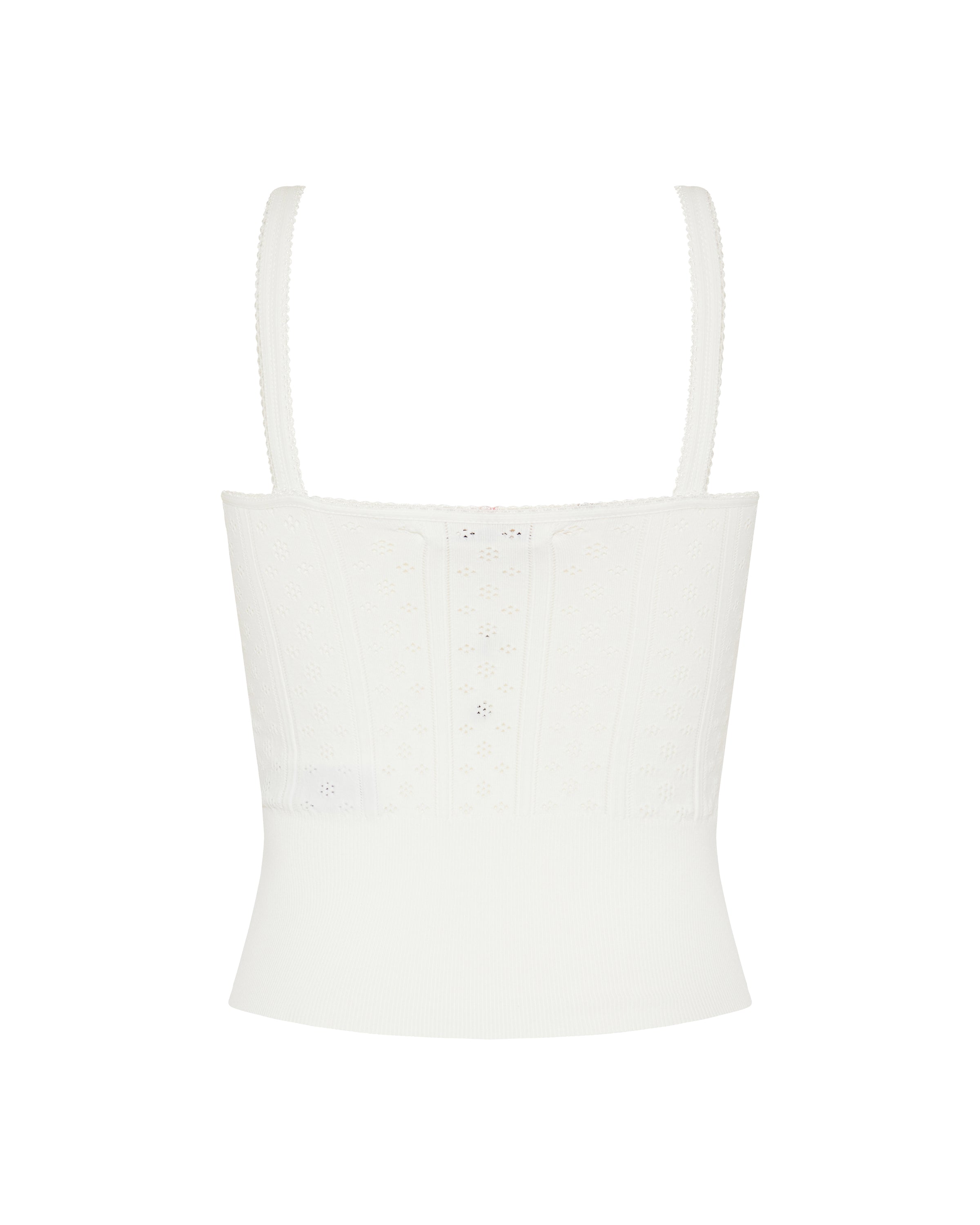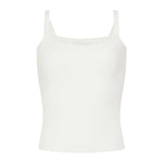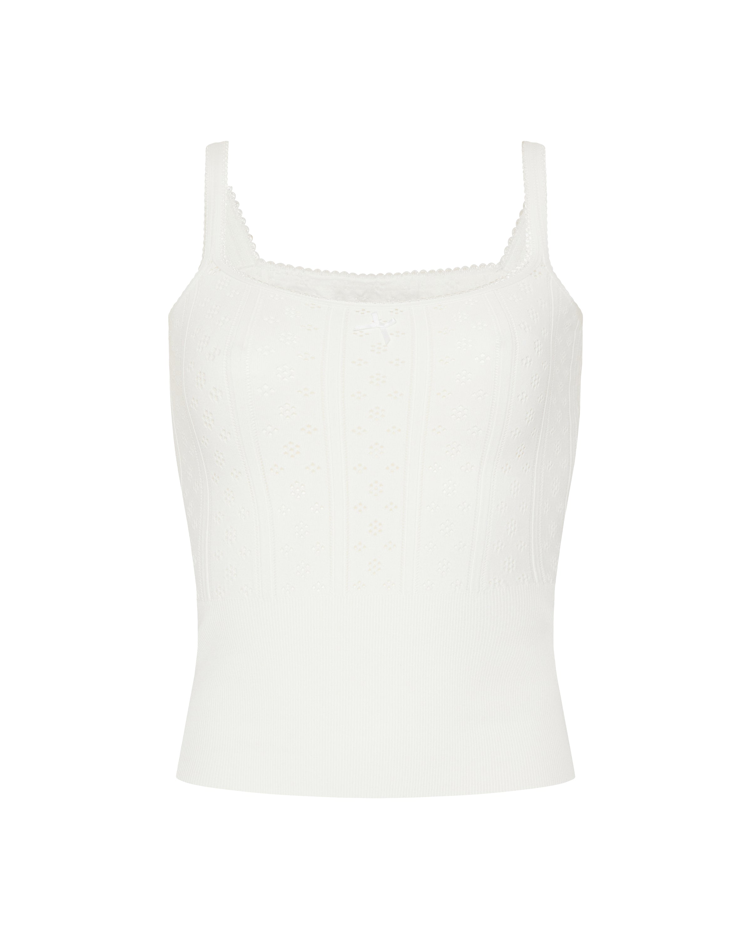 A refined cami top in soft recycled cotton pointelle knit, featuring a delicate, lightweight texture. Designed for elevated casual and refined daytime wear, it combines sustainable materials with a feminine, relaxed silhouette. Ideal for chic layering or standalone styling.