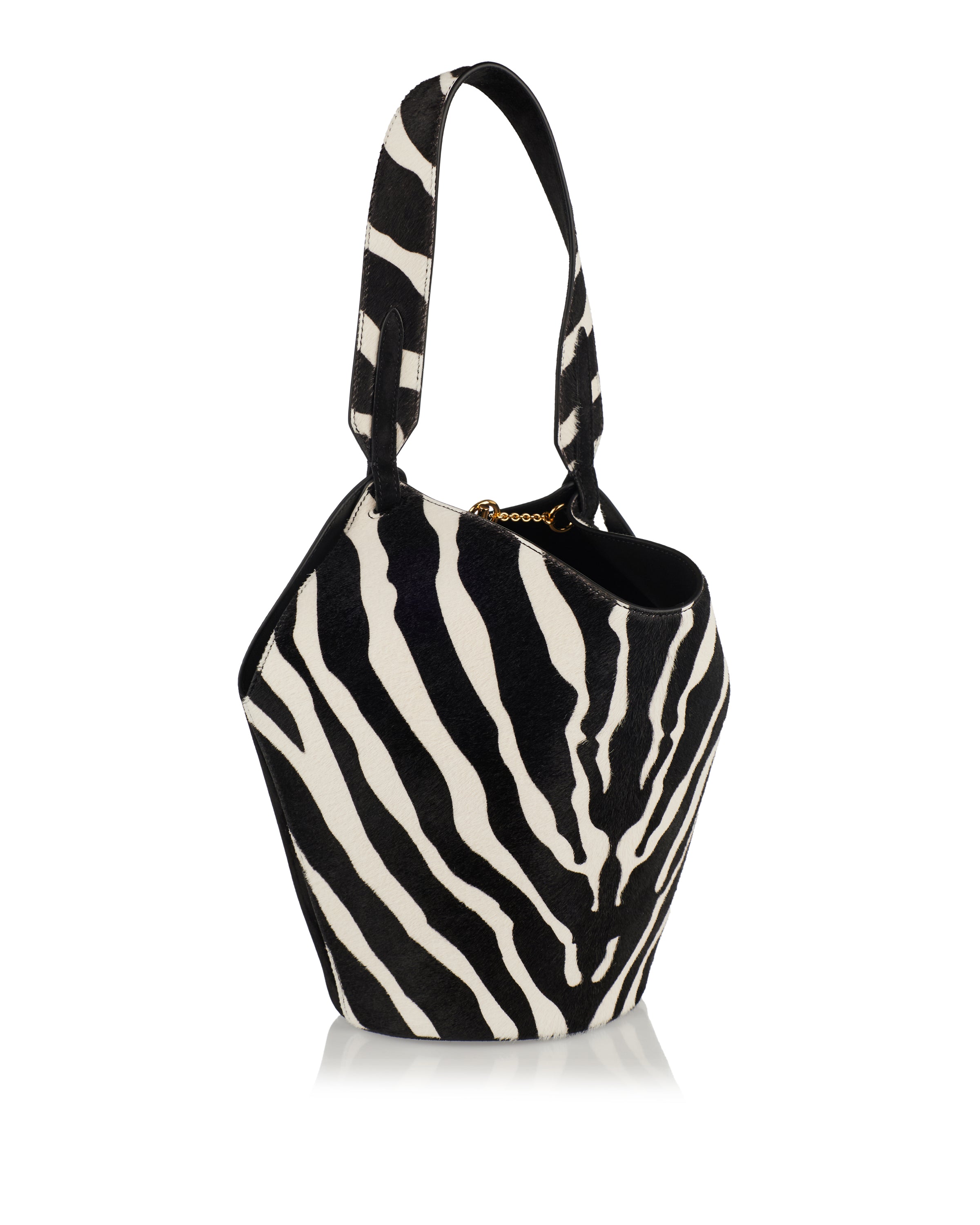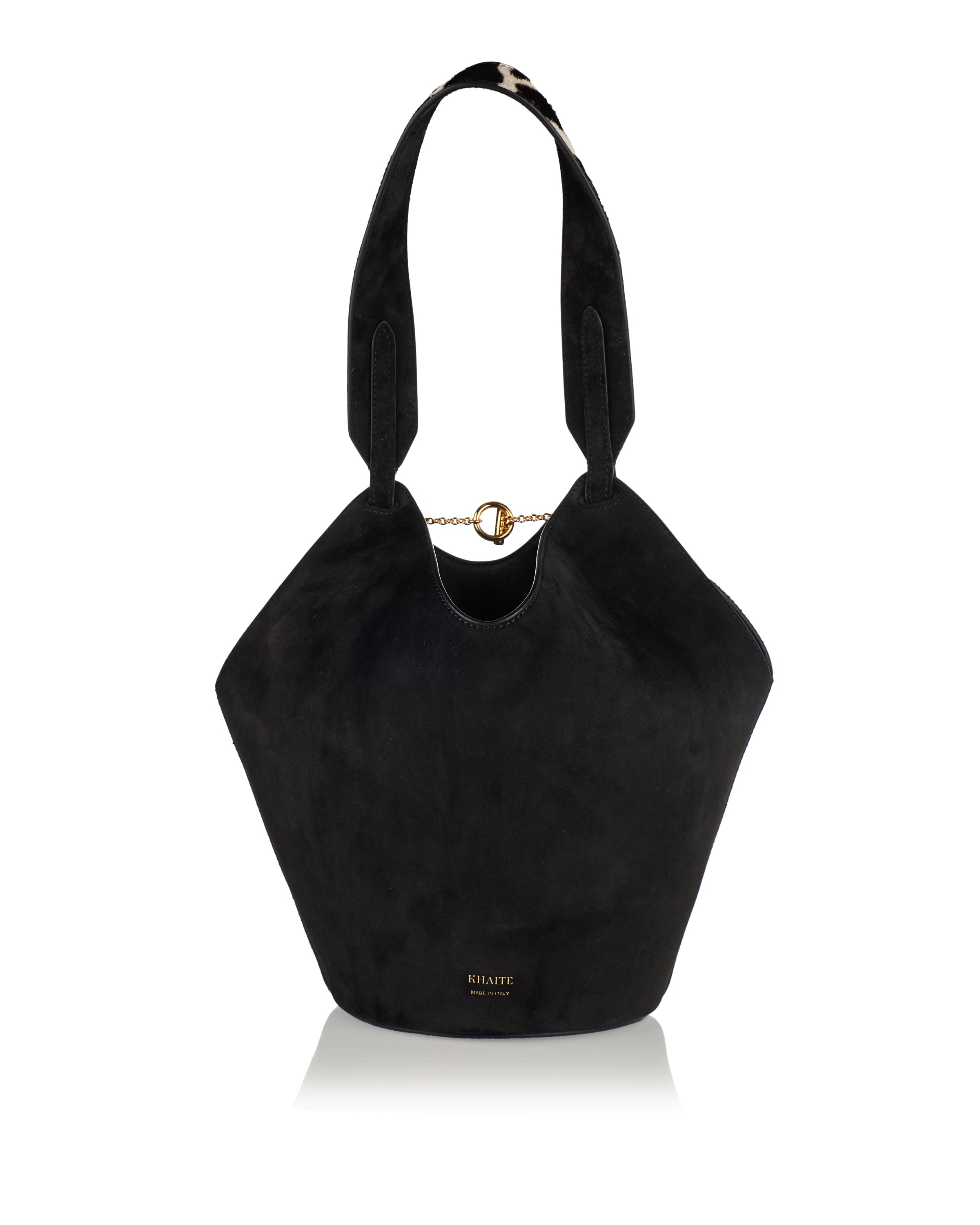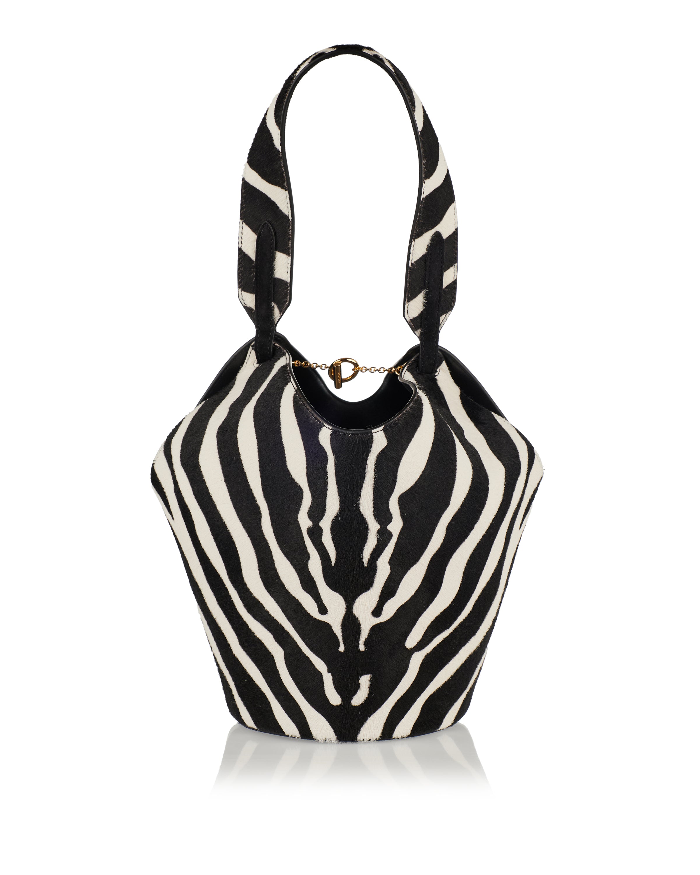 An effortlessly sculptural mini tote from Khaite inspired by the fluidity of a scarf, crafted in contrasting zebra‑print calf hair and black suede. The rounded base and slim top handle create a refined silhouette, while the leather lining and open‑top with T‑bar fastening provide practicality for essentials like phone, keys and sunglasses. Ideal for elevated daywear or polished city looks.