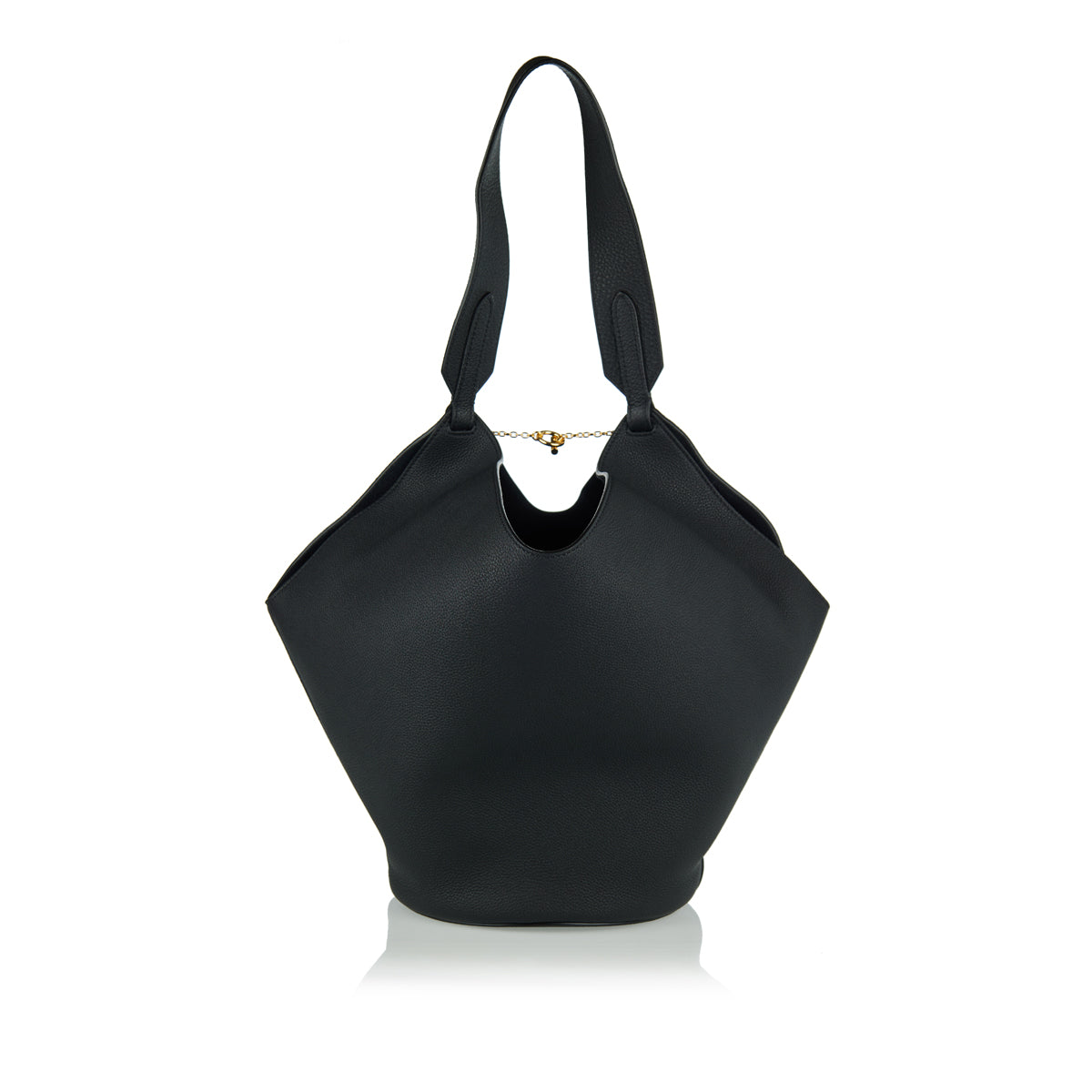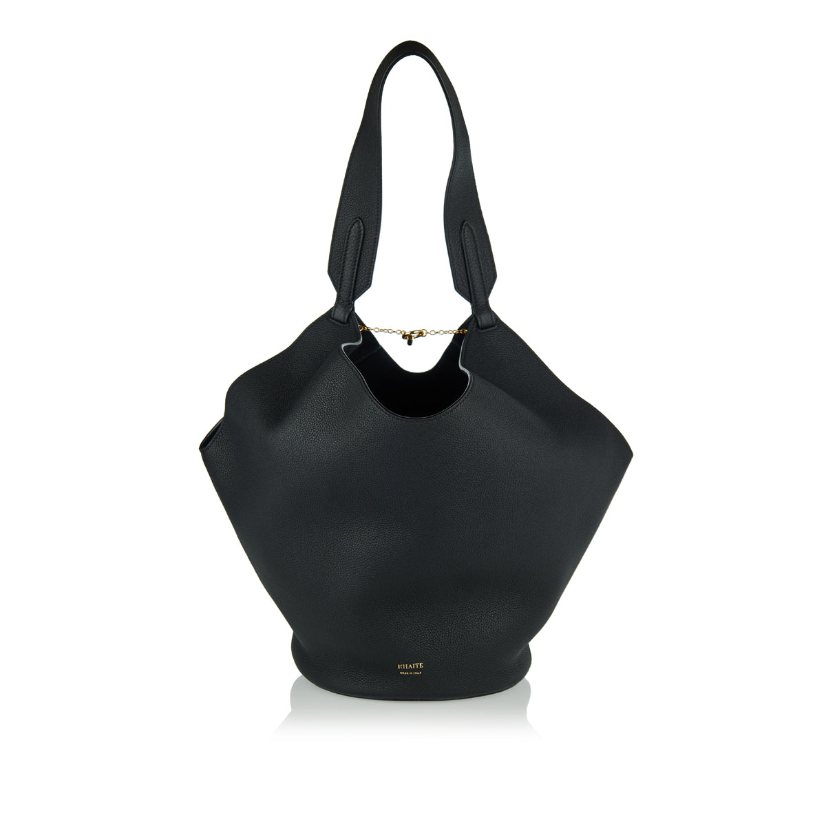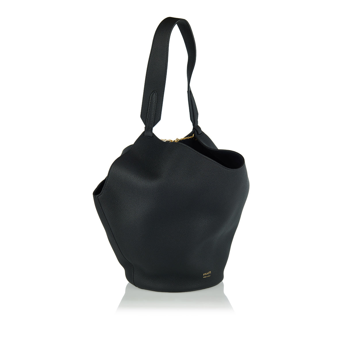 This Khaite Lotus small leather tote offers artful minimalism with utility, ideal for elegant daytime wear or refined travel. Sculpted from pebbled calfskin with a rounded base, it features a single shoulder strap, metal toggle closure, and clean silhouette that elevates any ensemble.