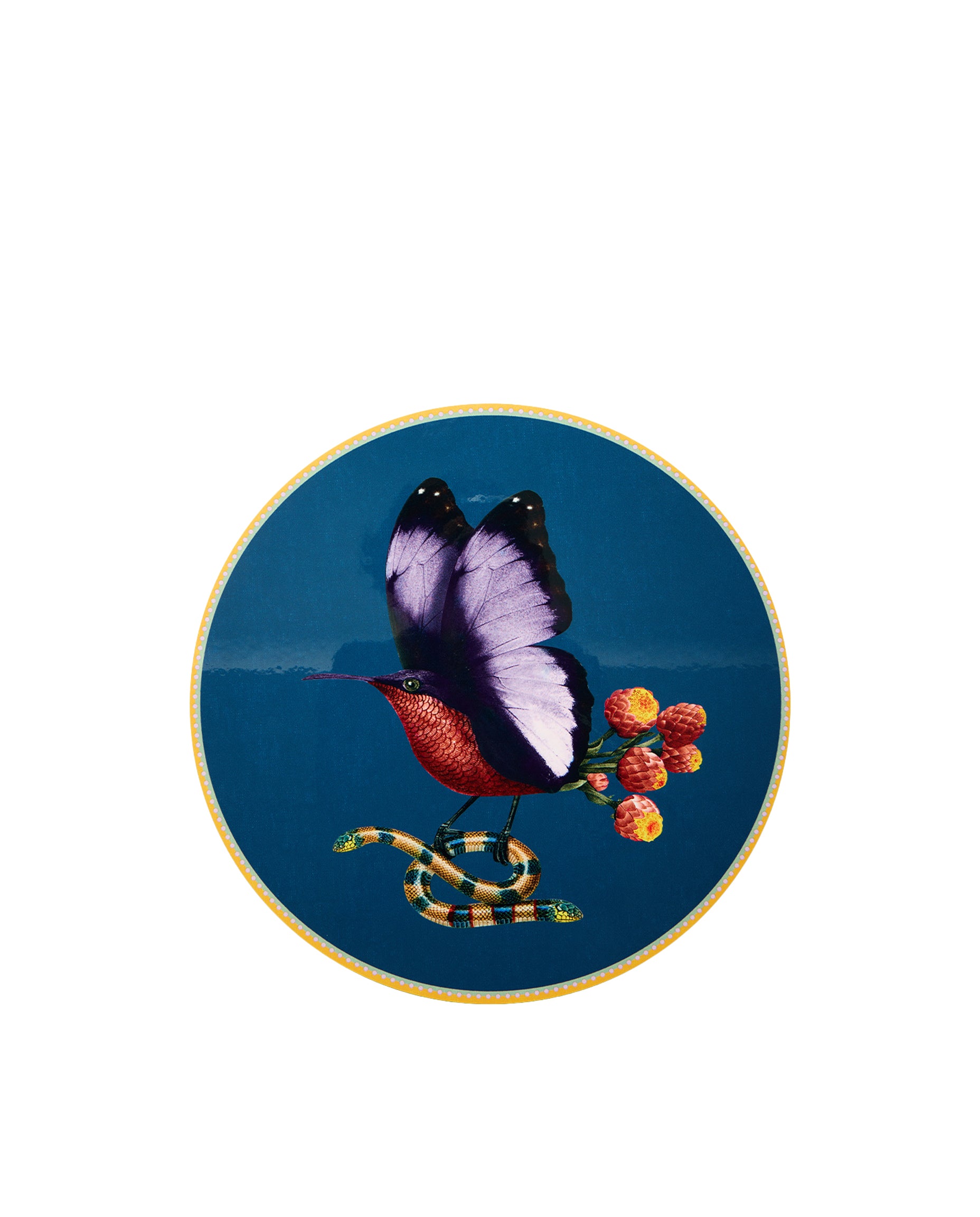 Round placemat defined by the Butterbird motif and a refined navy palette, designed to bring character and playful sophistication to the table.