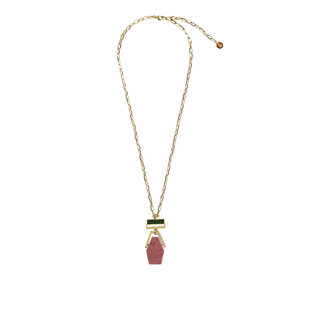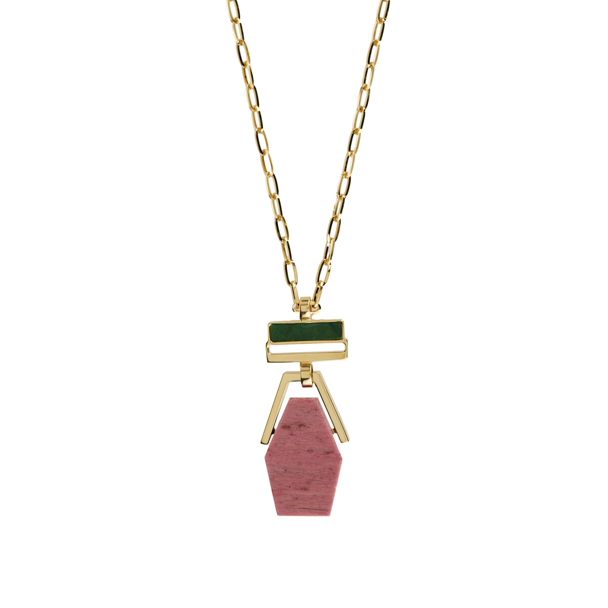 An elegant pendant necklace that blends bold design with refined craftsmanship. The 24 K gold-plated brass chain supports a striking red jasper drop, giving the piece a distinctive mix of warmth and sophistication. Perfect for elevated daytime wear or as a statement accessory for evening outfits — a timeless touch of luxury with subtle artisanal character.