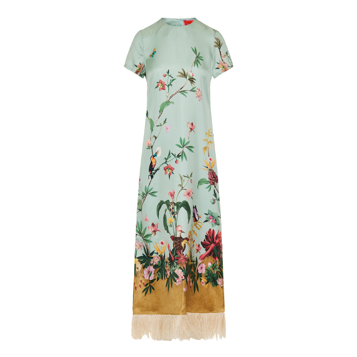 The La DoubleJ swing dress Zooflora Placée blends effortless ease with striking elegance — crafted in silk twill with a flowing A‑line cut and trimmed with delicate ostrich feathers at the hem. Slim at the shoulders and generous at the hips, it drapes comfortably yet luxuriously, ideal for chic daytime outings or stylish evening events with a couture‑inflected finish.