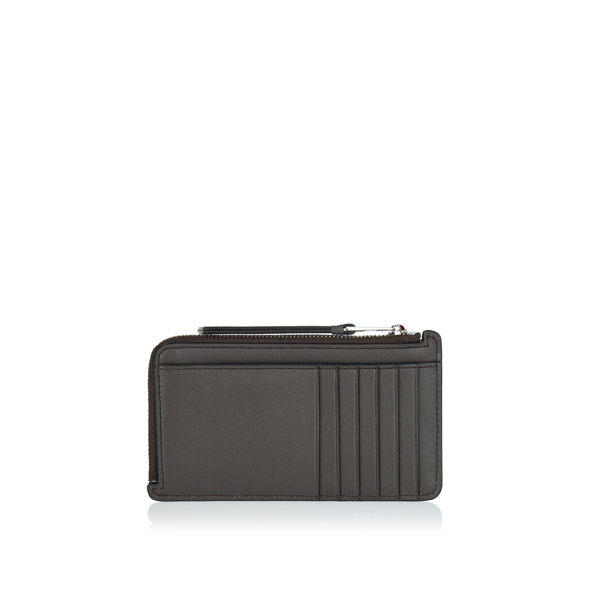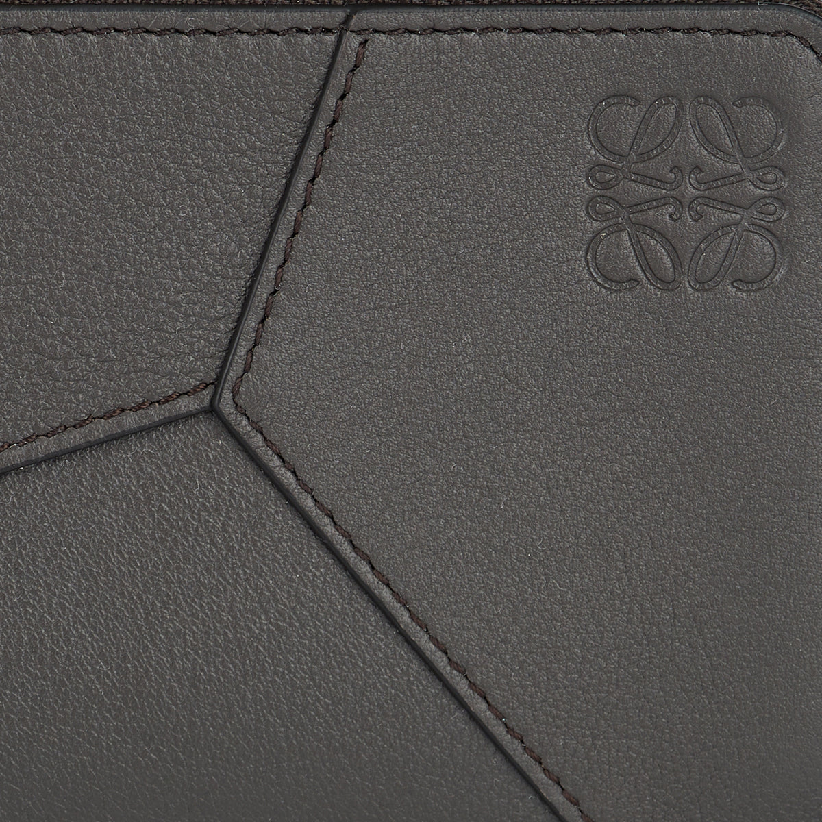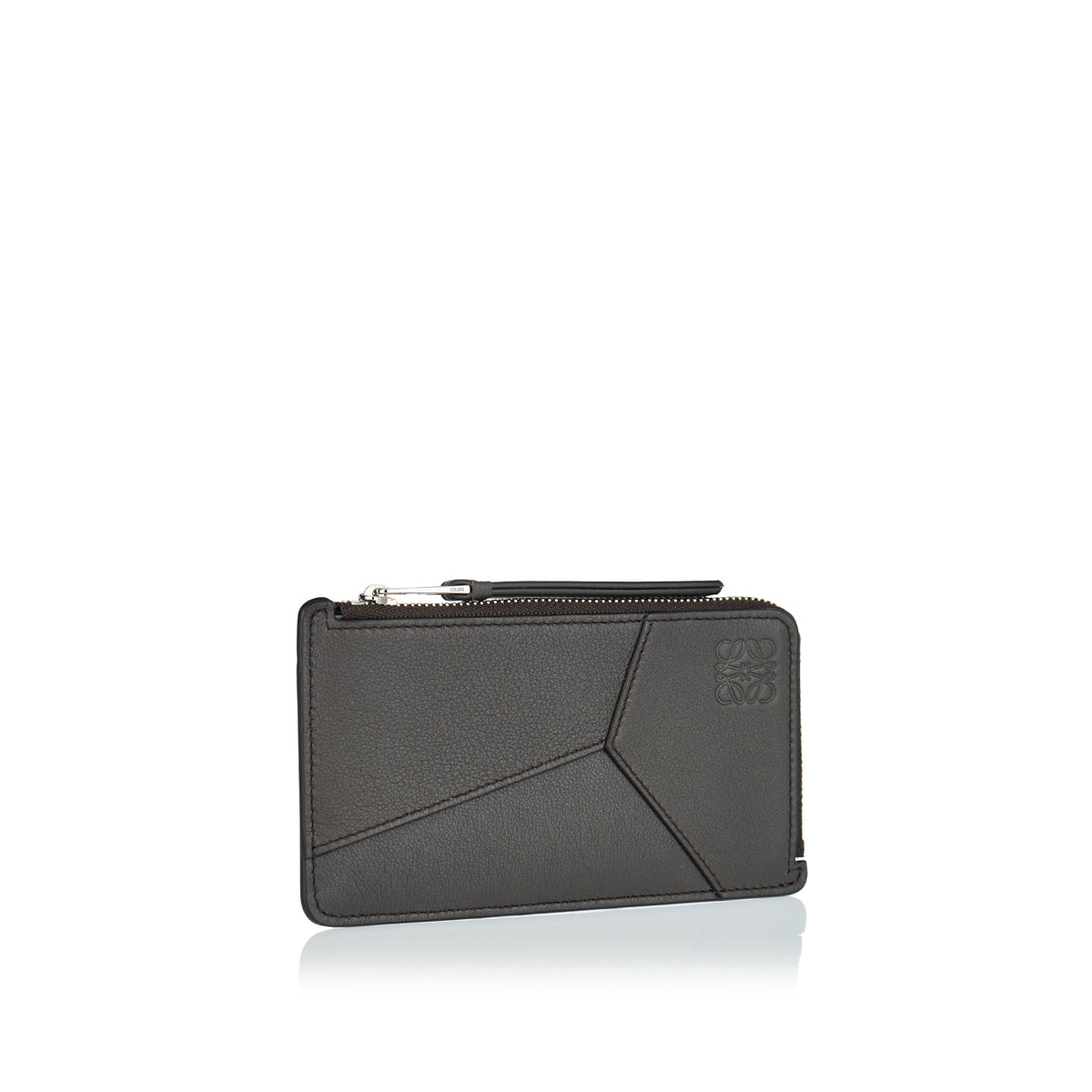 This Loewe coin card case in dark grey calfskin inspired by the signature Puzzle bag features zip coin compartment, six card slots and embossed Anagram at the front.
