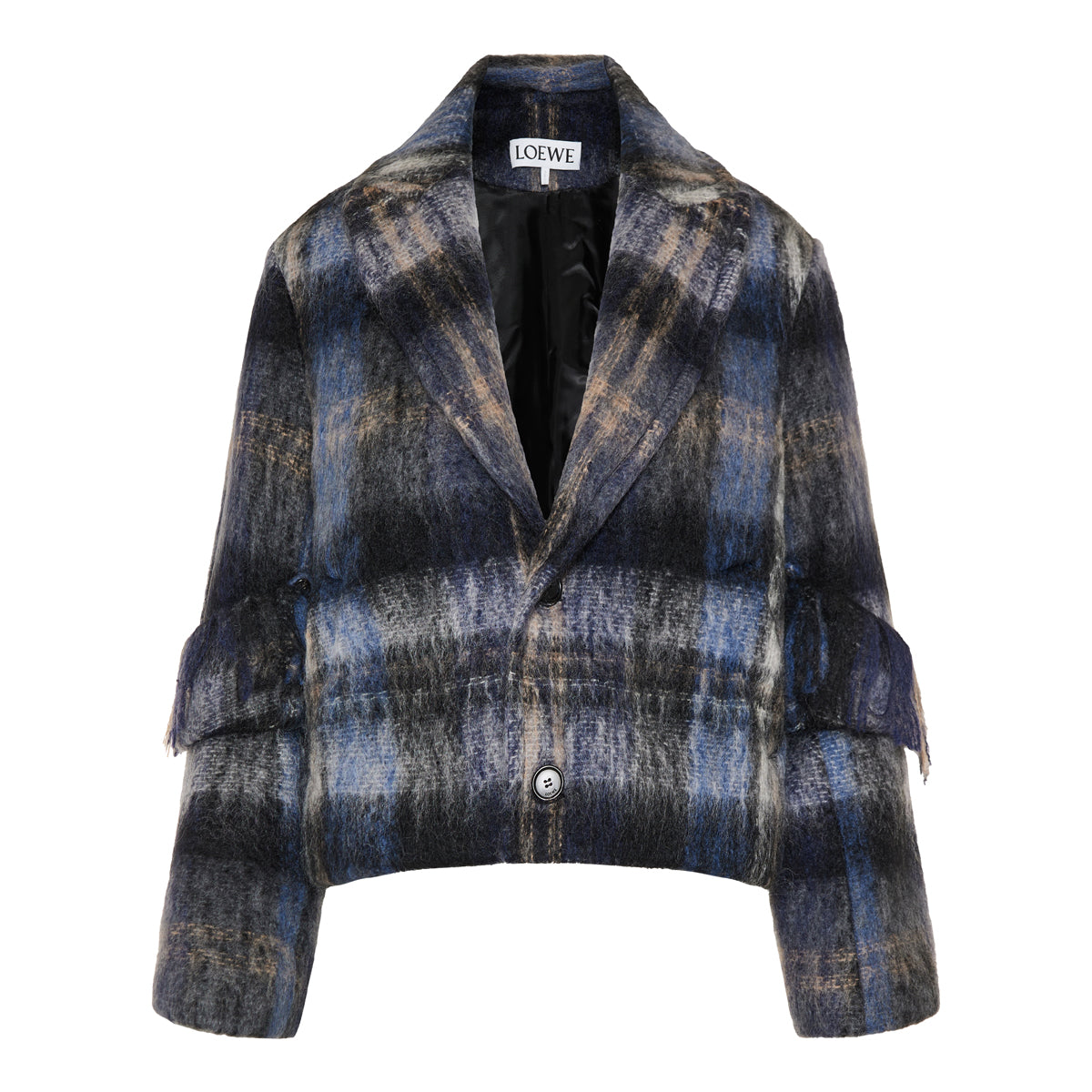 This Loewe jacket in a mohair and wool blend showcases the house’s dedication to refined craftsmanship and contemporary design. The brushed texture lends softness and warmth, while its structured silhouette and clean lines create a polished outerwear staple. Ideal for both daytime layering and evening elegance, it embodies understated luxury with modern edge.