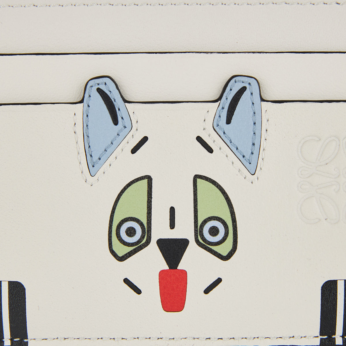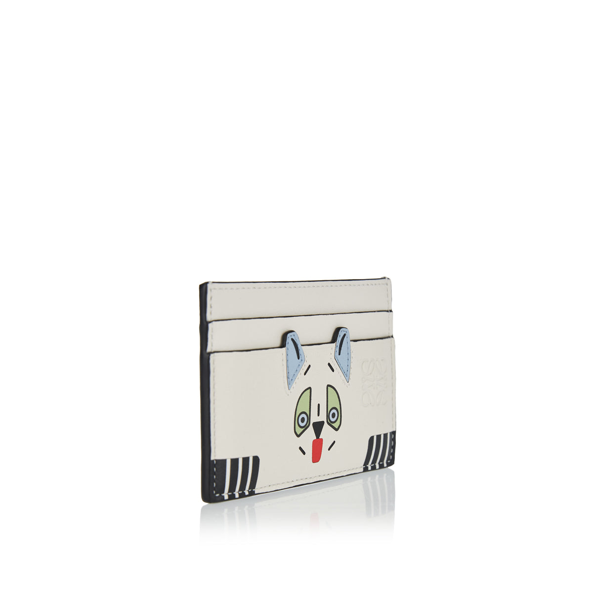 Loewe Futurist Cat cardholder in classic calfskin with leather‑marquetry cat motif and printed reverse lettering—luxury small‑leather good with artistic flair.